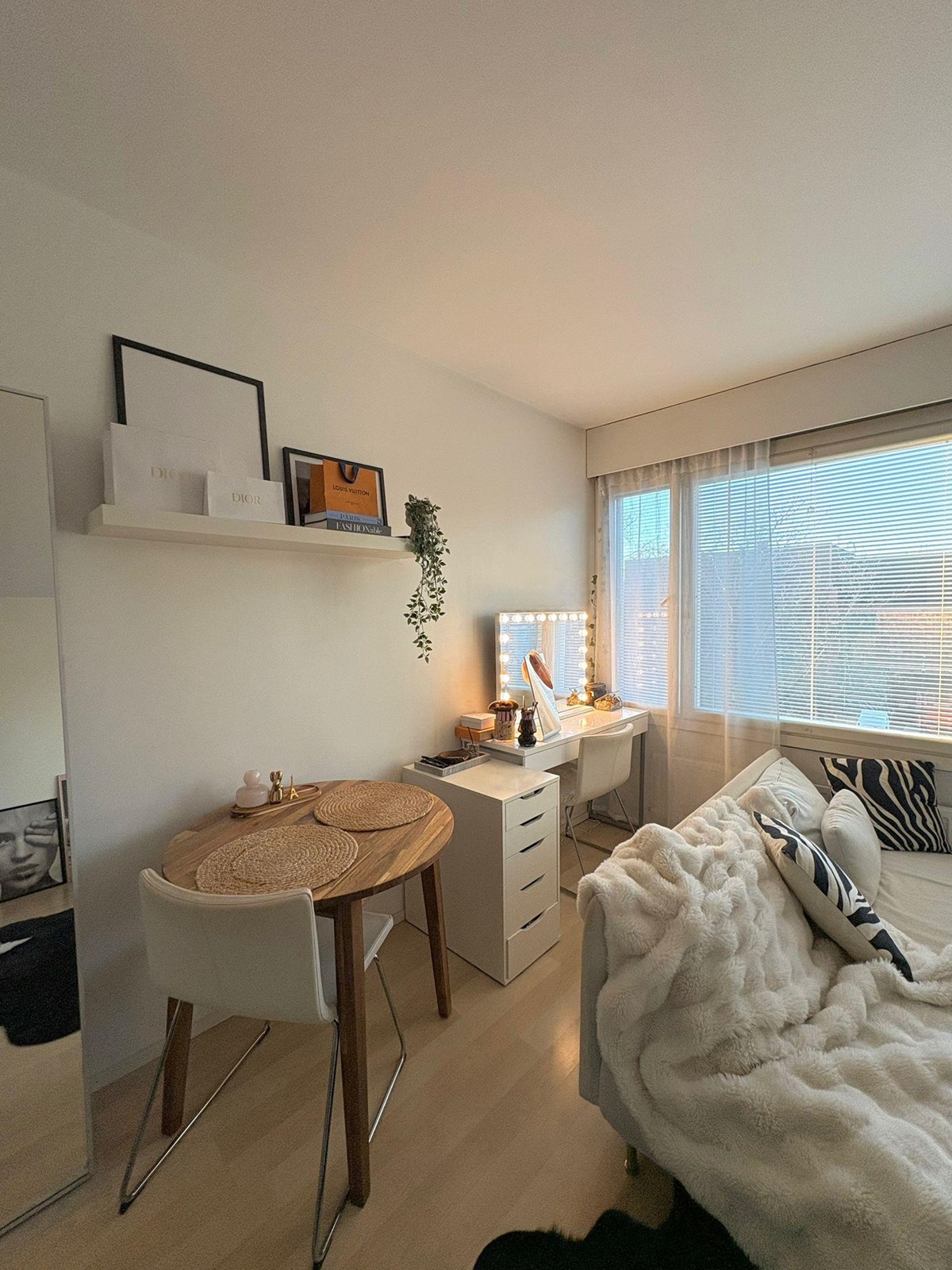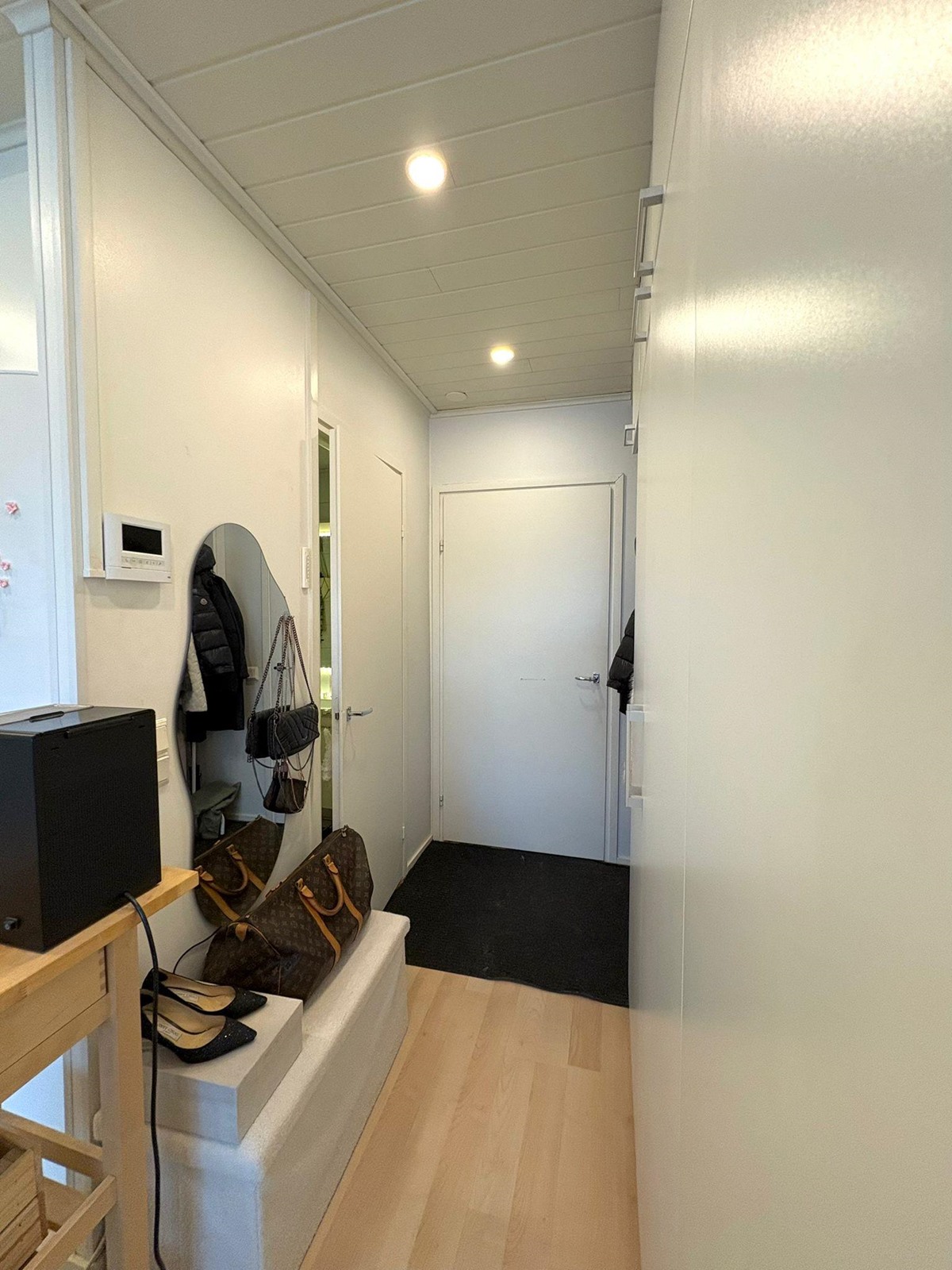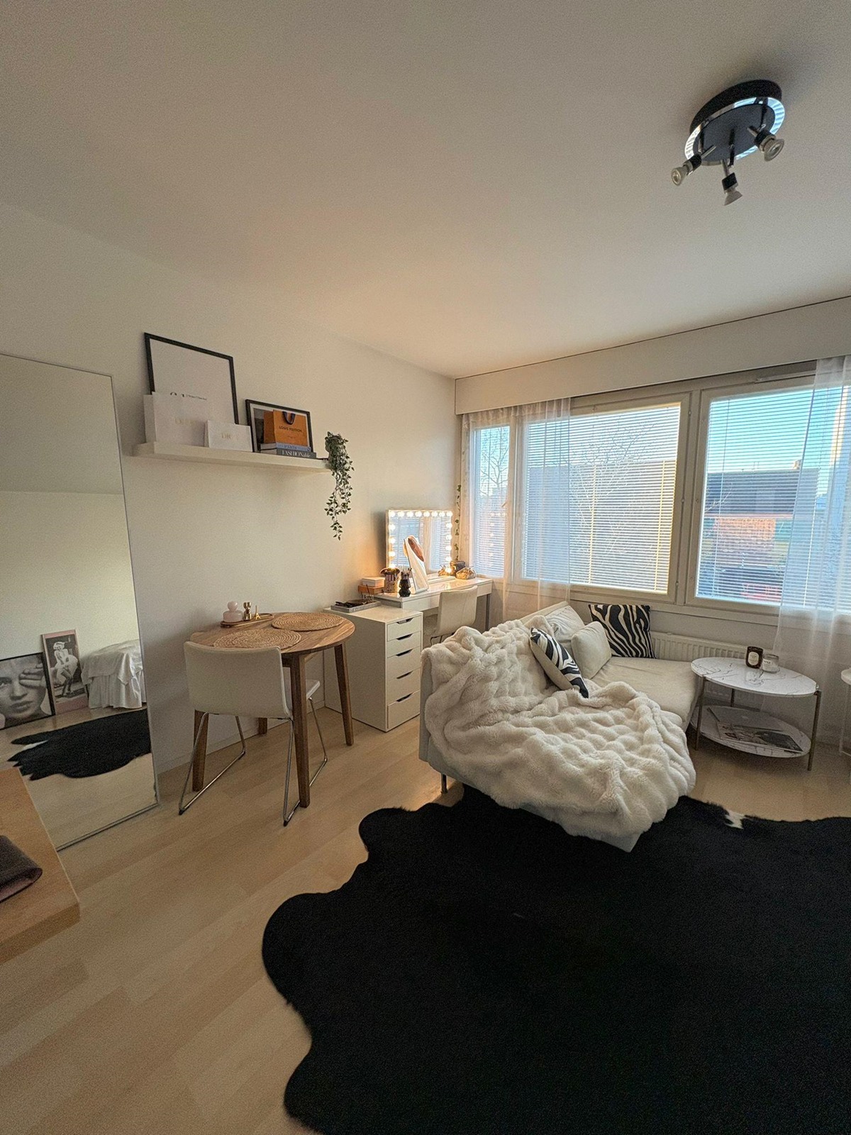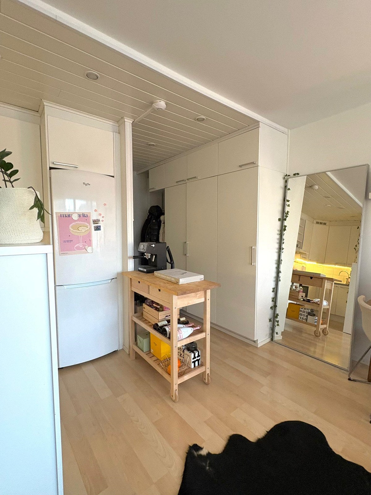 Asunnon 27,5 neliömetriä on jaettu käytännöllisesti yhteen huoneeseen, keittokomeroon ja kylpyhuoneeseen. Tyylikäs vaalea laminaattilattia ja valkoiset maalatut seinät korostavat tilan valoisuutta. Keittiössä on runsaasti kaappitilaa, jääkaappipakastin ja lattialiesi. Kylpyhuone on uusittu putkiremontin yhteydessä ja siellä on pesukoneliitäntä. Eteiskäytävän isot kaapistot tuovat lisää säilytystilaa. Lisäksi yläkerrassa on käytettävissä ilmainen pesutupa.