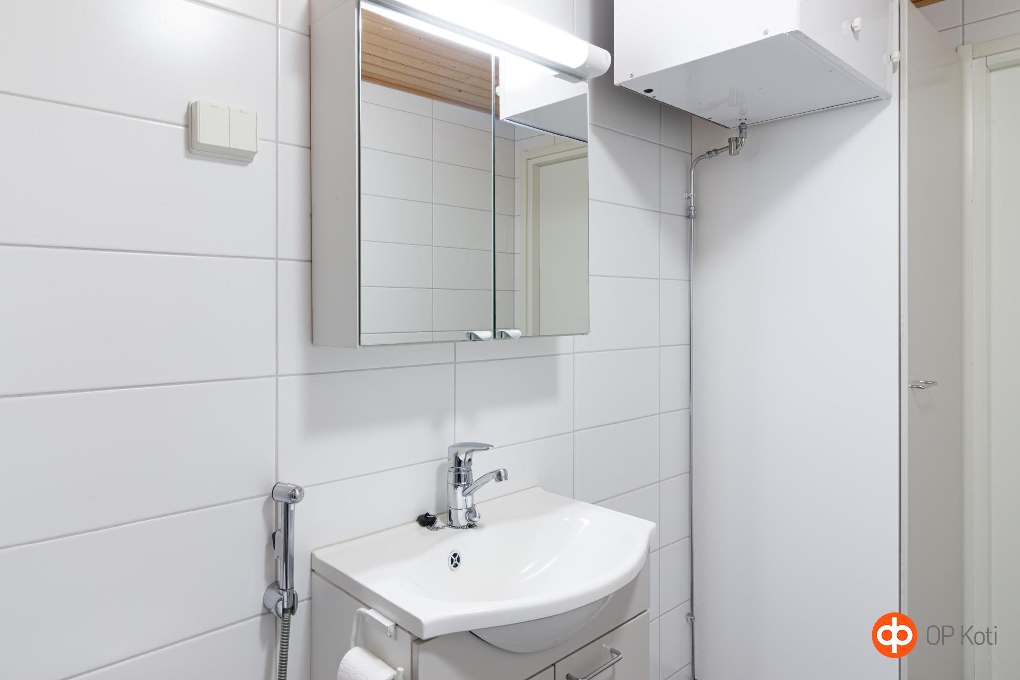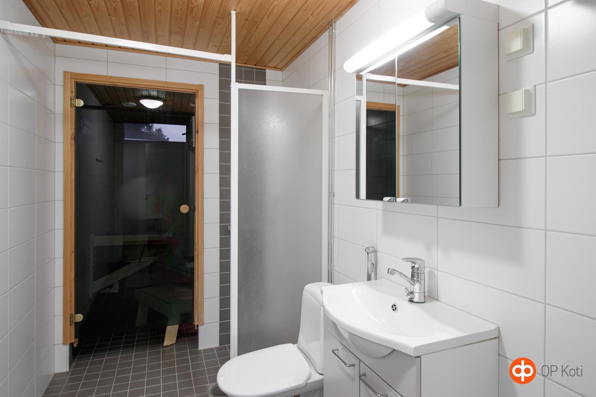 - Sauna, sähkökiuas, kylpyhuone, suihku, suihkuseinä, peilikaappi, kaapit, allaskaappi, pesukoneliitäntä, lattialämmitys, kiinteät valaisimet.