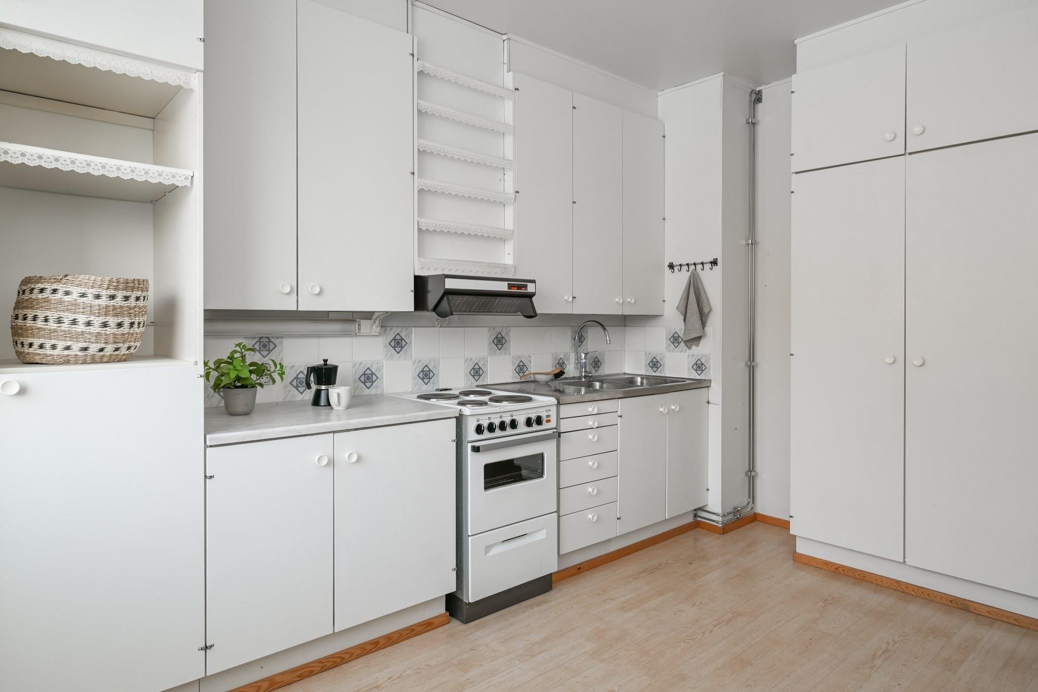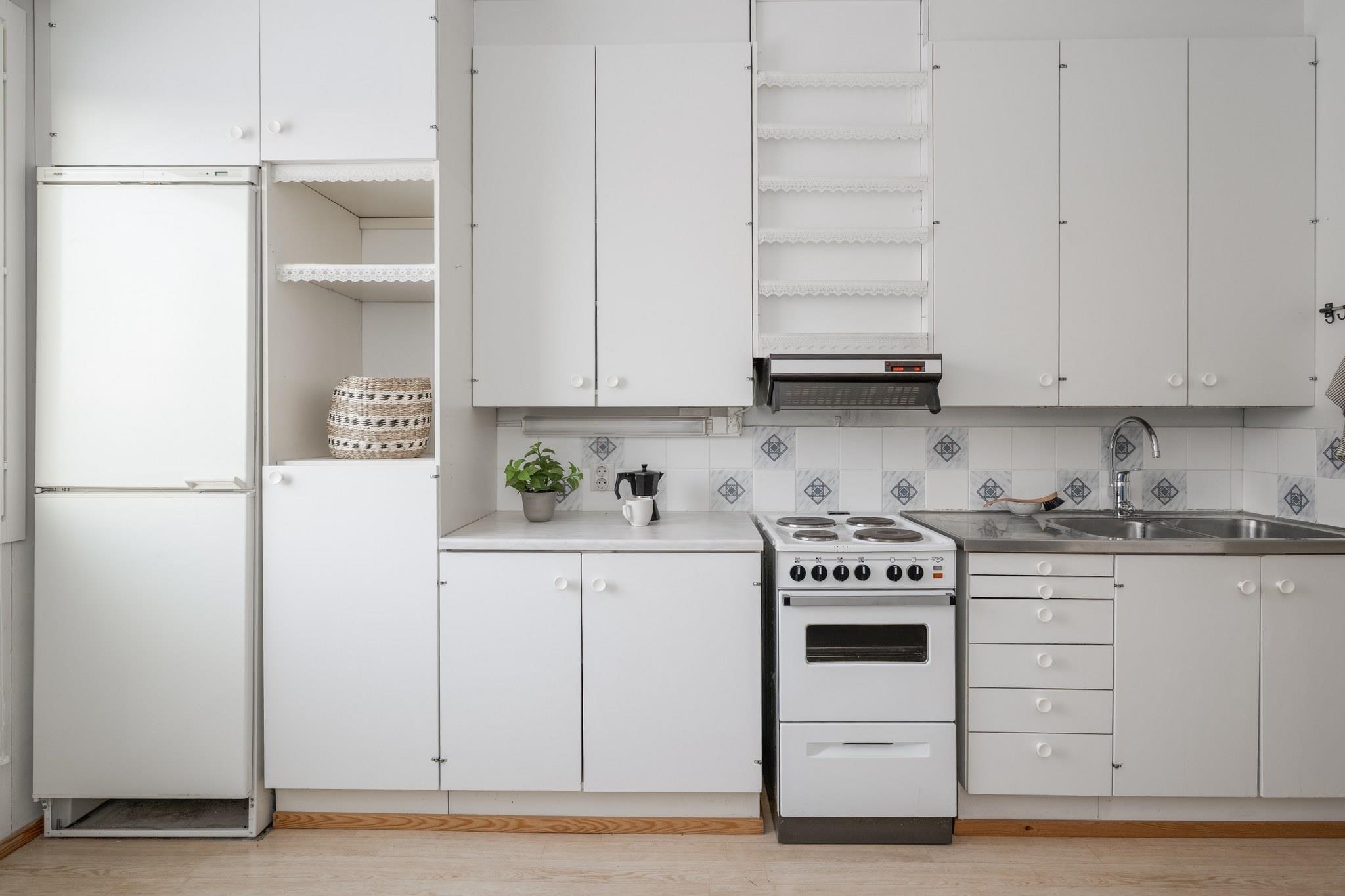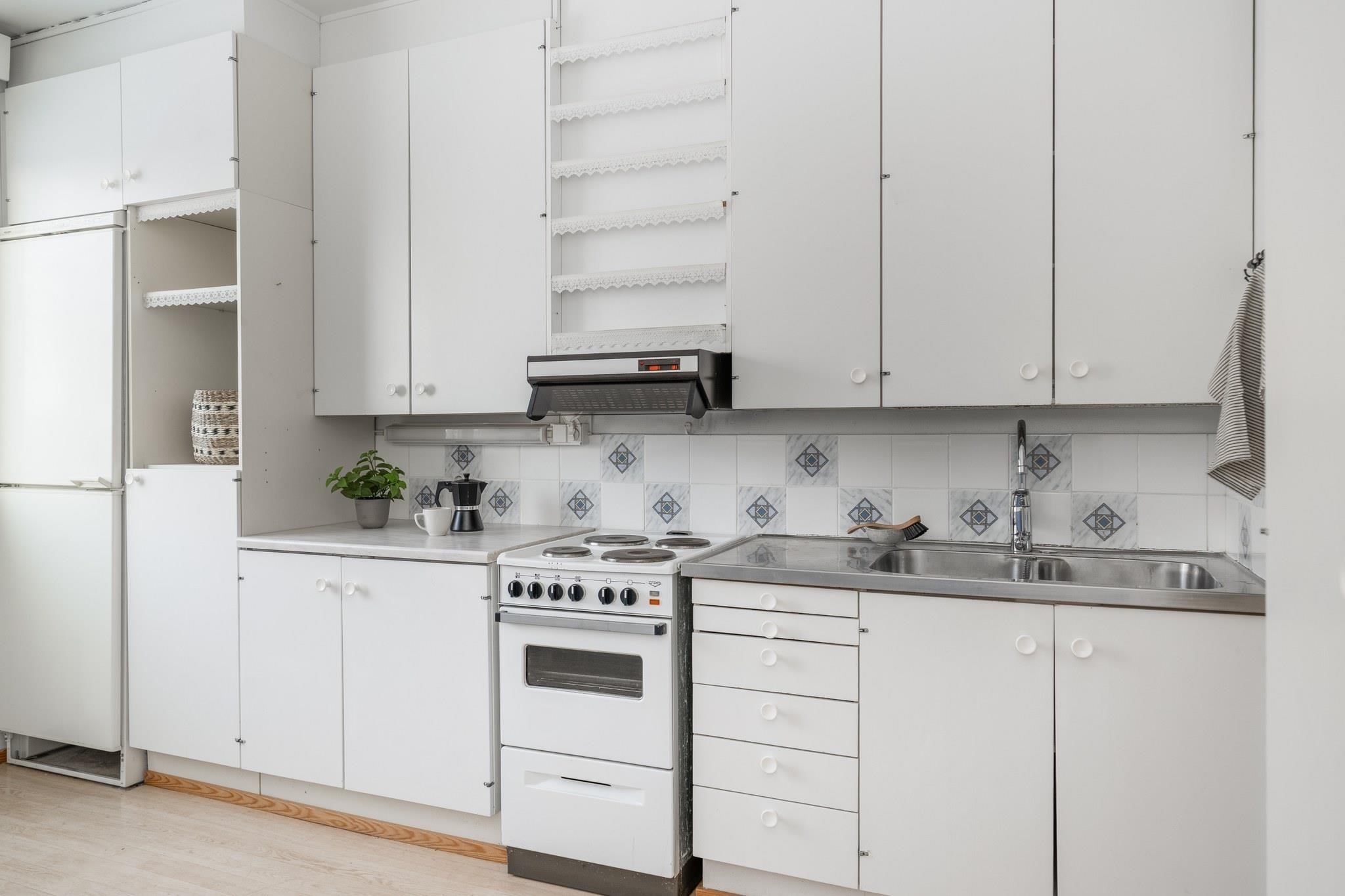 - Jääkaappipakastin, sähköliesi, liesituuletin, kaapistot, kiinteät valaisimet.