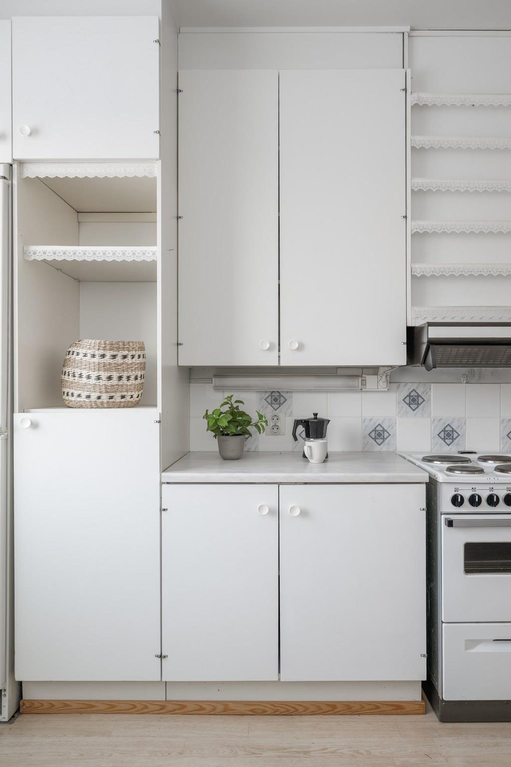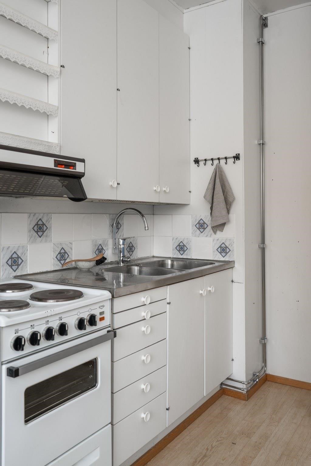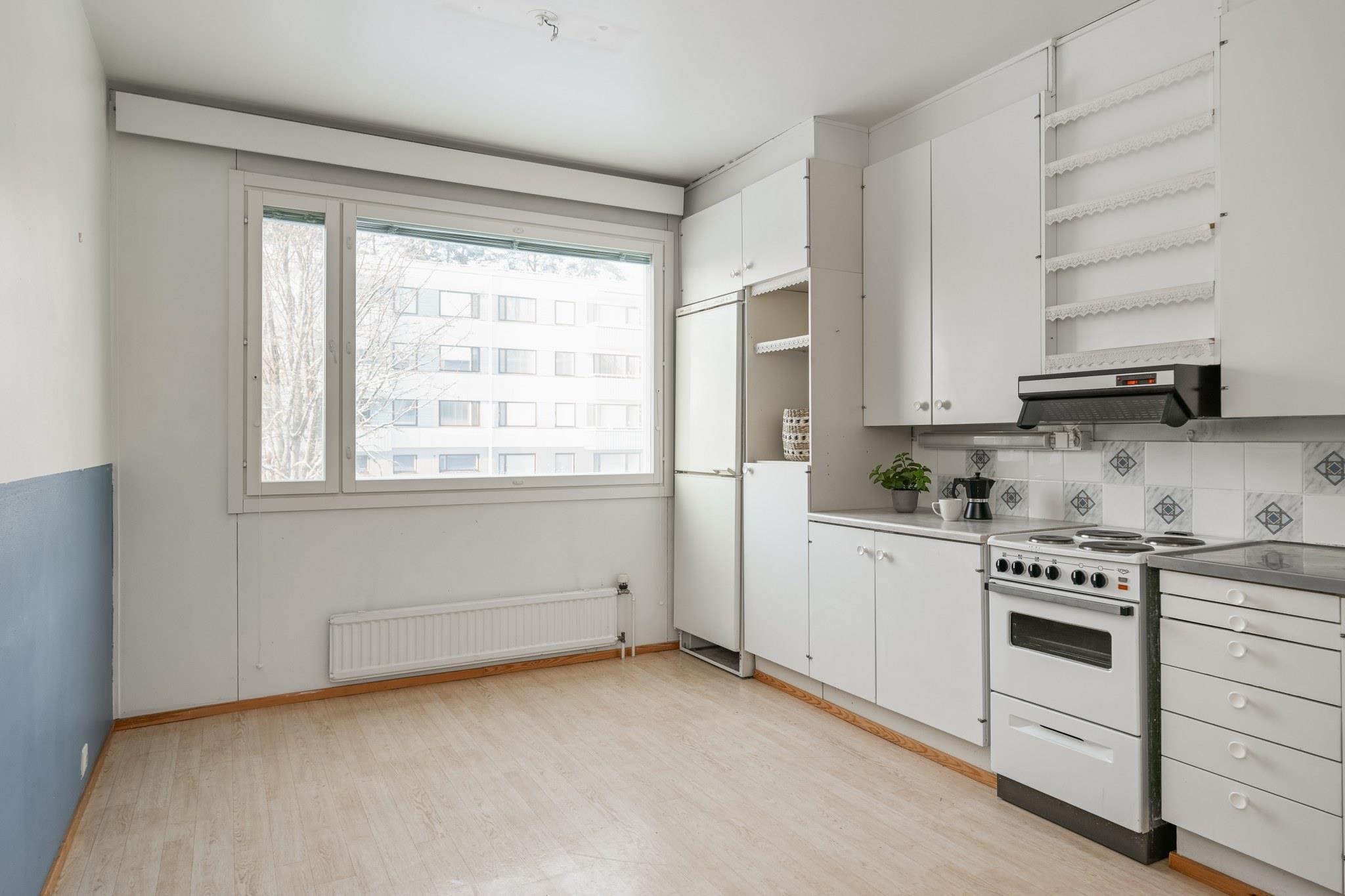- Jääkaappipakastin, sähköliesi, liesituuletin, kaapistot, kiinteät valaisimet.