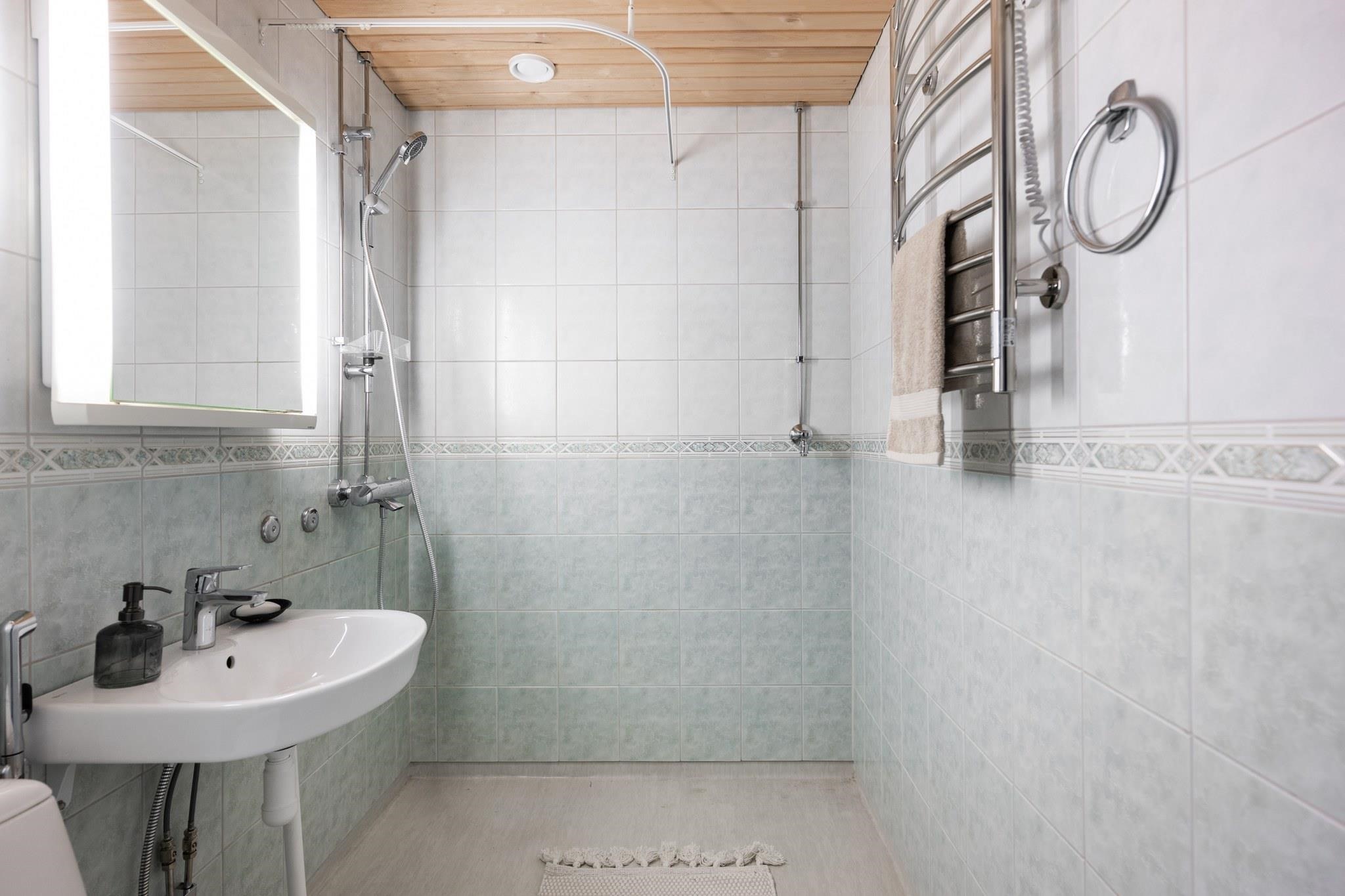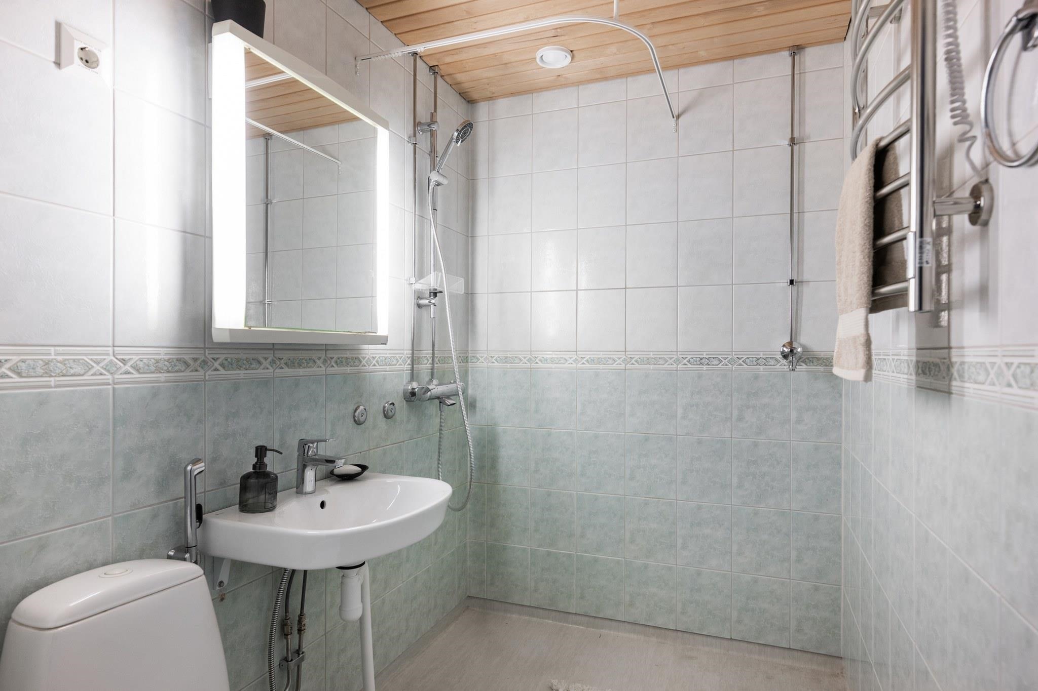 - Kylpyhuone, suihku, peilit, pesukoneliitäntä, lattialämmitys, kiinteät valaisimet. Pyyhekuivain