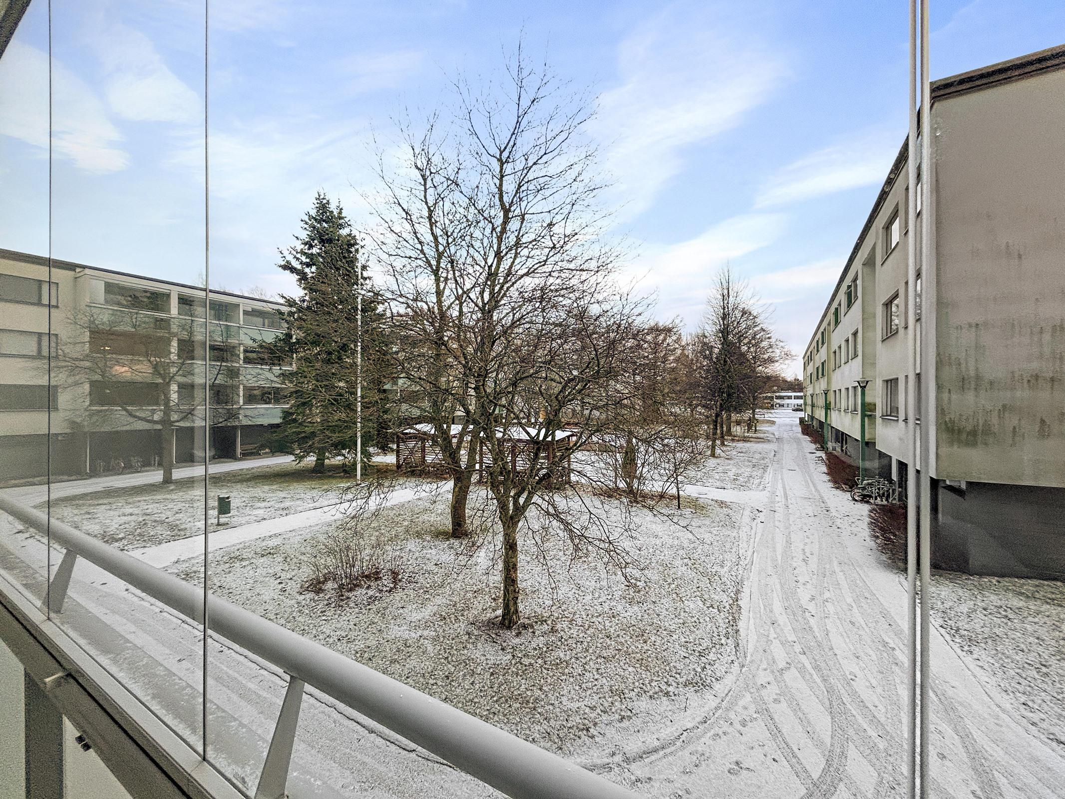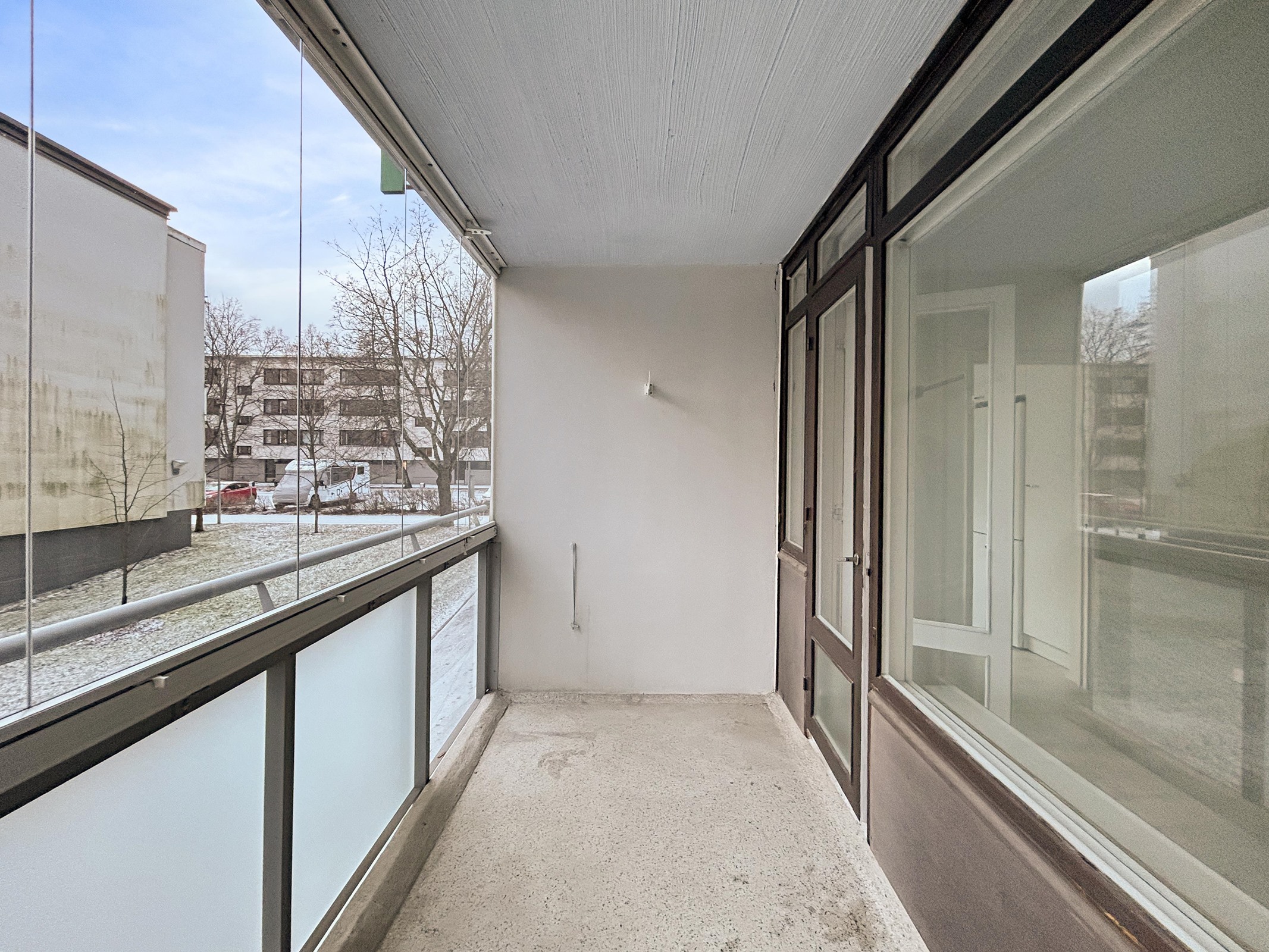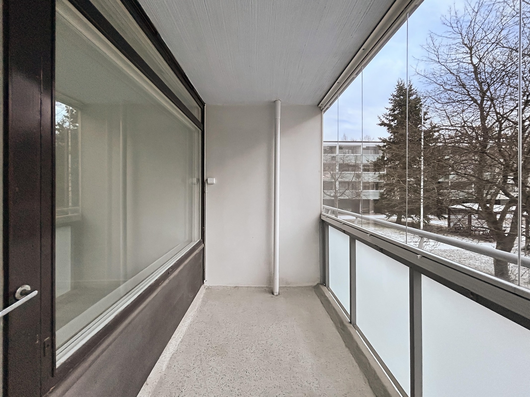 Pohjaratkaisu on toimiva: erillinen keittiö tarjoaa hyvin tilaa myös ruokapöydälle, ja oleskelutila jatkuu suurelle lasitetulle parvekkeelle, joka tuo tiilantuntua ja mahdollisuuden nauttia valosta pitkälle syksyyn.