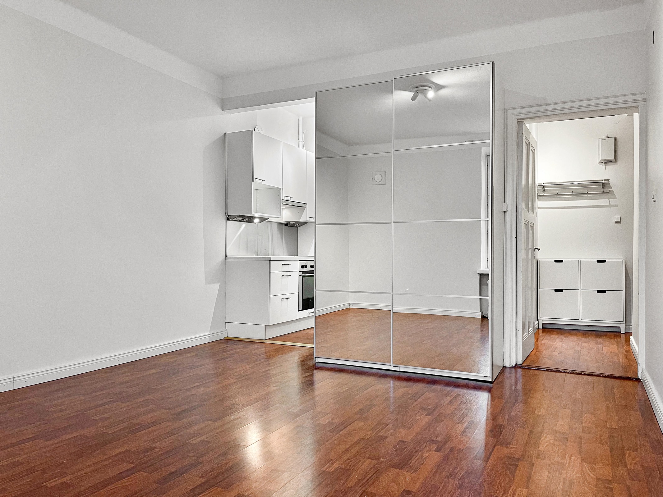 Olohuone: Lattia parketti, seinät maalattu. Keittiö: Lattia laatoitettu, seinät maalattu. Kylpyhuone: Laatoitettu.