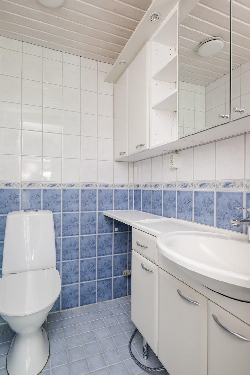 - Sauna, sähkökiuas (2021), kylpyhuone, erillinen wc (ylä-ja alakerrassa), suihku, peilit (yläkerran wc:ssä sekä allaskaappi), peilikaappi (alkerran wc.ssä sekä allaskaappi+ kaapit), pesukoneliitäntä (kylpyhuoneessa alakerrassa), lattialämmitys (vesikiertoinen kaukolämpö), kiinteät valaisimet.