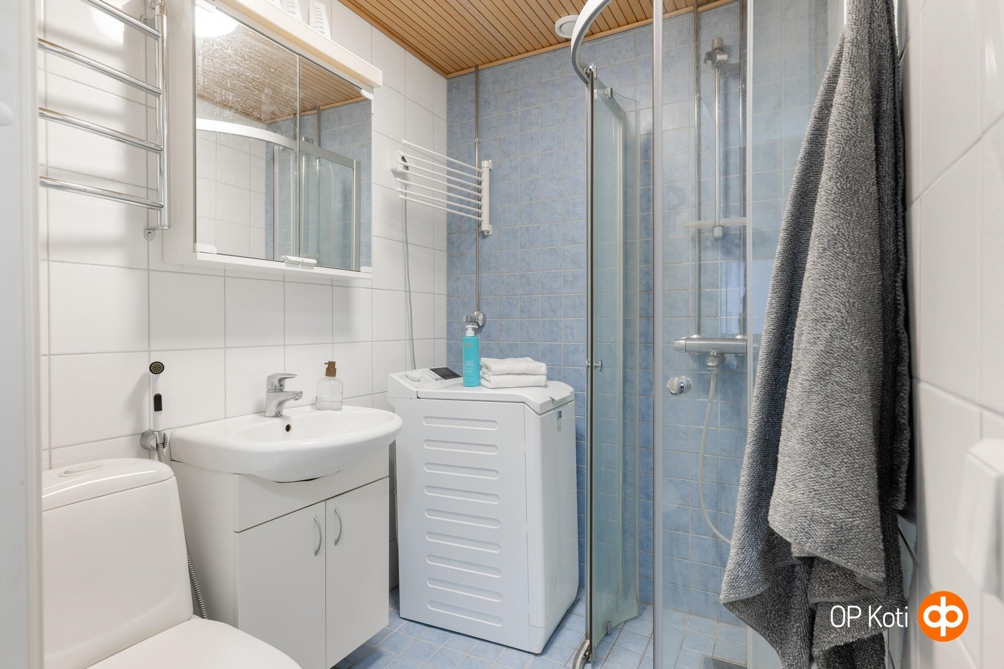 - Kylpyhuone, suihku, suihkukaappi, peilikaappi, allaskaappi, kiinteät valaisimet.