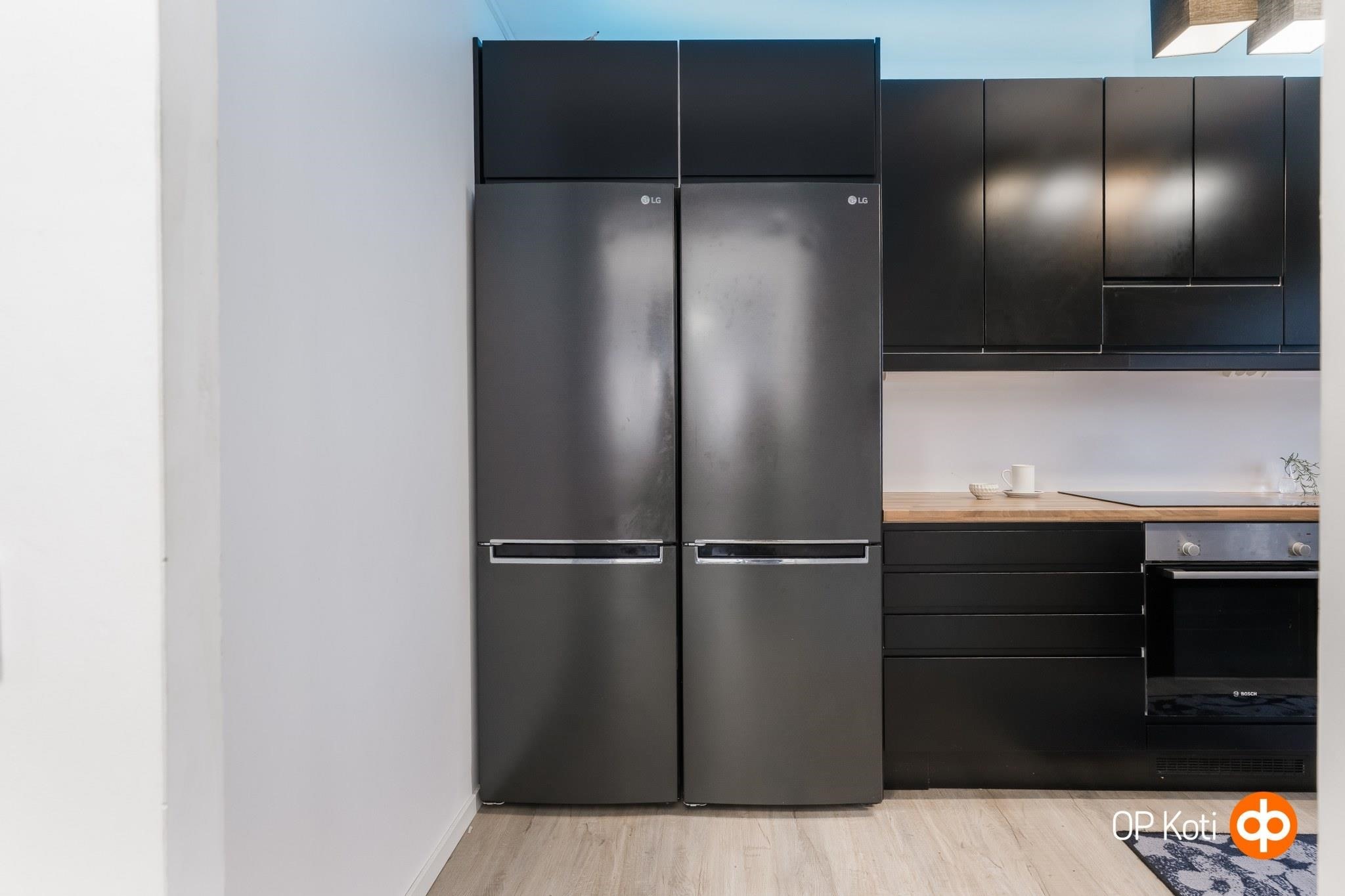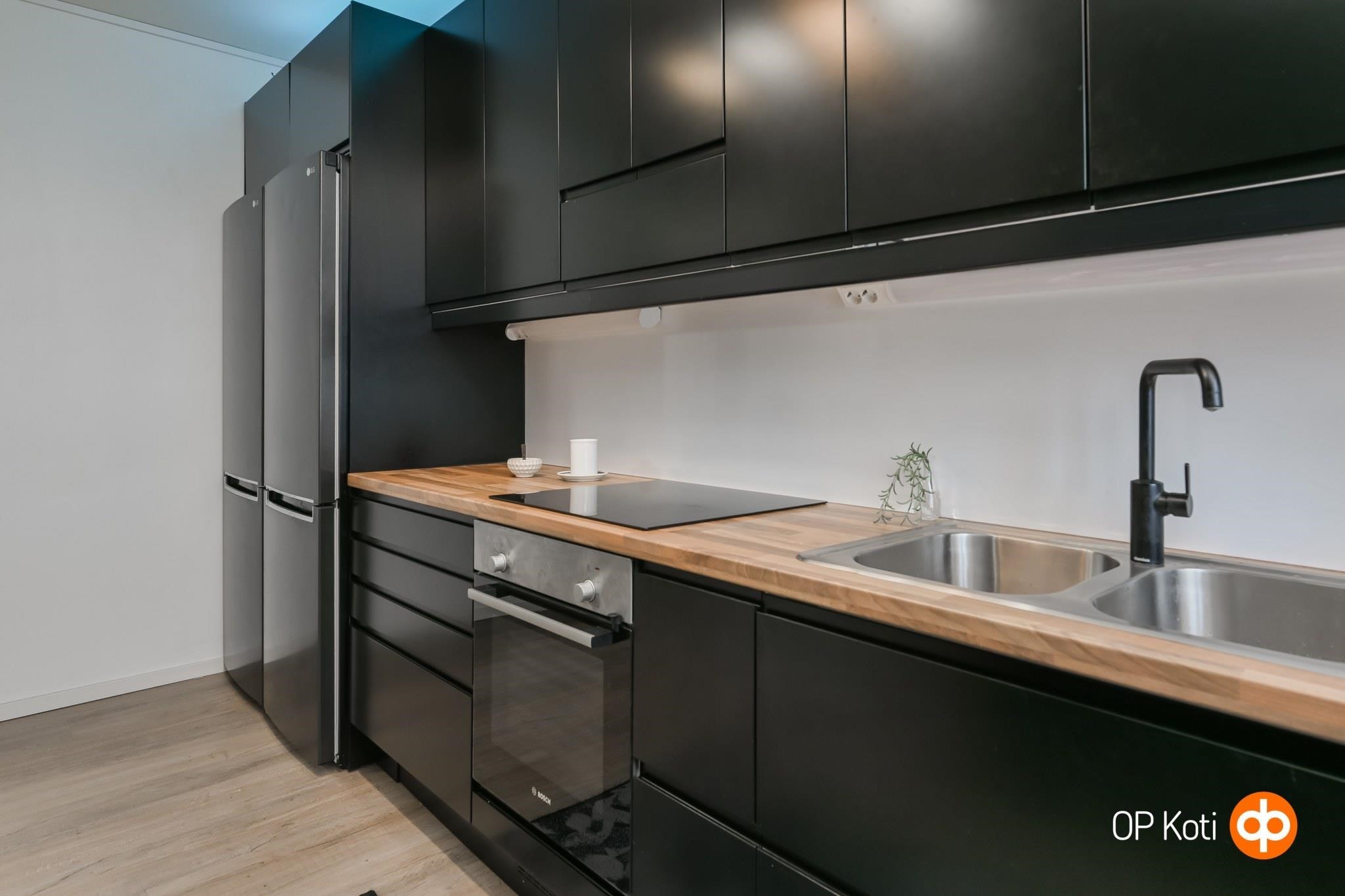 - Jääkaappi, pakastekaappi, induktioliesi, liesituuletin, astianpesukone, kaapistot, kiinteät valaisimet.