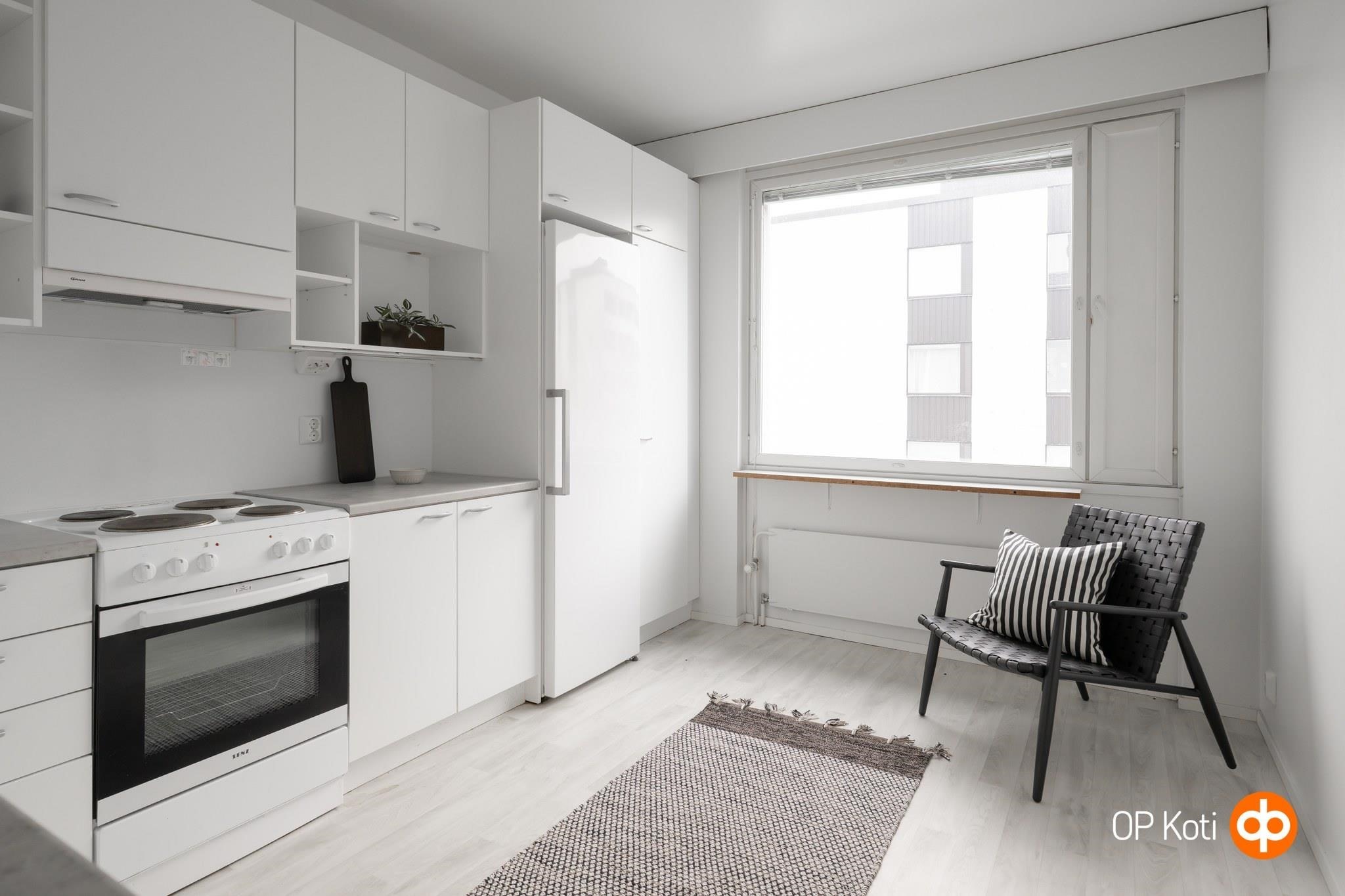 Valoisa 4. kerroksen kulmahuoneisto, jonka keittiö remontoitu 2022. Lasitetulta parvekkeelta rauhaisat näkymät. Hissitalo ja asuntoon on esteetön kulku.