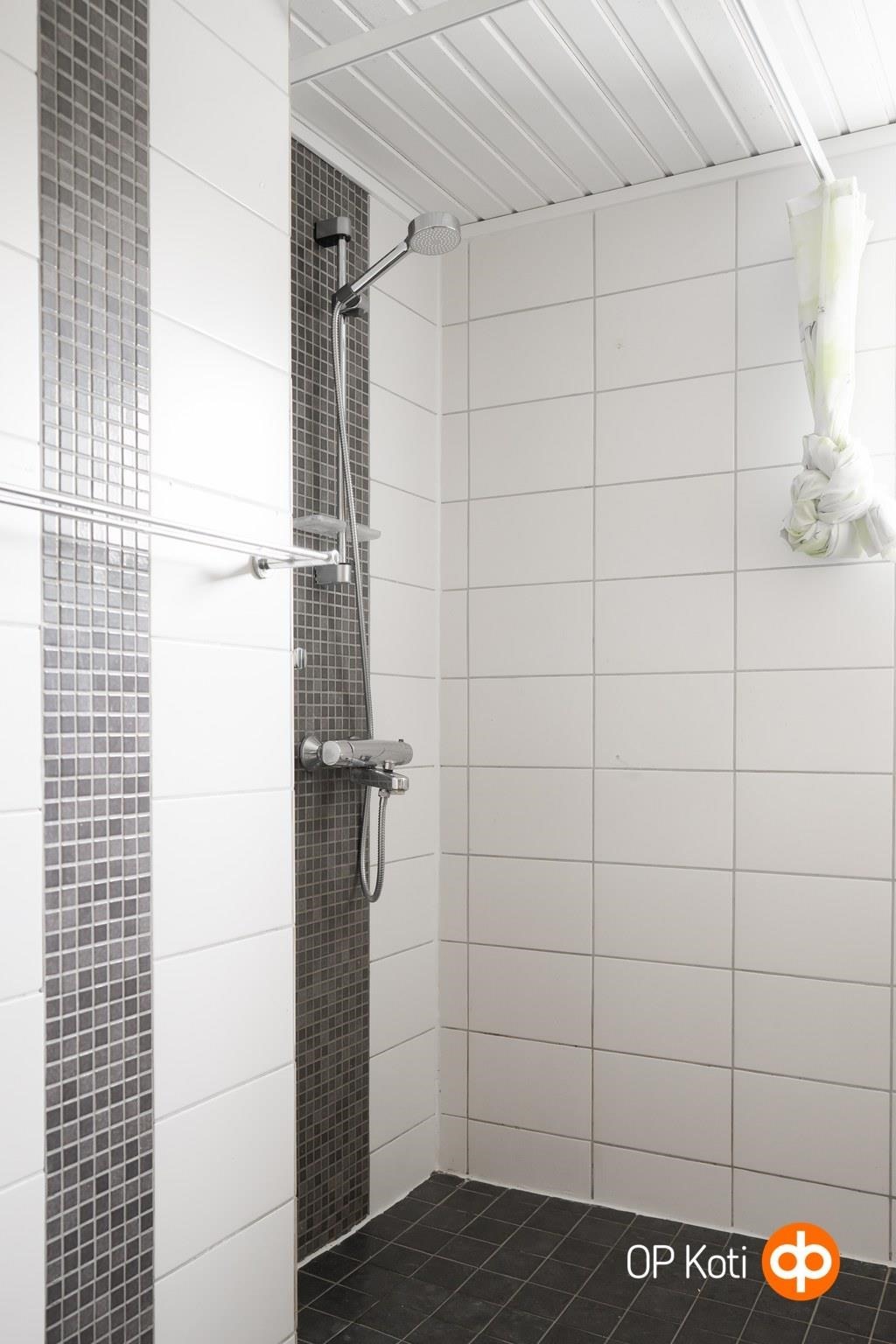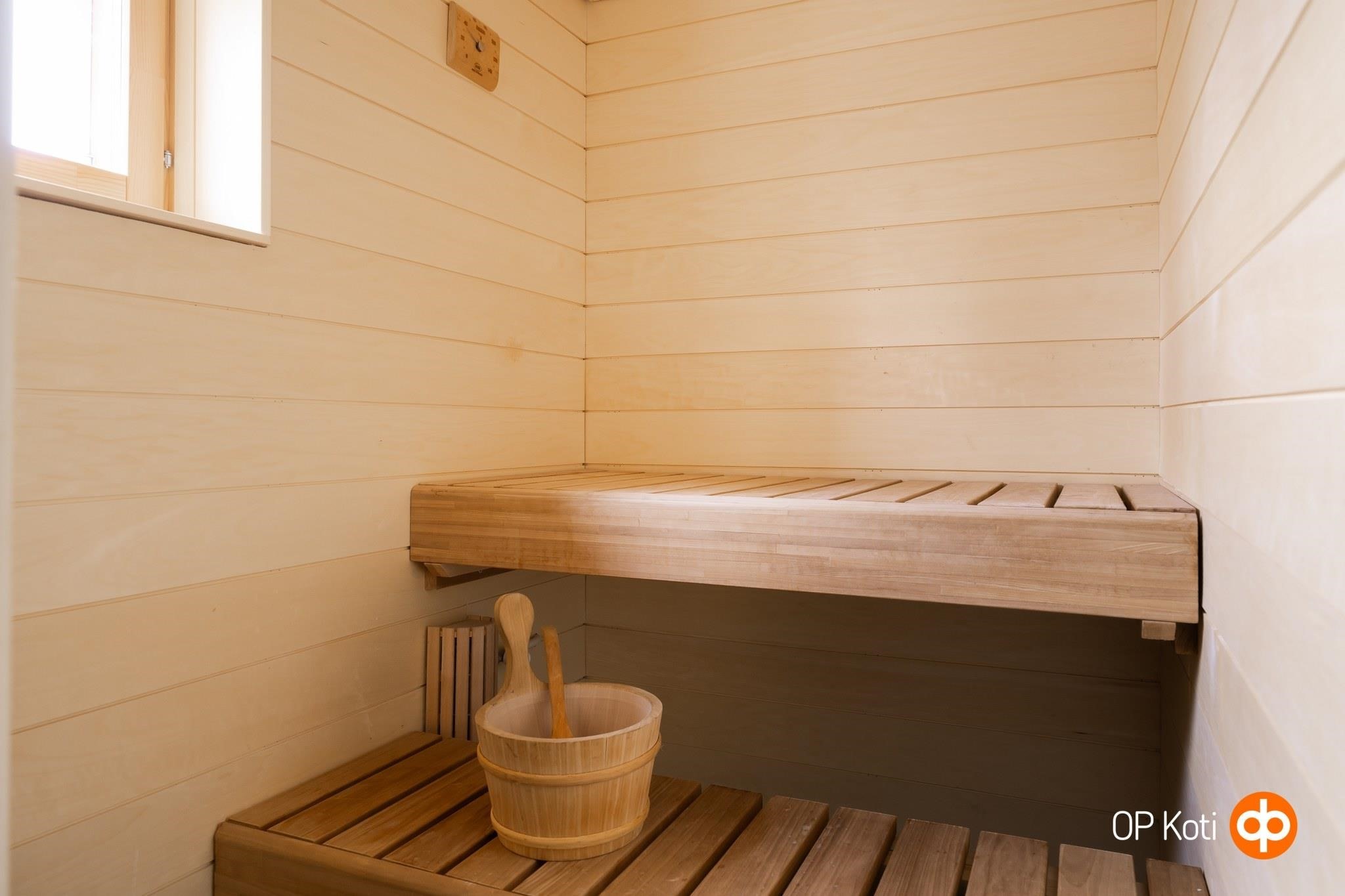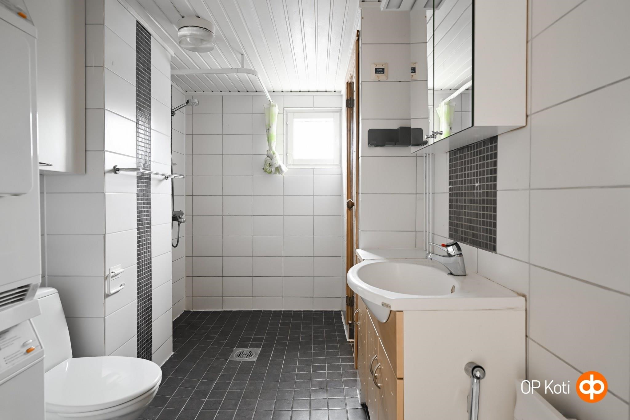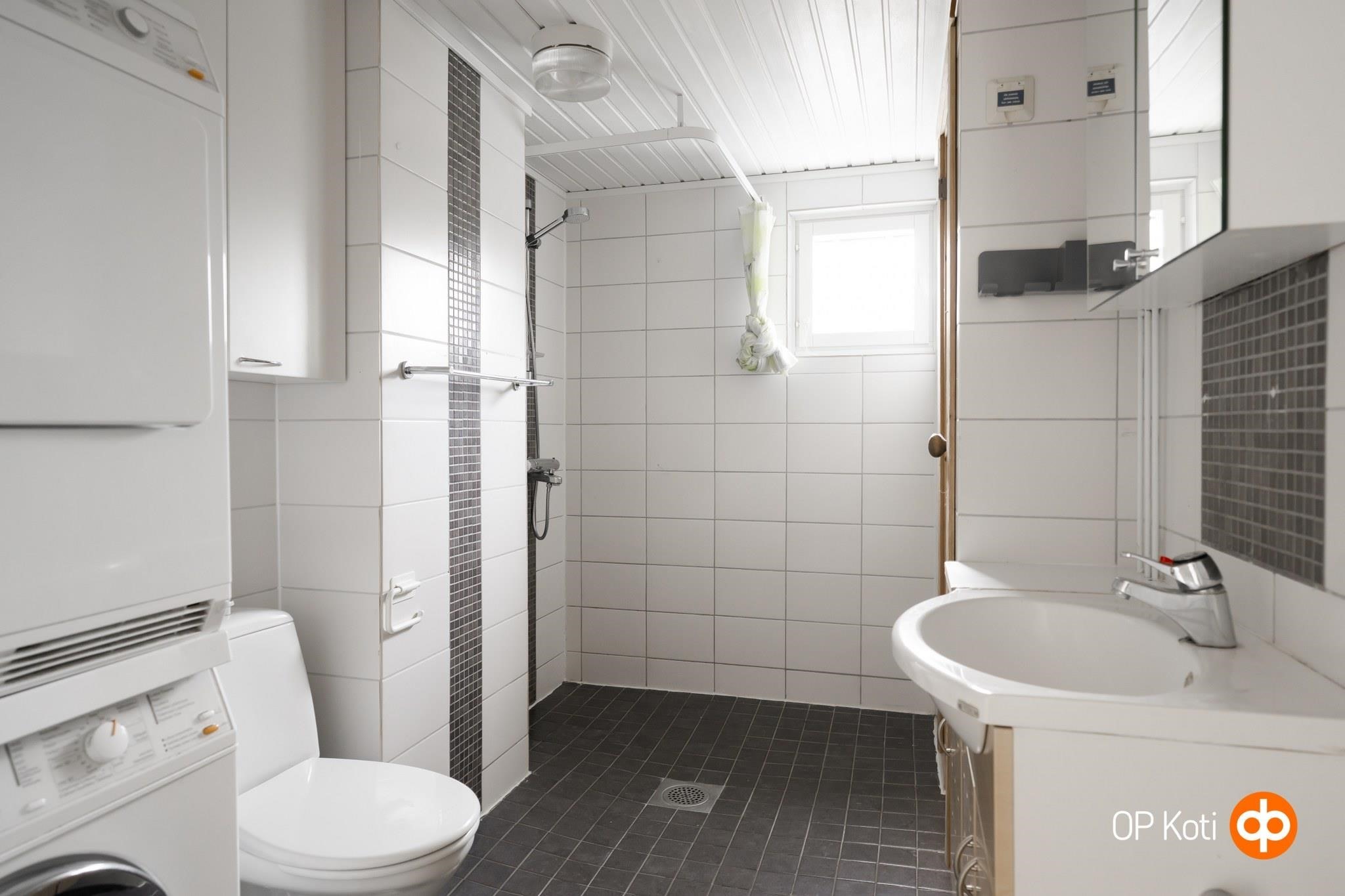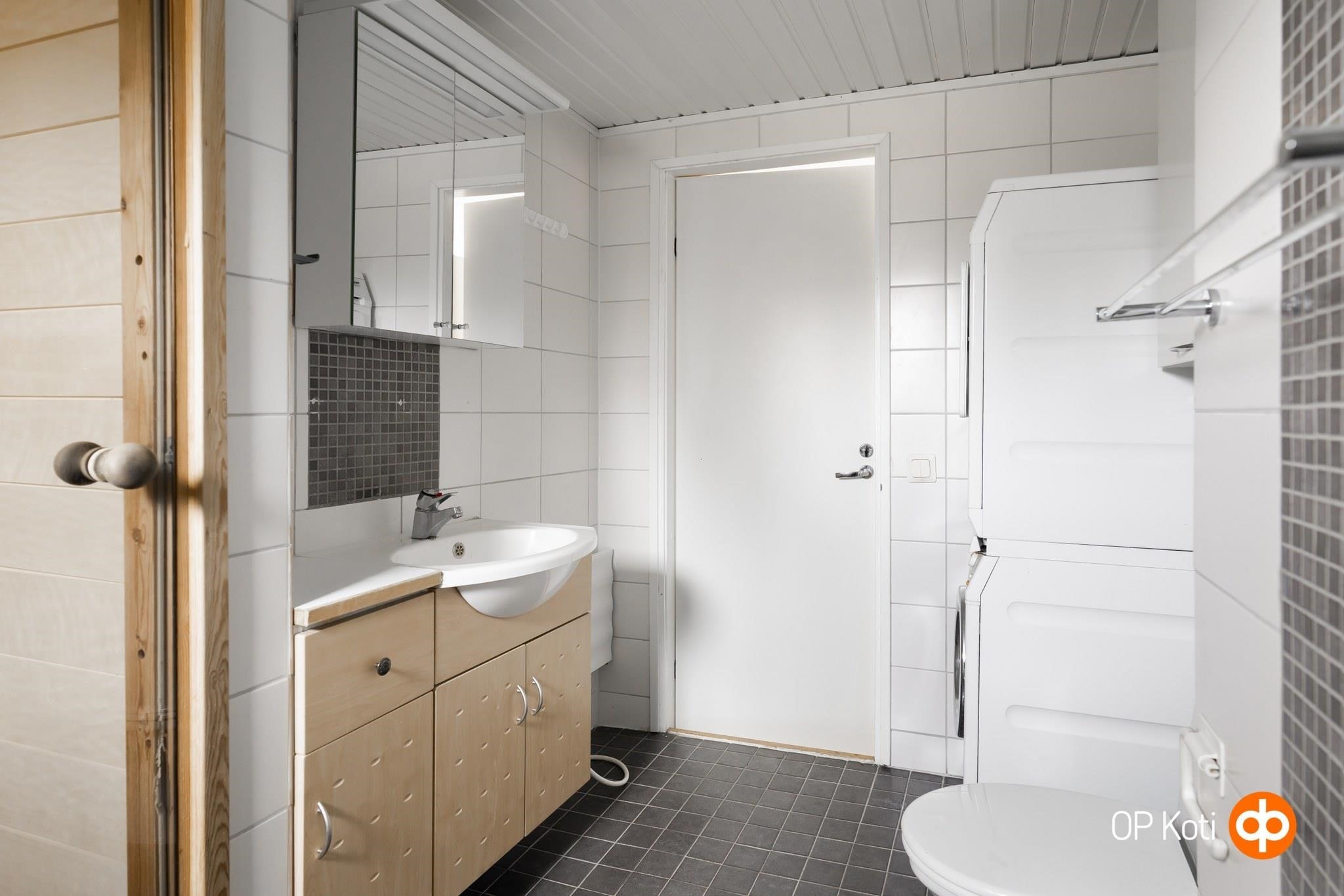 - Sauna, sähkökiuas, kylpyhuone, suihku, peilikaappi, kaapit, allaskaappi, pesukoneliitäntä, kiinteät valaisimet.