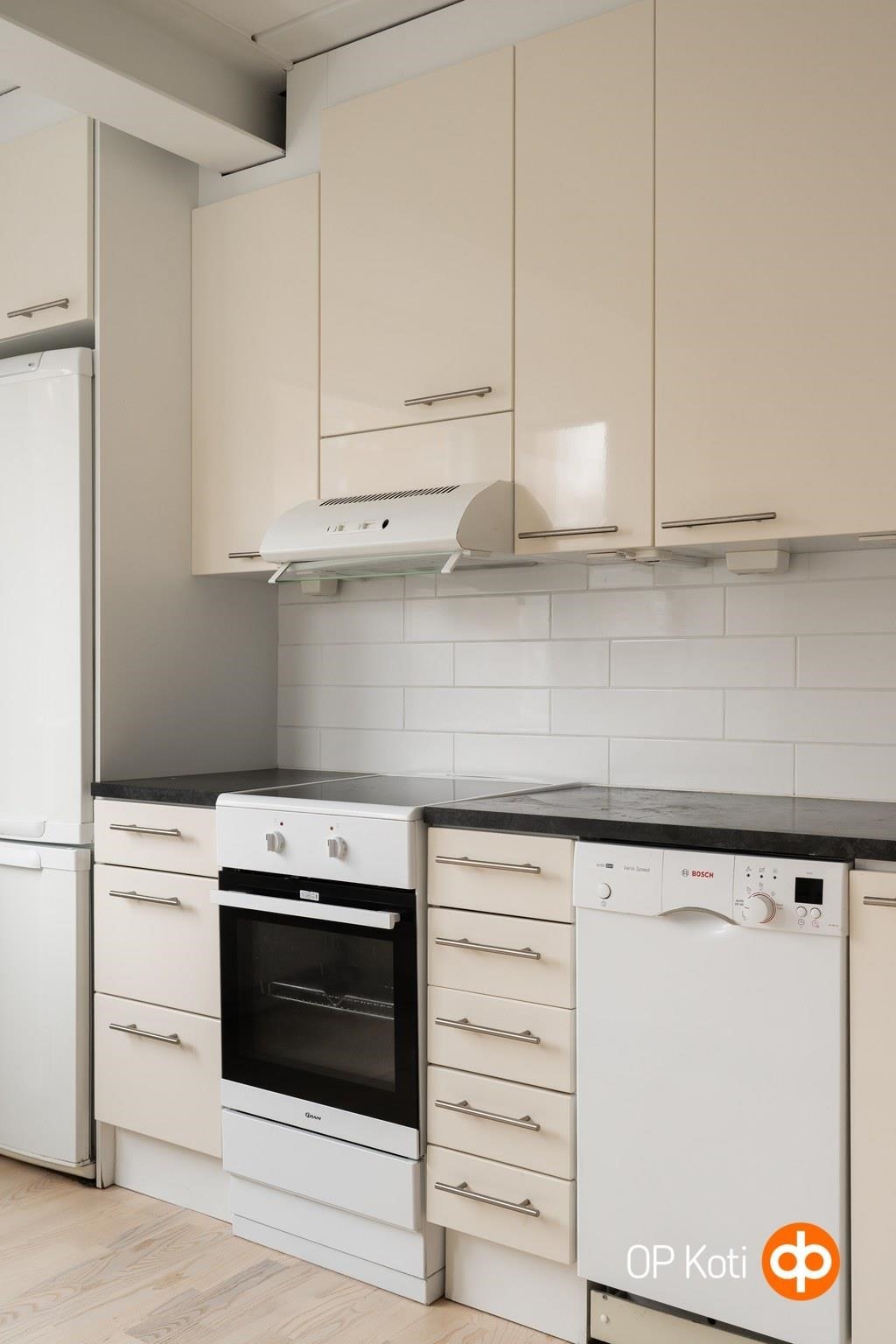 - Jääkaappipakastin, induktioliesi, liesituuletin, astianpesukone, kaapistot, irralliset saarekkeet, kiinteät valaisimet. Keittiön tasot: laminaattia.