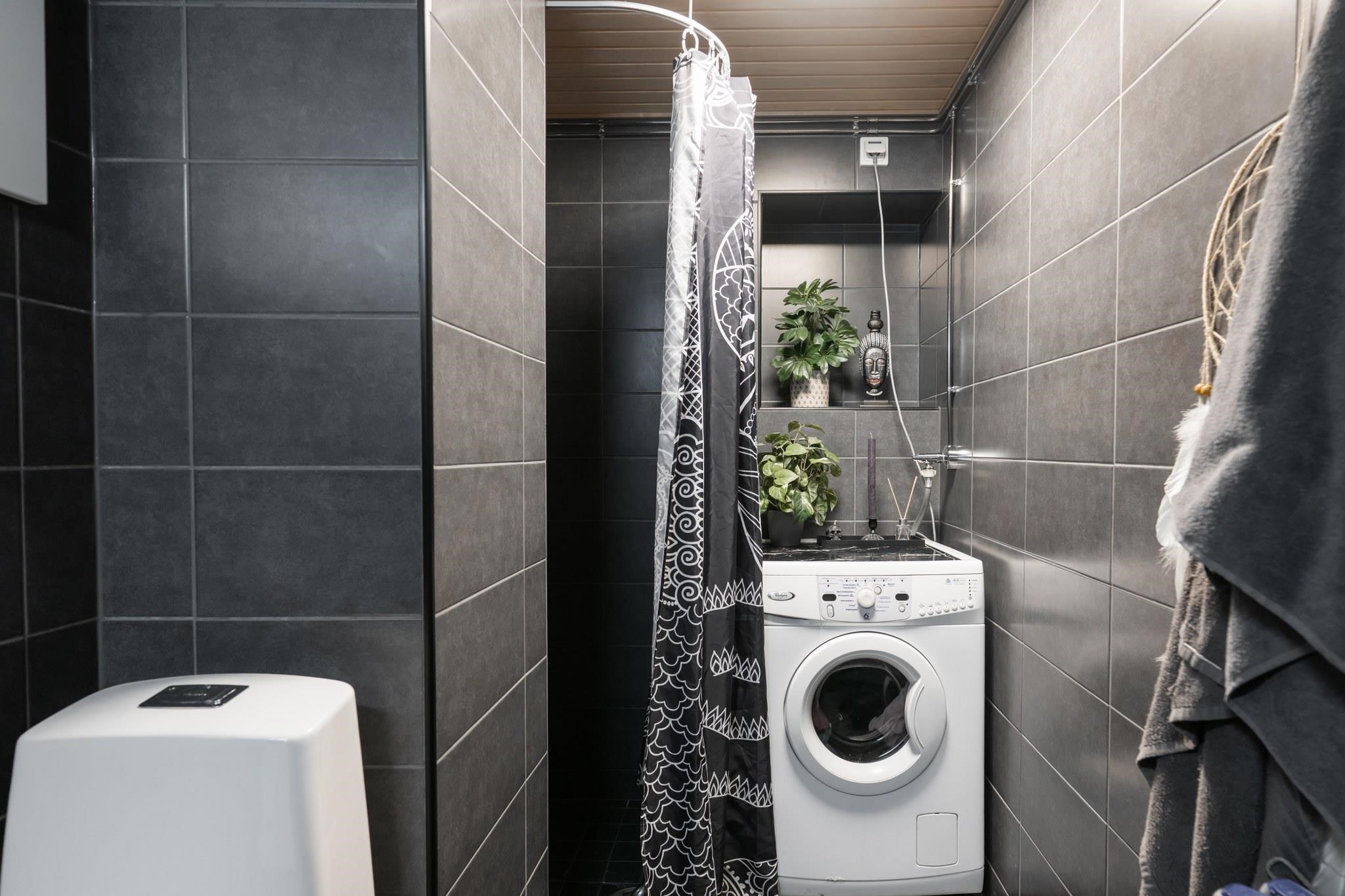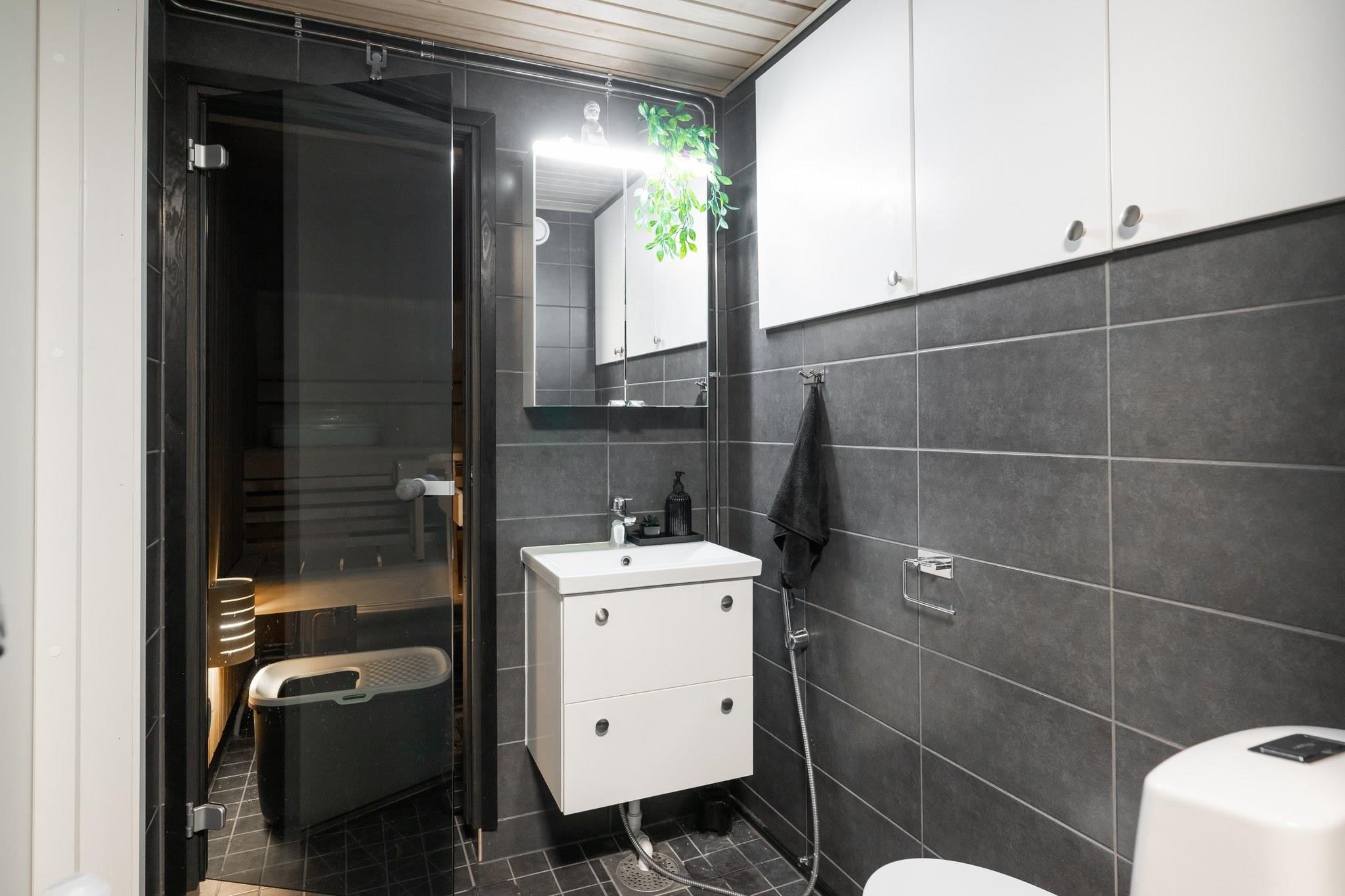 - Sauna, sähkökiuas, kylpyhuone, suihku, peilikaappi, allaskaappi, pesukoneliitäntä, lattialämmitys, kiinteät valaisimet.
