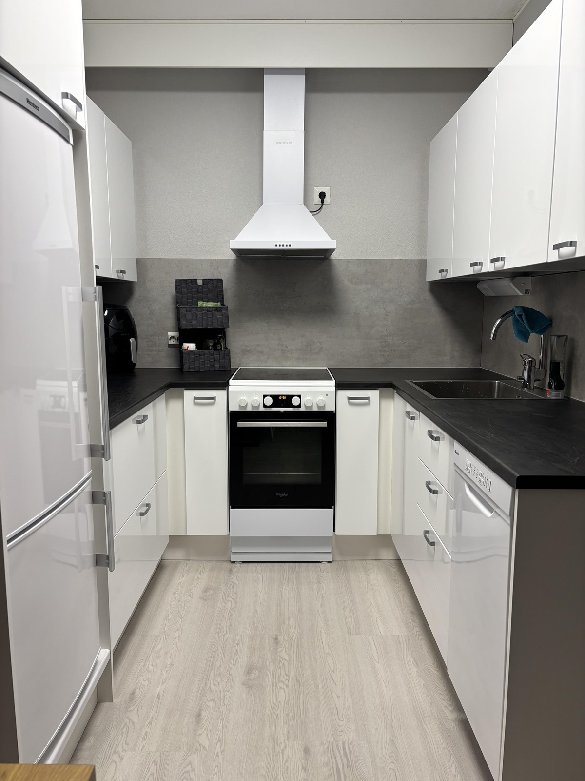 - Jääkaappipakastin, lattialiesi, keraaminen liesi, liesituuletin, astianpesukone, kaapistot, kiinteät valaisimet.