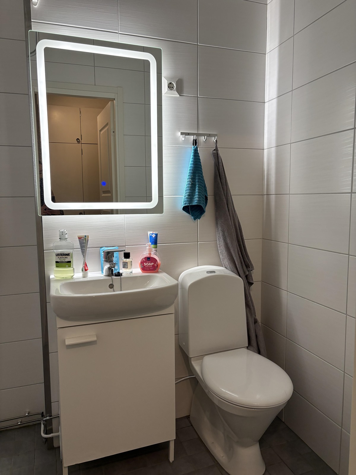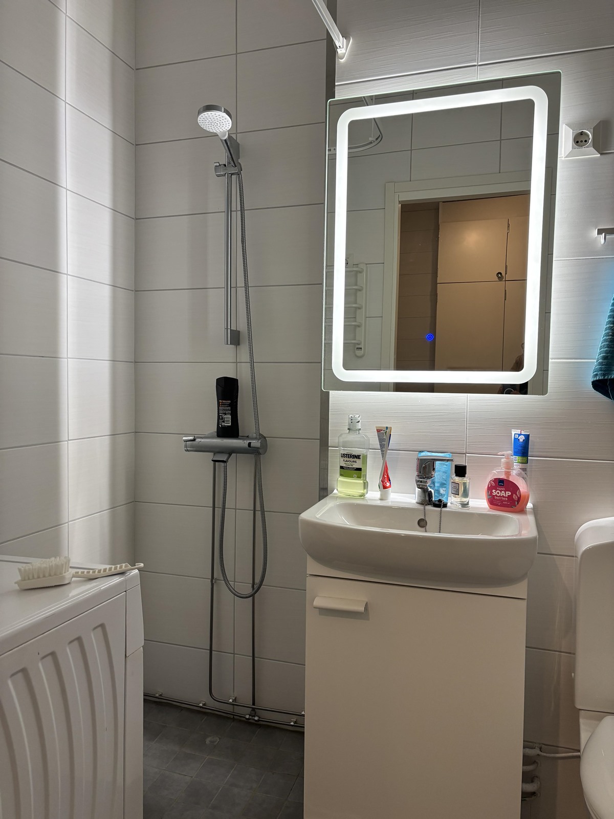 - Kylpyhuone, suihku, peilit, allaskaappi, pesukoneliitäntä, lattialämmitys, kiinteät valaisimet.