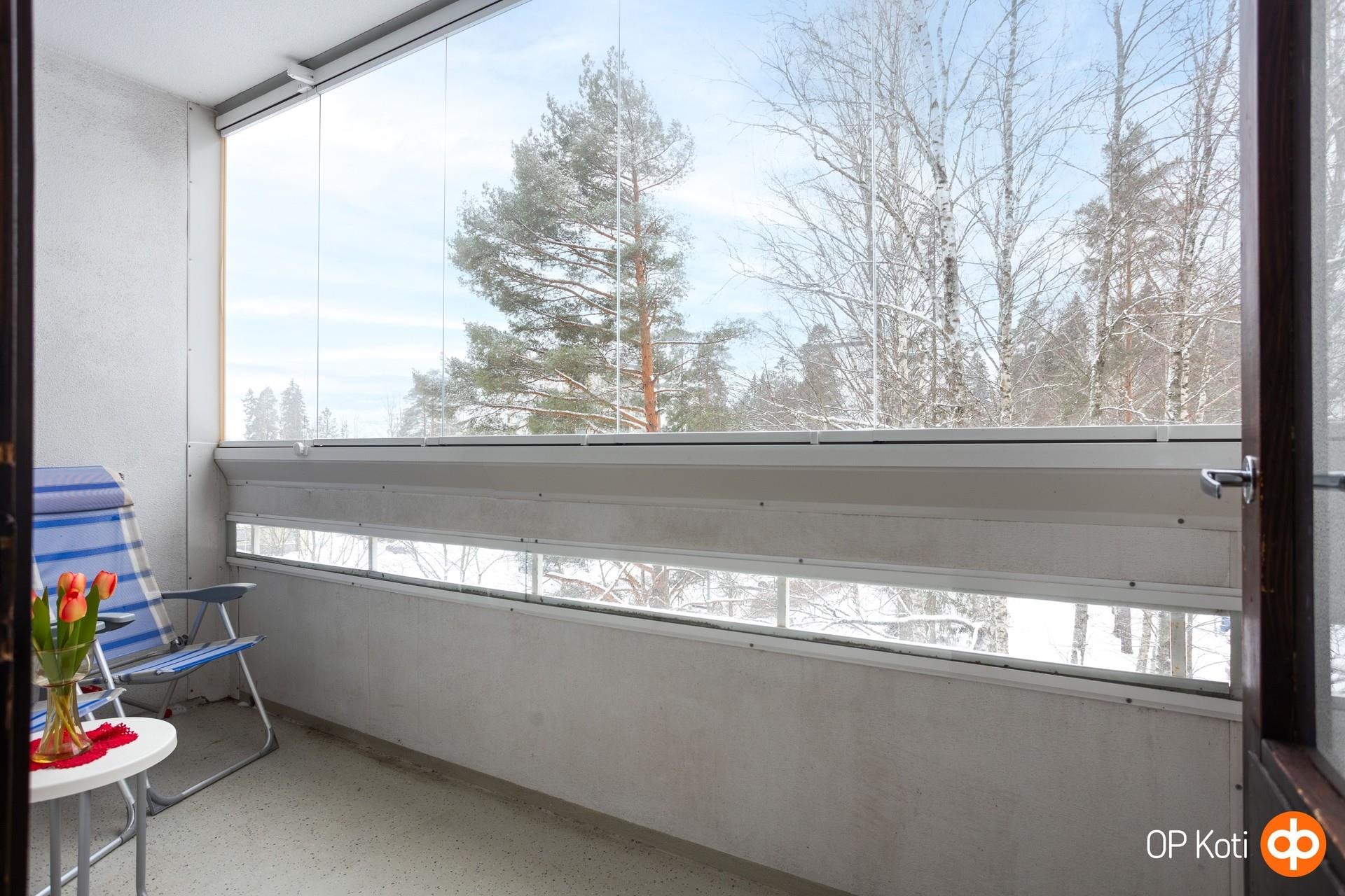 Olohuone tilava, käynti lasitetulle parvekkeelle.