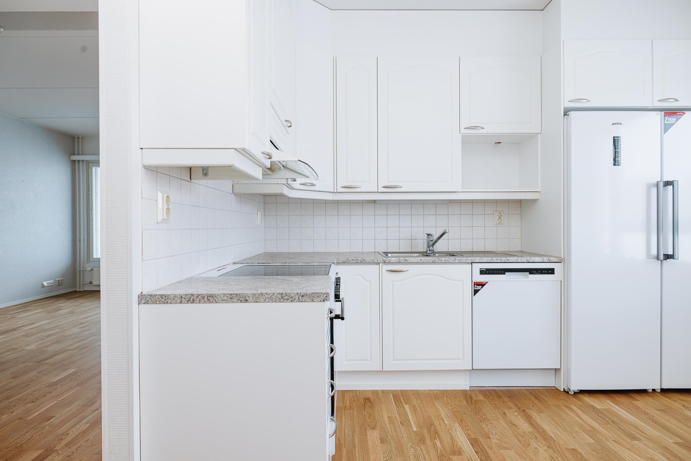 - Jääkaappipakastin, lattialiesi, liesituuletin, astianpesukone, kaapistot, kiinteät valaisimet.