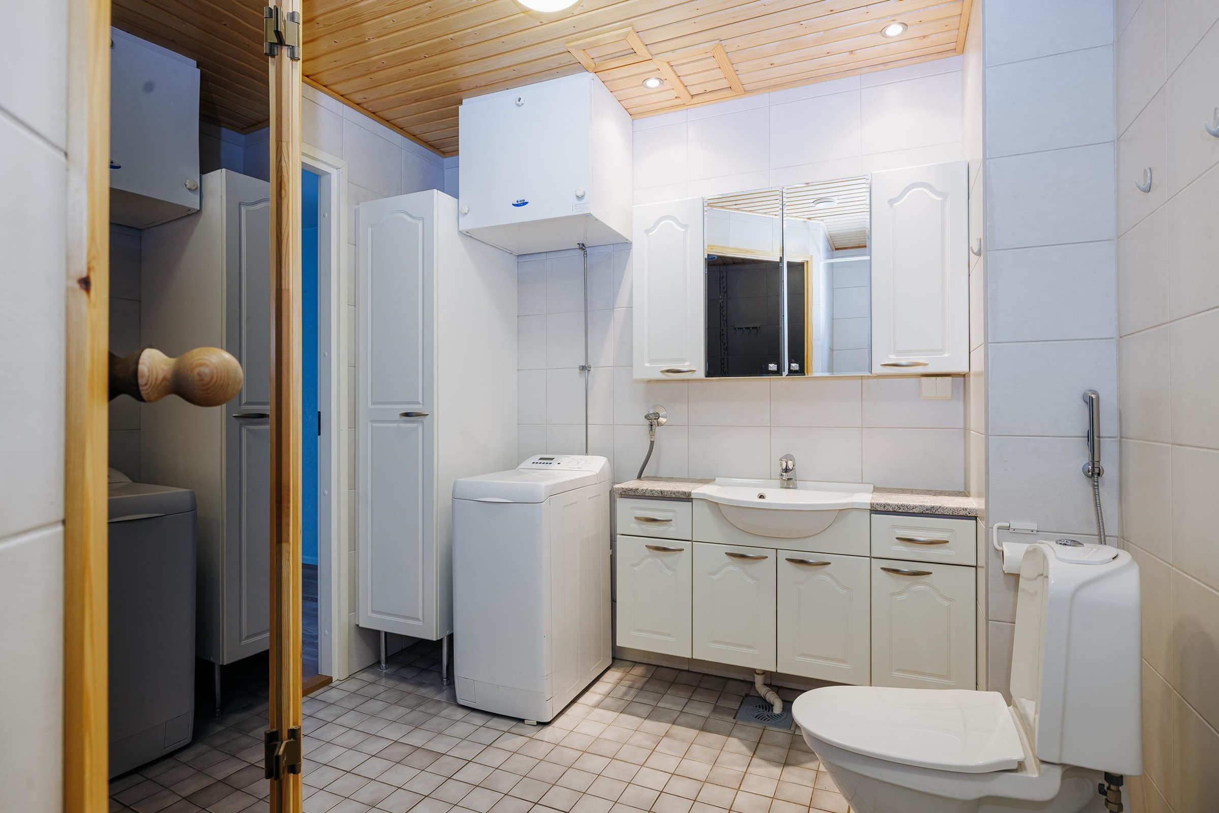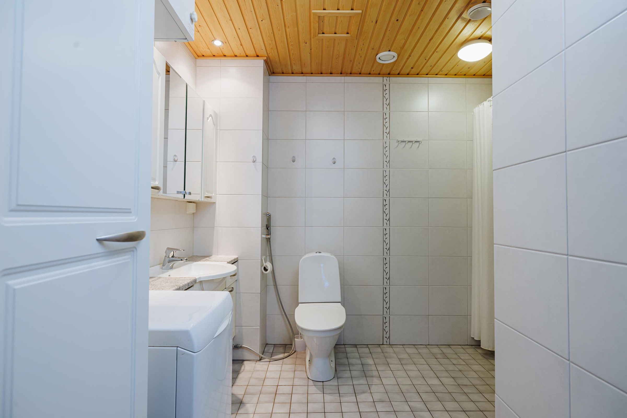 - Sauna, sähkökiuas, kylpyhuone, suihku, allaskaappi, pesukoneliitäntä, lattialämmitys, kiinteät valaisimet.