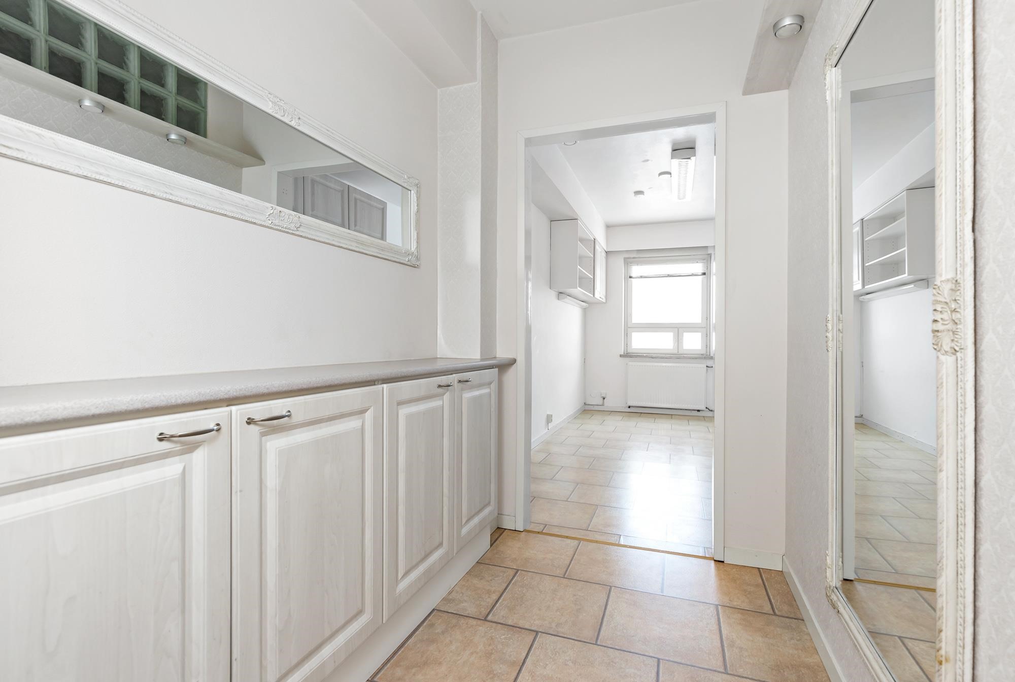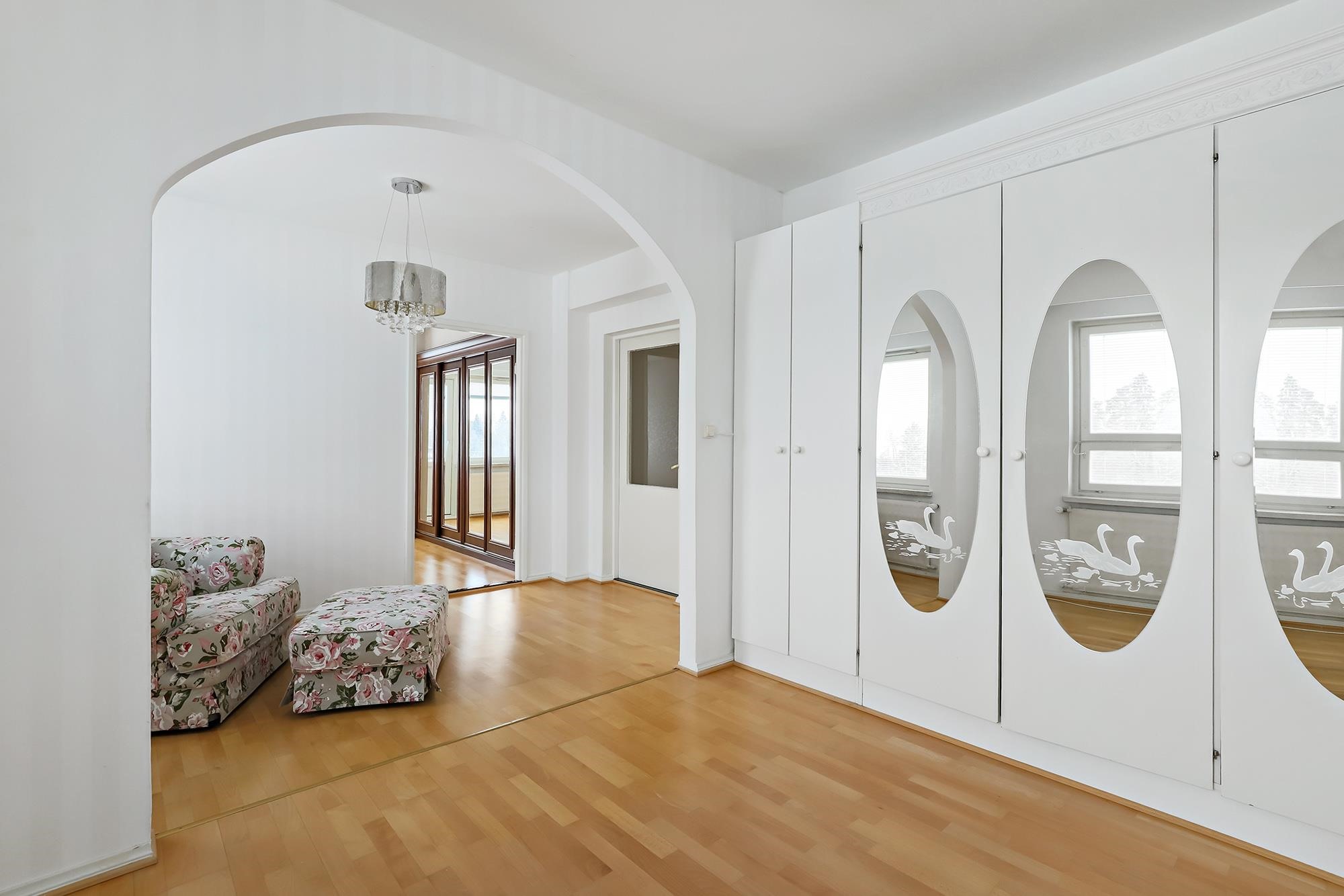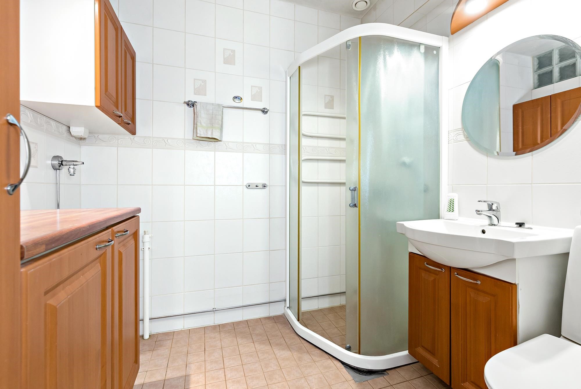 - Kylpyhuone, suihku, suihkukaappi, peilit, kaapit, allaskaappi, pesukoneliitäntä, lattialämmitys, kiinteät valaisimet.
