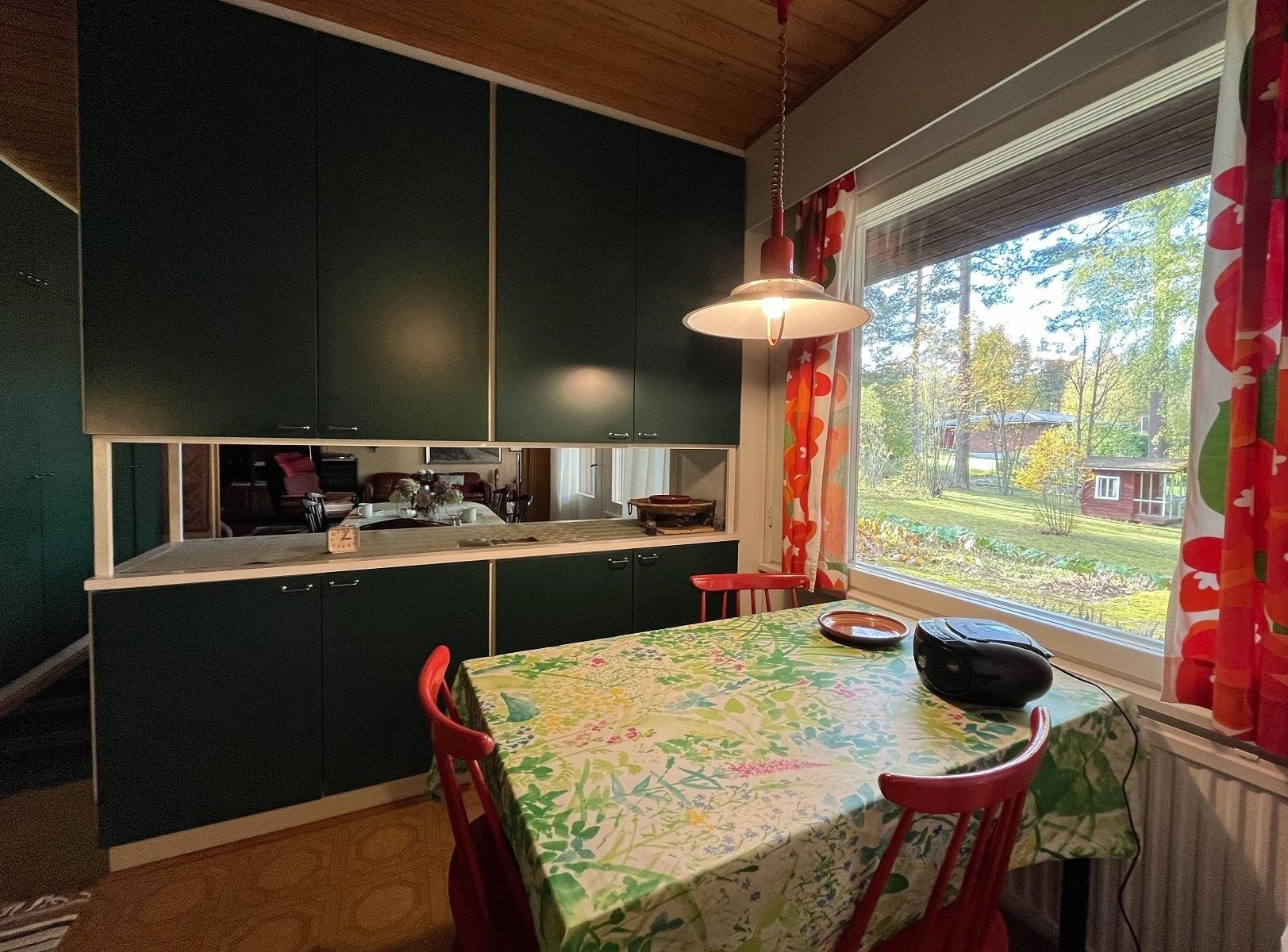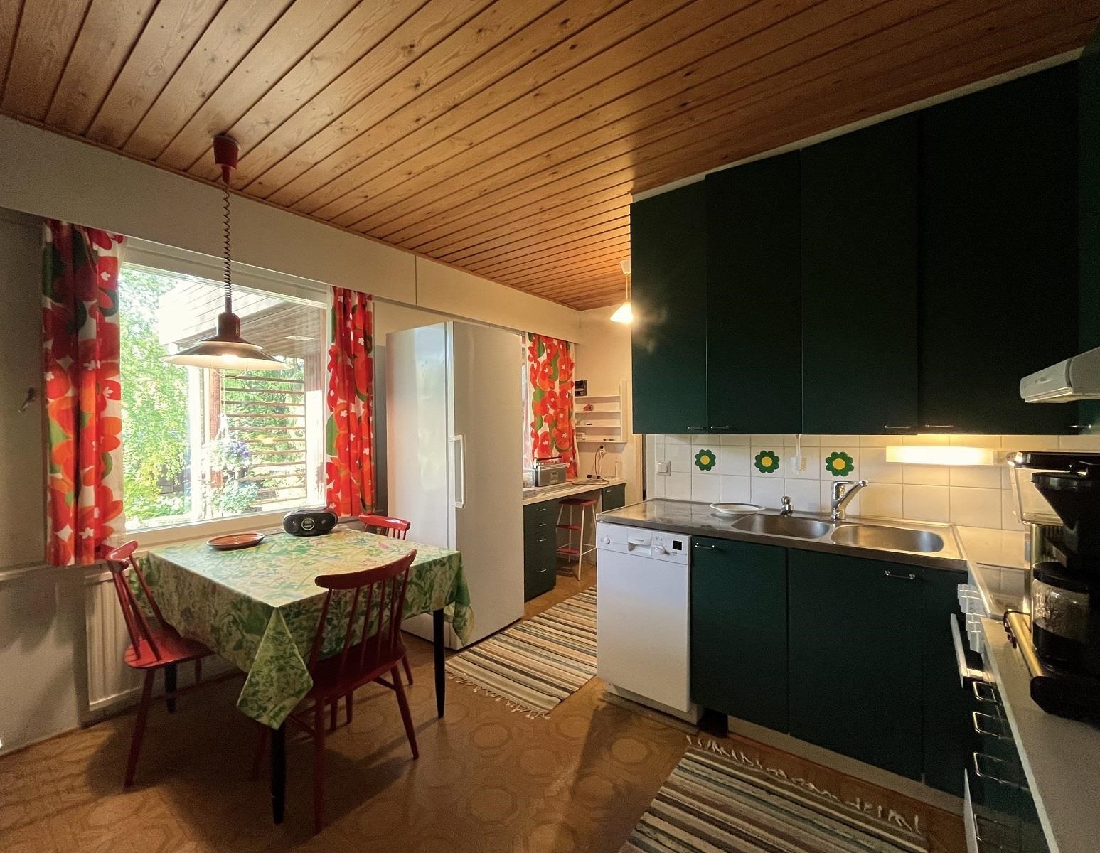 - Keittiössä on korkeat pakastekaappi ja jääkaappi (entisen kylmiön paikalla), keraaminen liesi, liesituuletin (hormi ulos), astianpesukone ja alkuperäiset kaapistot.