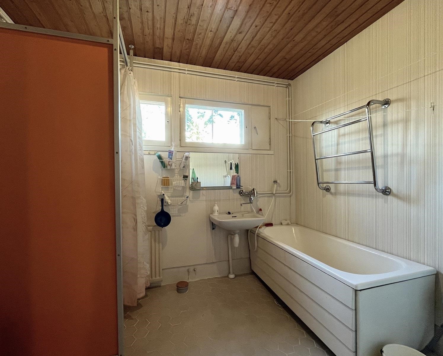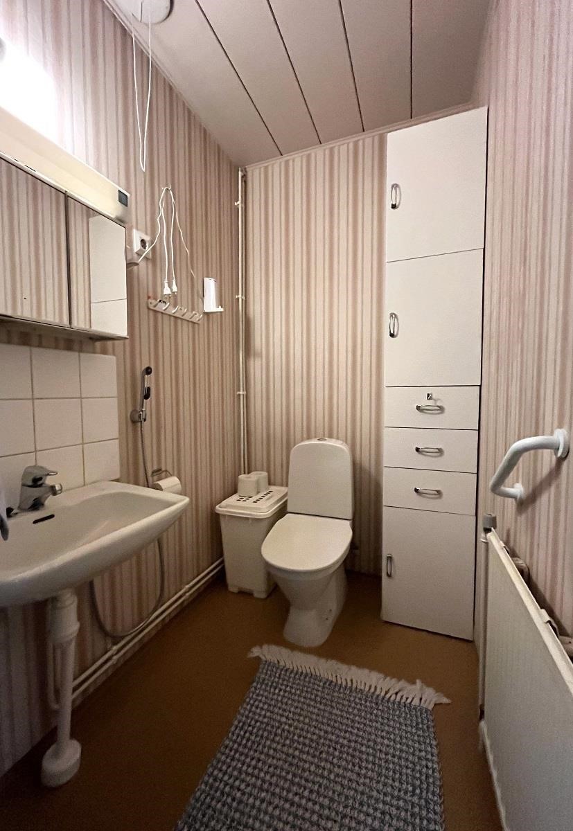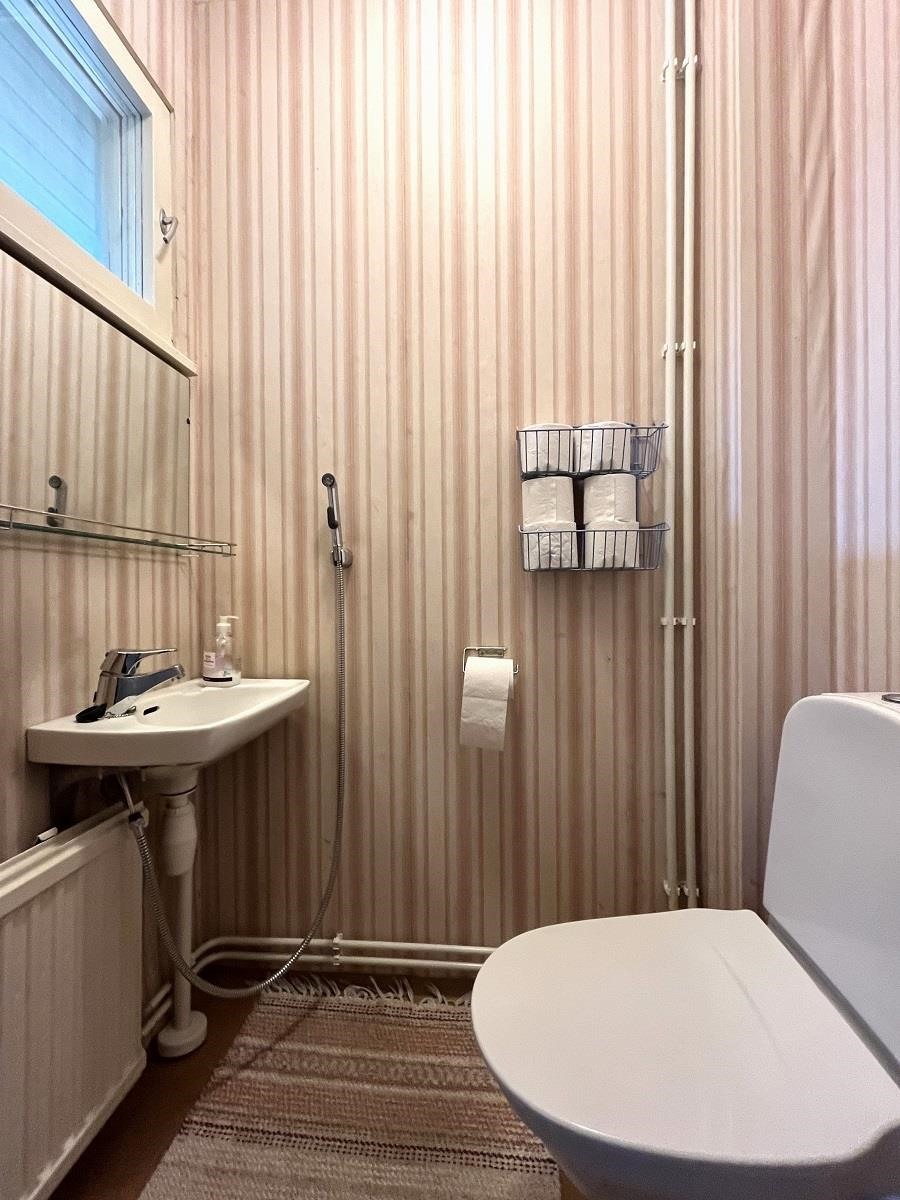 - Saunassa on sähkökiuas, kylpyhuoneessa suihku, amme ja pesukoneliitäntä. Kaksi erillistä wc:tä, joissa peilikaappi.