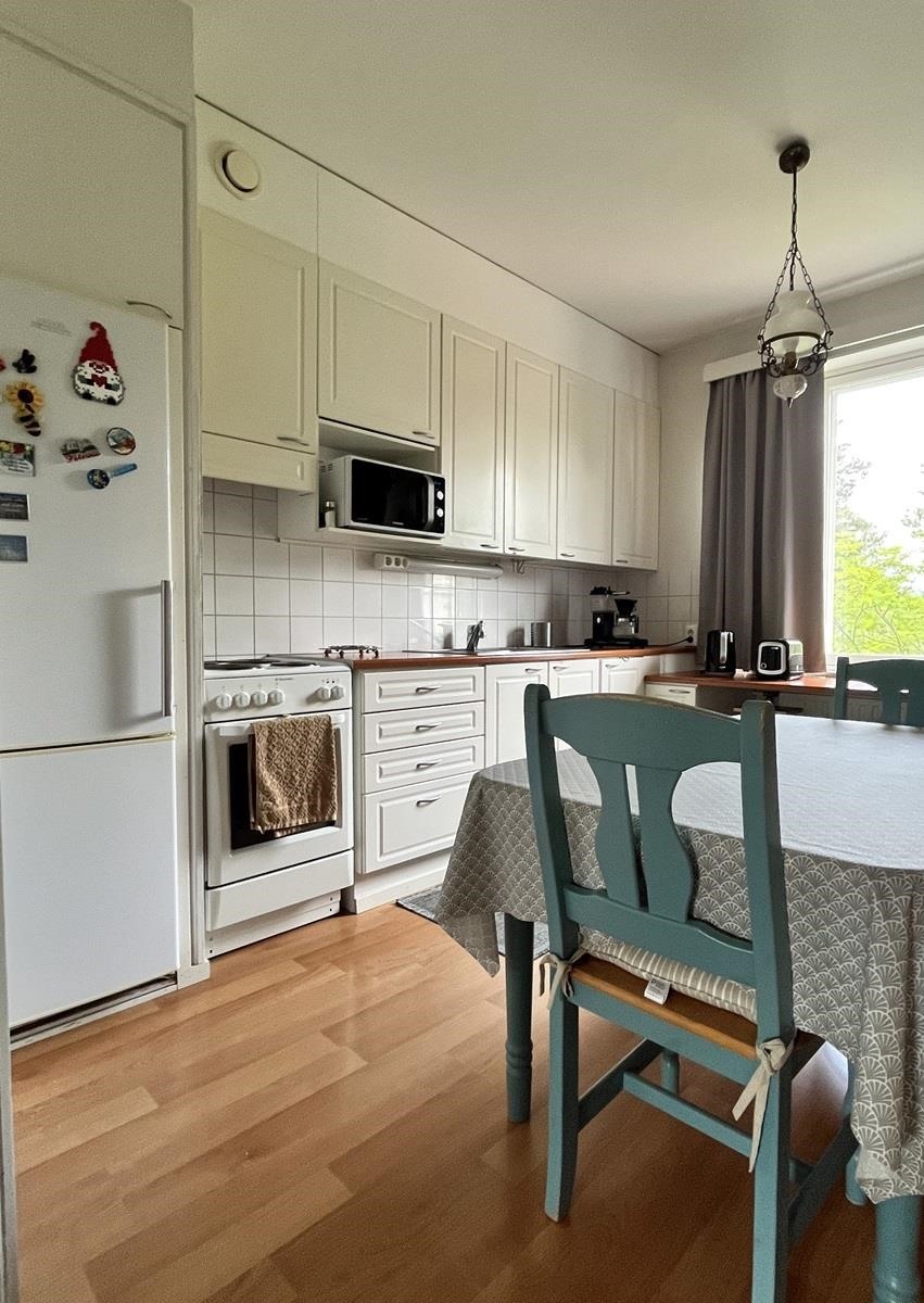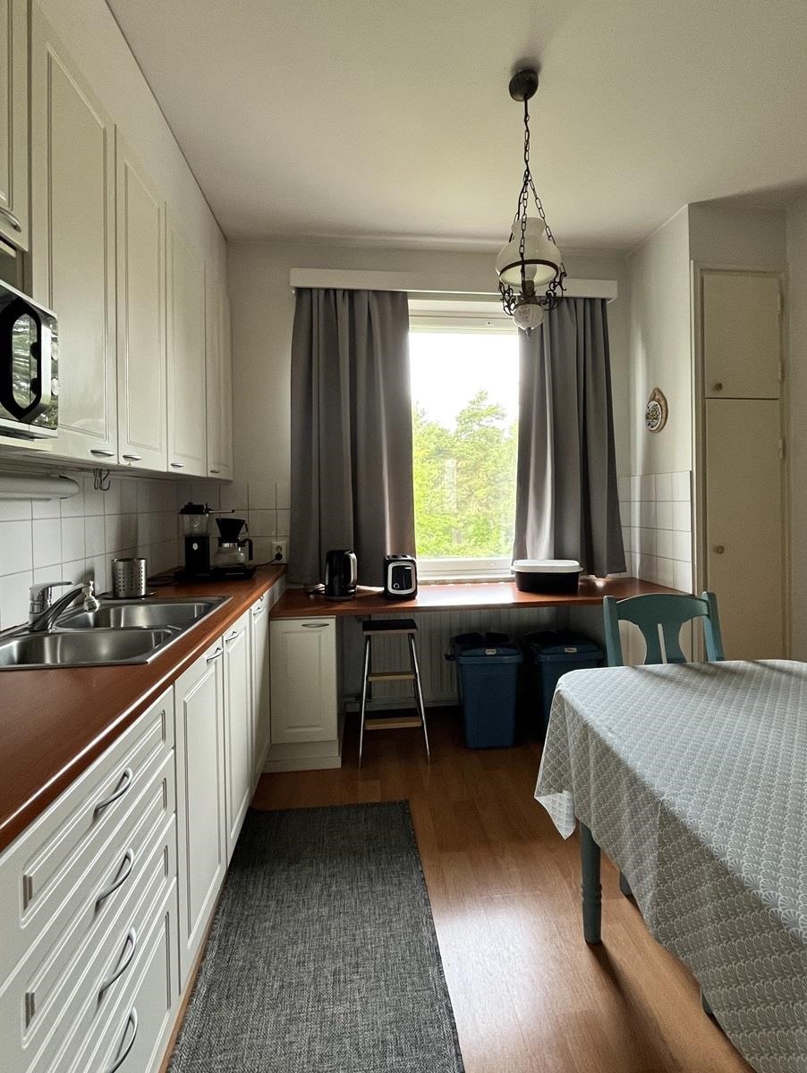 - Keittiöstä on mukava näkymä sisäpihalle. Keittiön varusteet: jääkaappipakastin, sähköliesi, kauniit kaapistot ja kiinteät valaisimet.