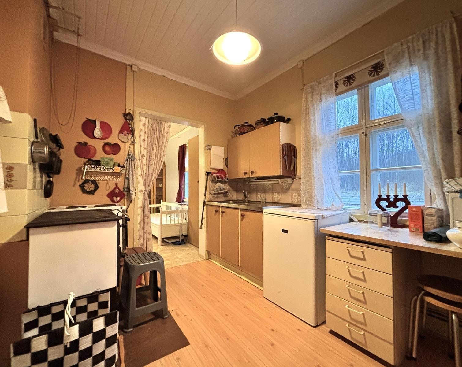 - Keittiössä on pieni jääkaappi ja pöytämallinen sähköliesi, jossa on kaksi keittolevyä ja pieni uuni. Kaapistot ja puuliesi.