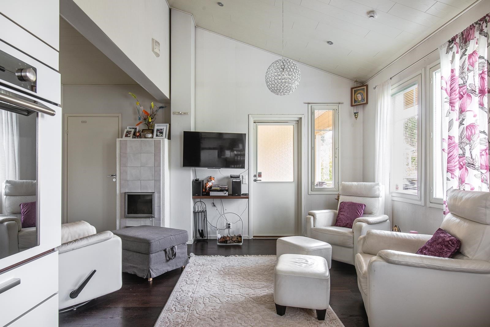 - Kaukolämpö. Olohuoneessa varaava takka.
