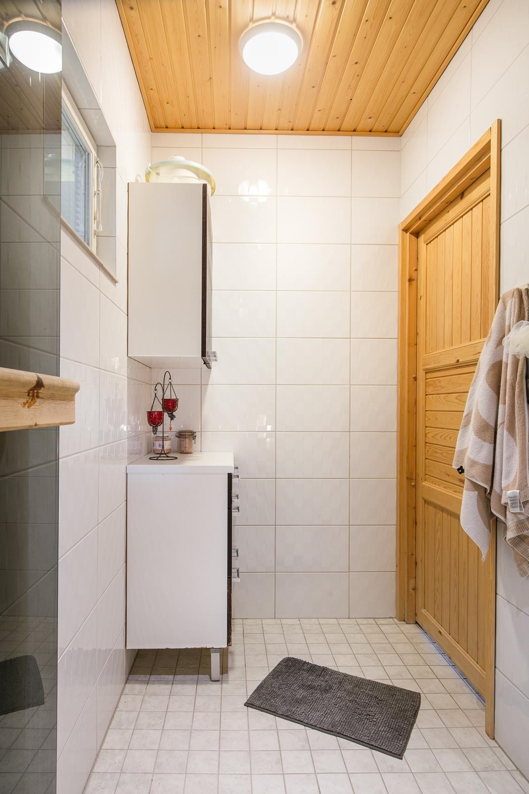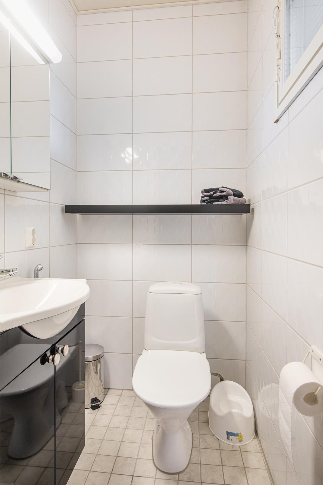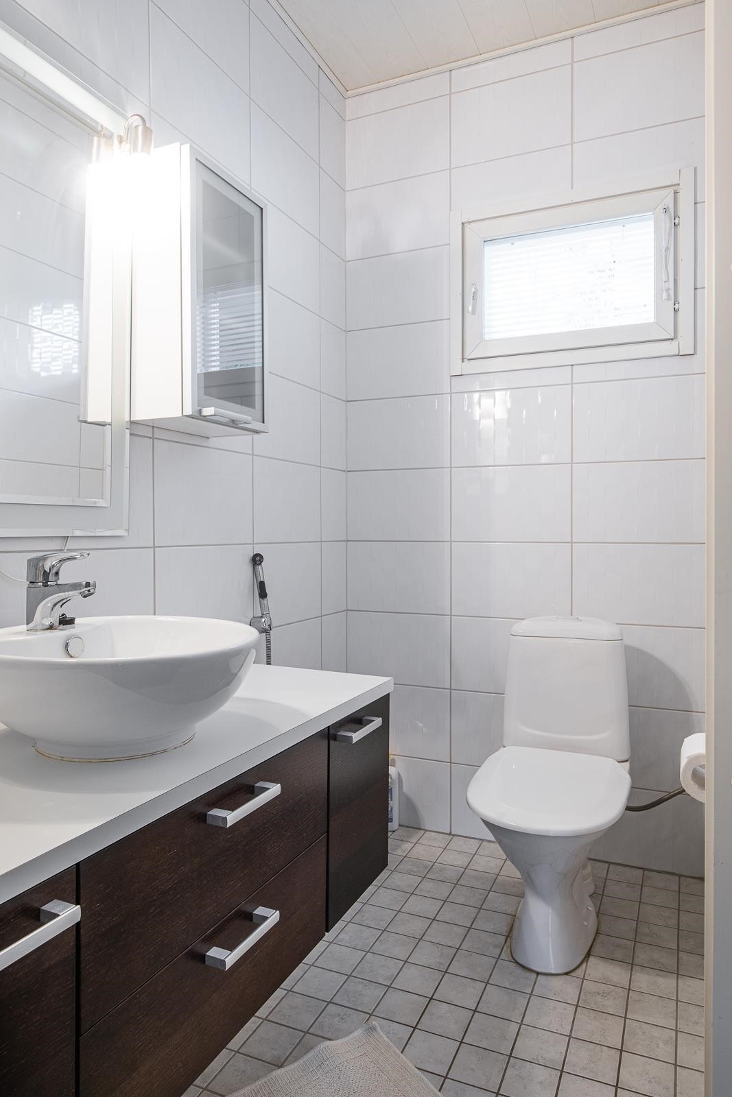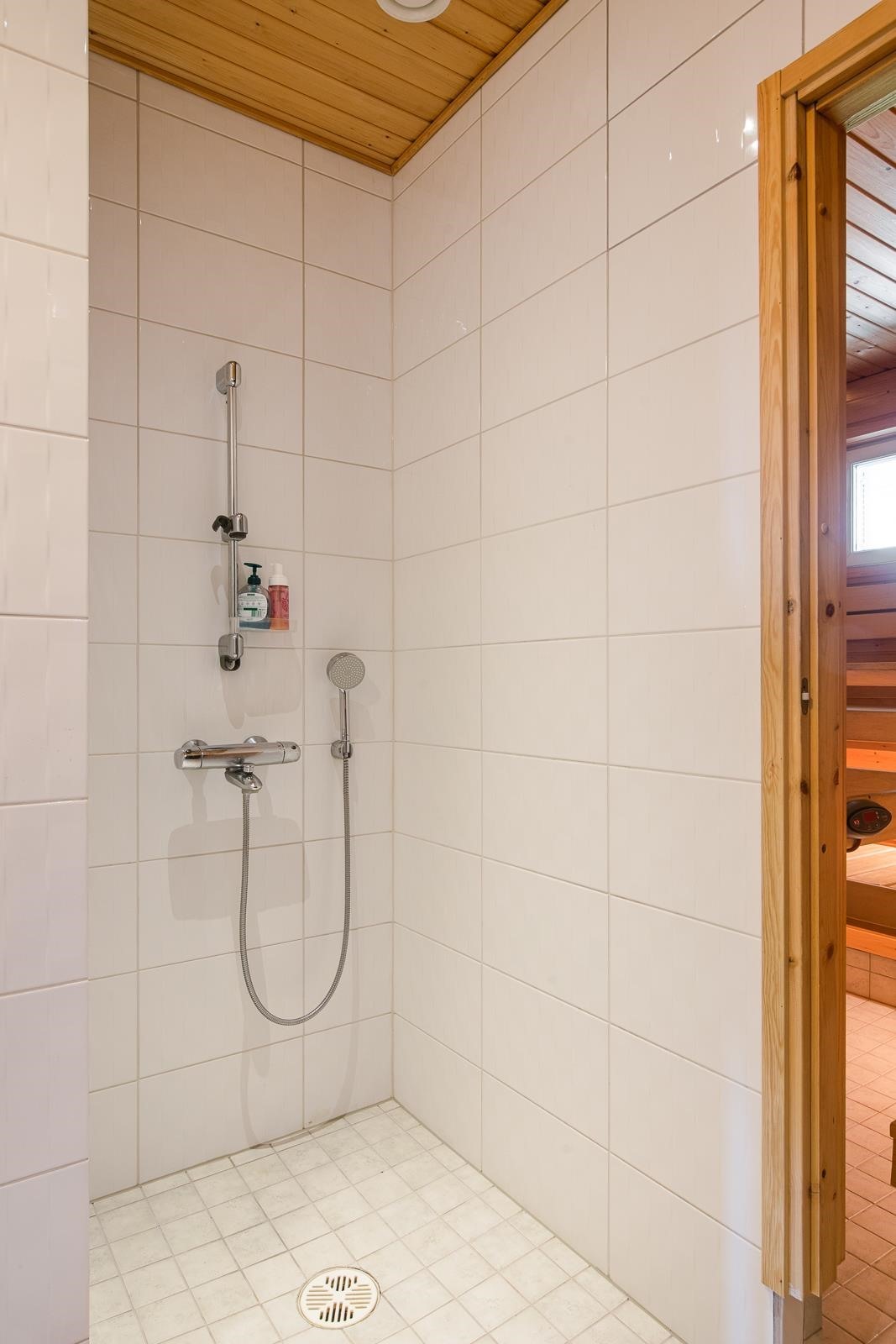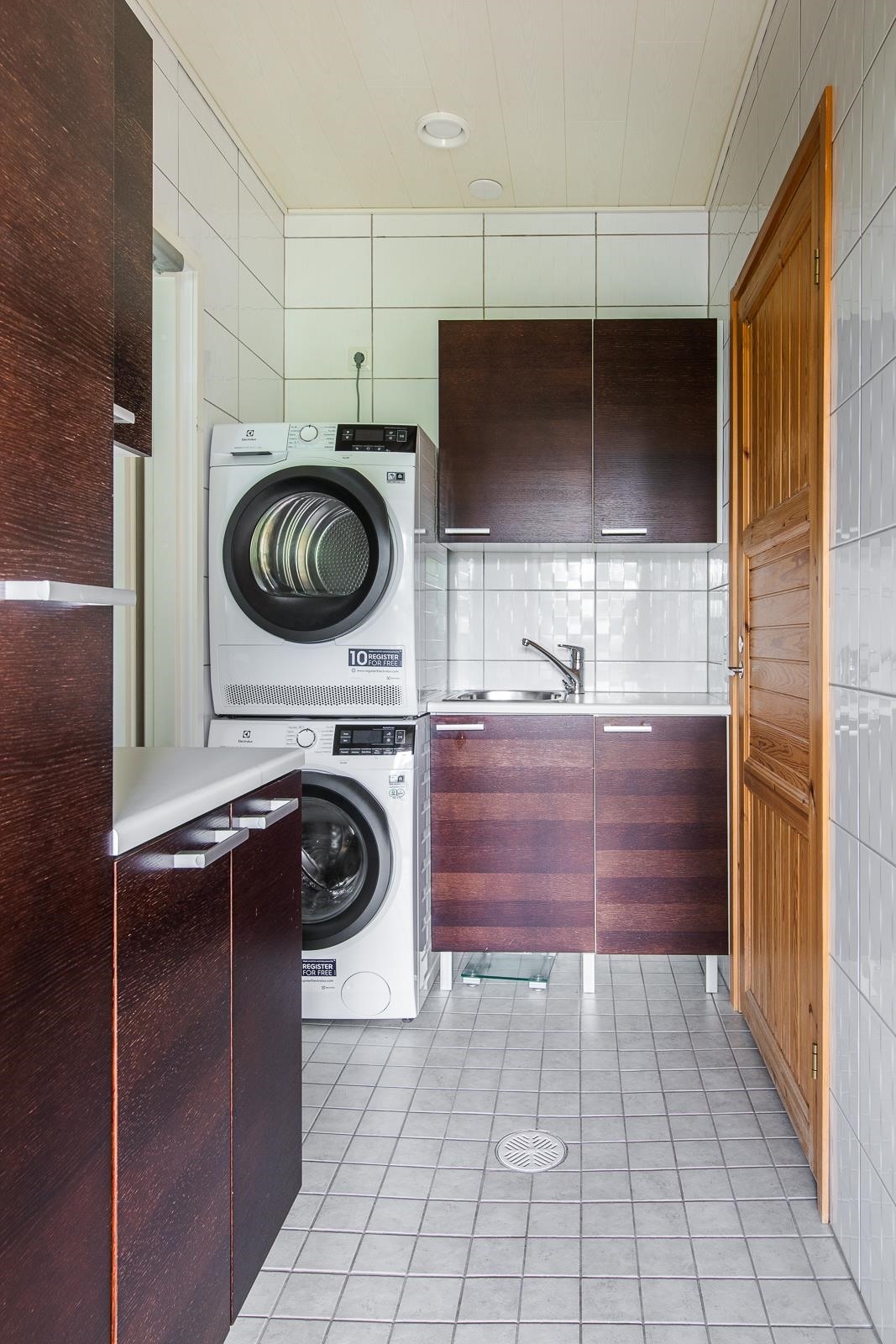 - Saunaosaston yhteydessä kylpyhuone, erillinen wc, sekä kodinhoitohuone jossa kaapistot, pyykinpesukone ja kuivausrumpu.