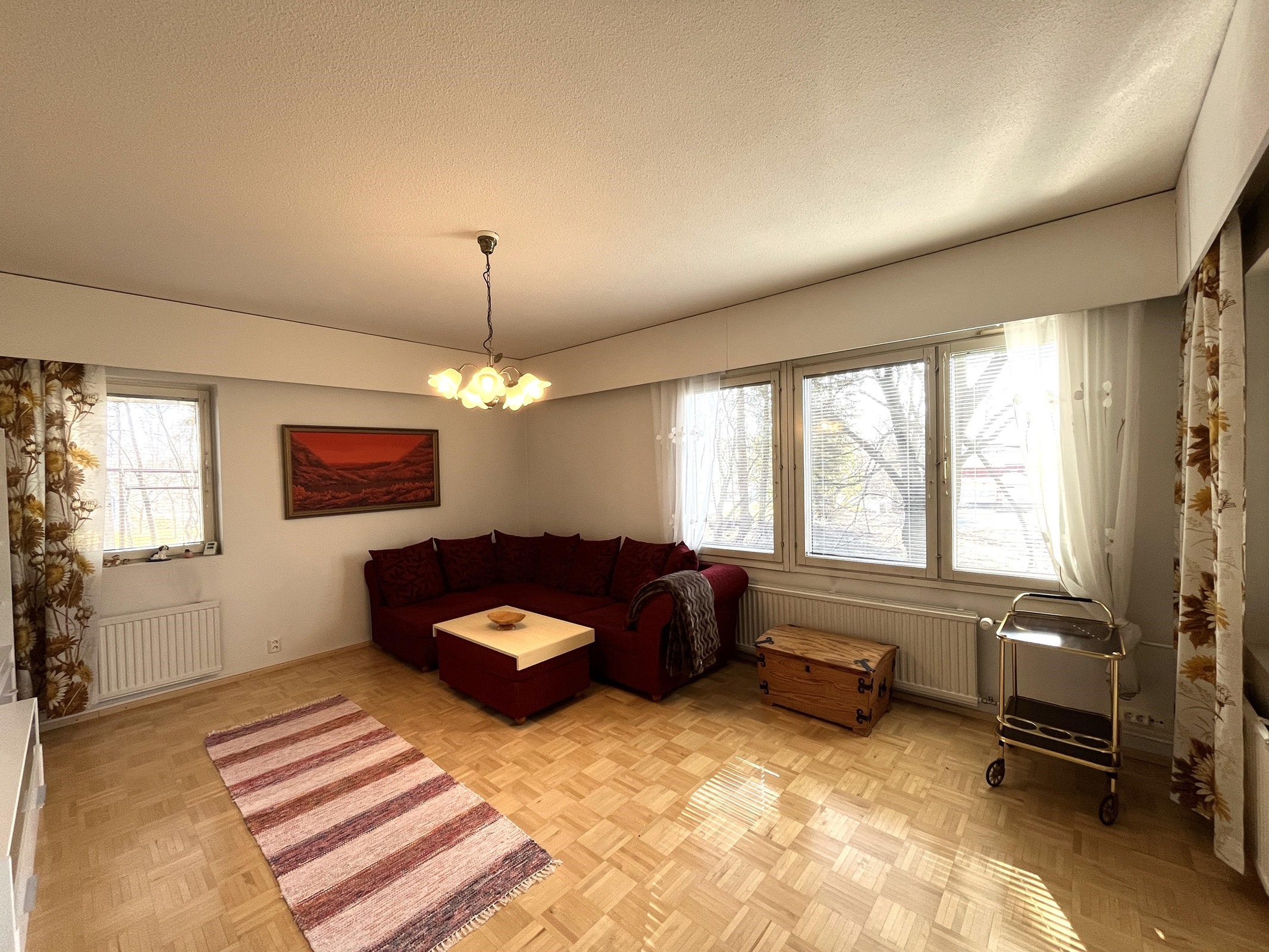 - Ikkunat kahteen ilmansuuntaan, makuuhuoneen ikkunat lähinnä itään päin. Olohuoneen ikkunat etelään sekä itään ja keittiön ikkunat etelän suuntaan.
