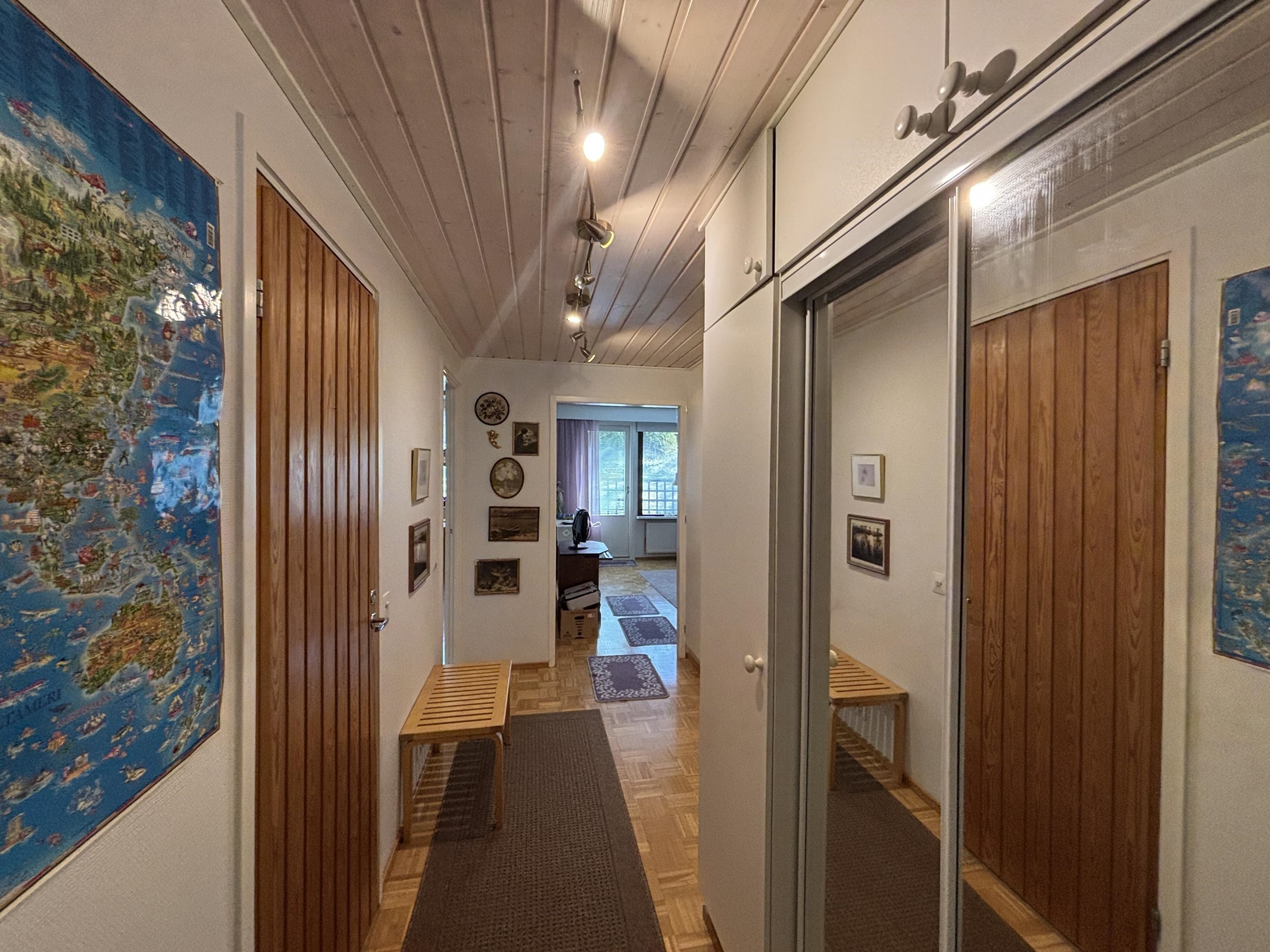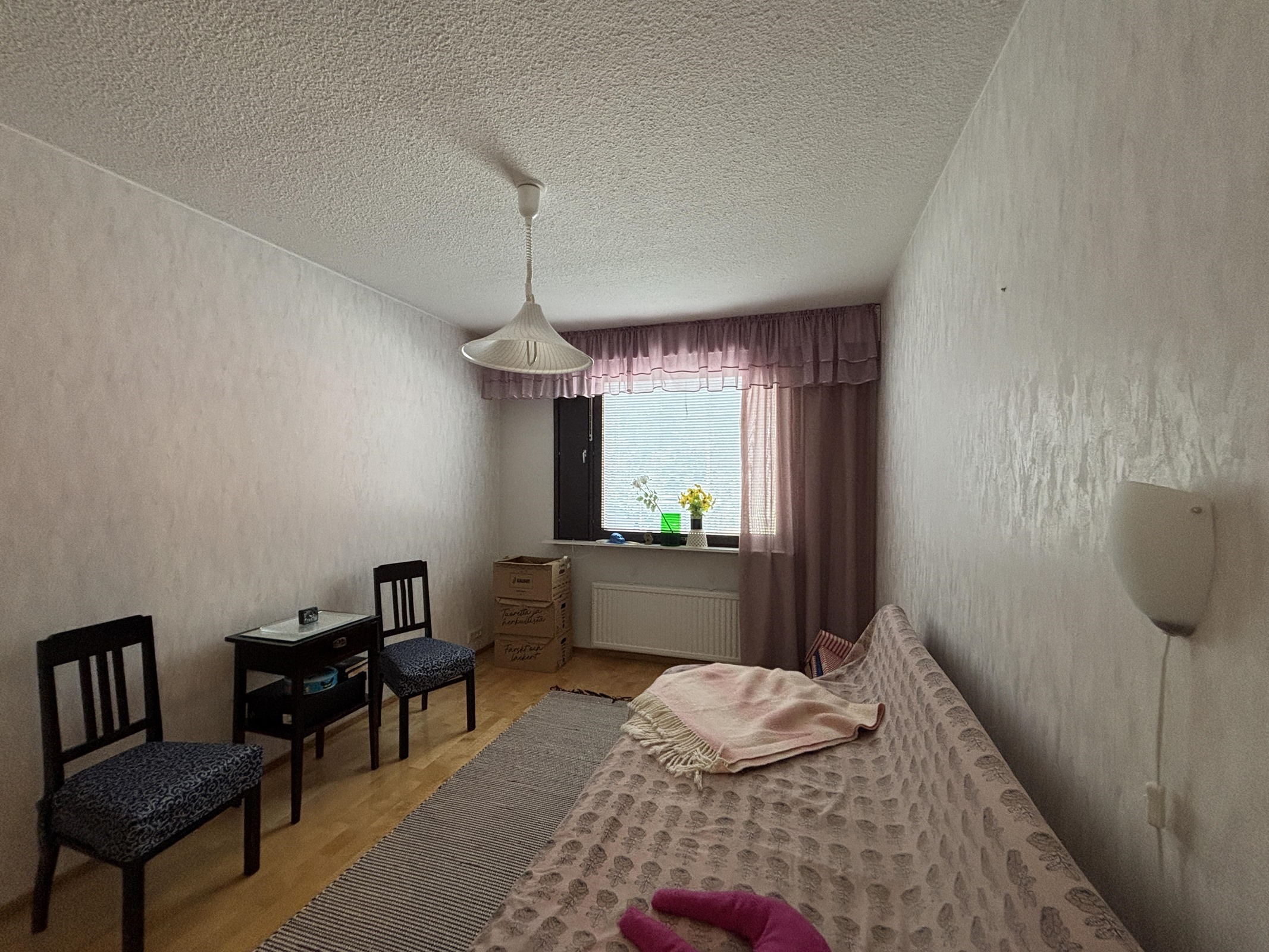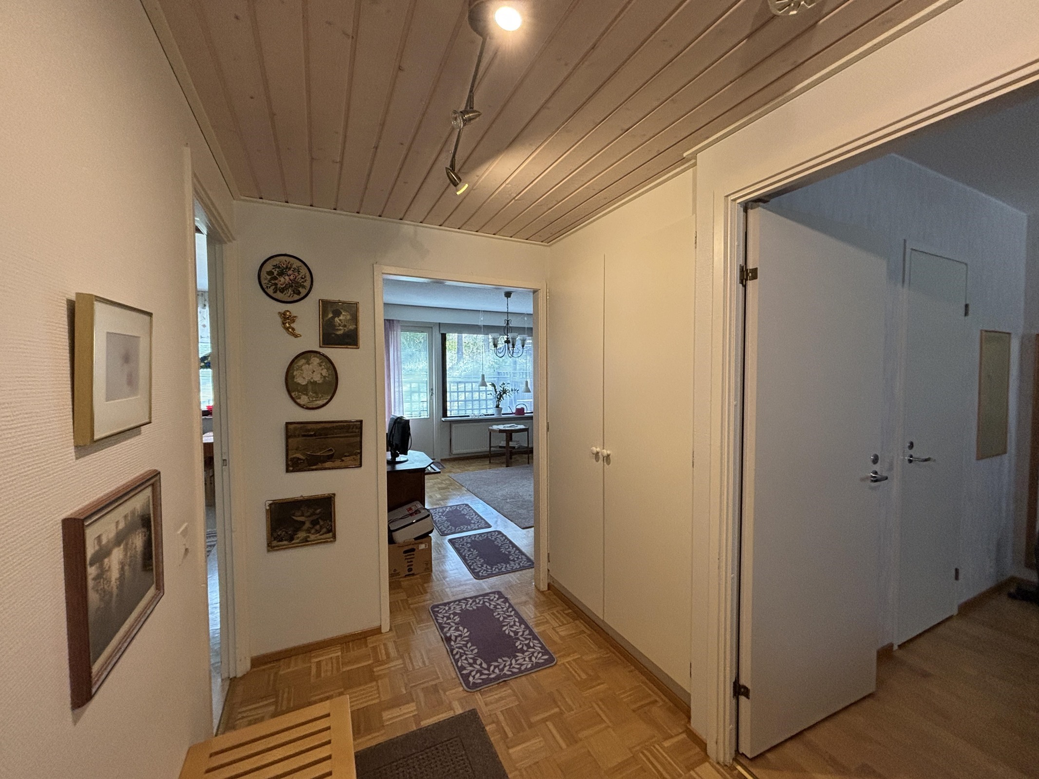 Keittiössä muovimattolattia ja maalatut seinät. Olohuoneessa parkettilattia ja seinissä lasikuitutapettia. Makuuhuoneessa parkettilattia ja tapetoidut seinät.