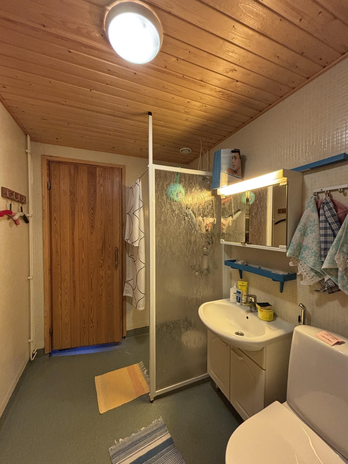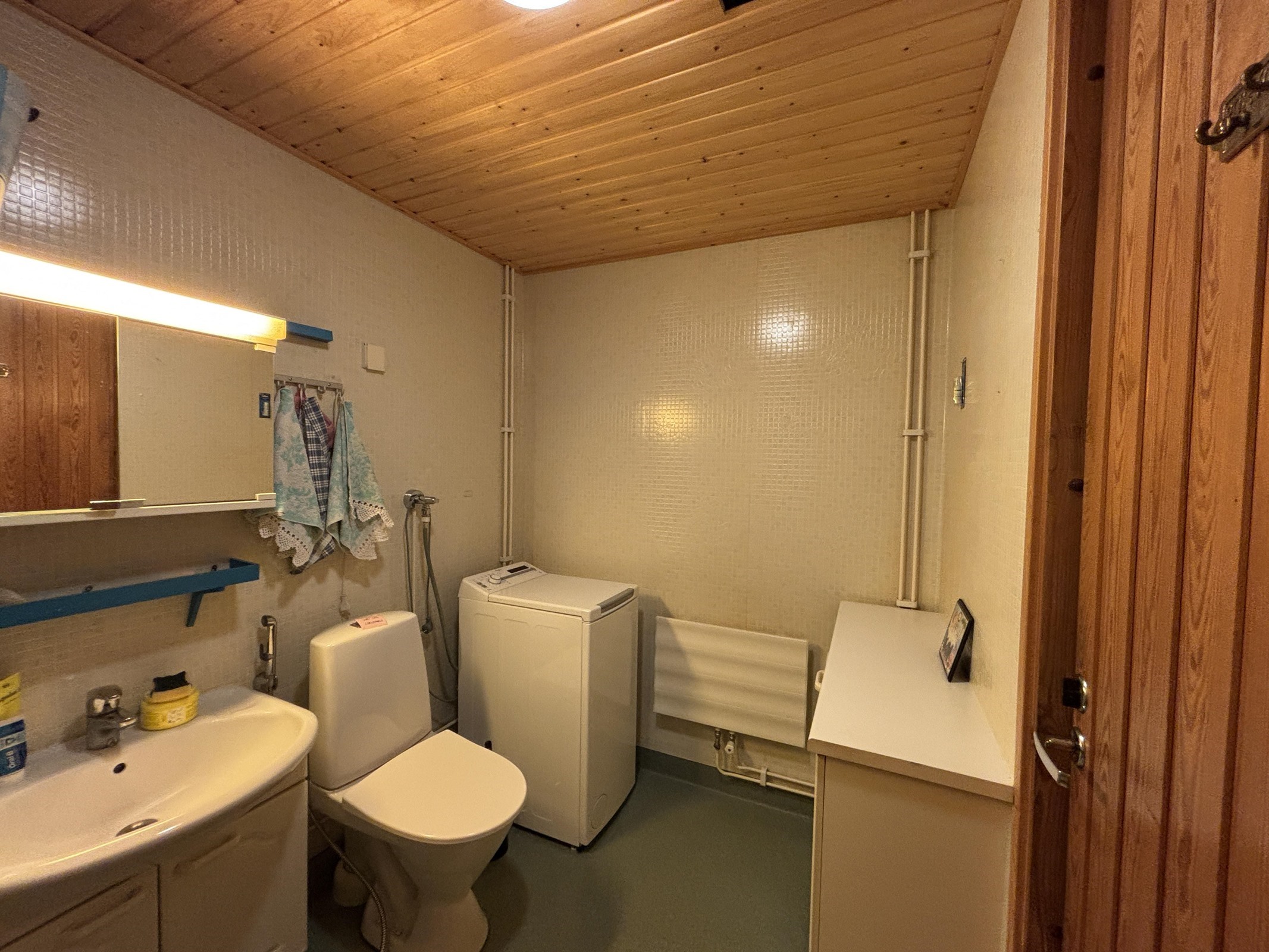 - Sauna, sähkökiuas, peilikaappi, allaskaappi, pesukoneliitäntä.