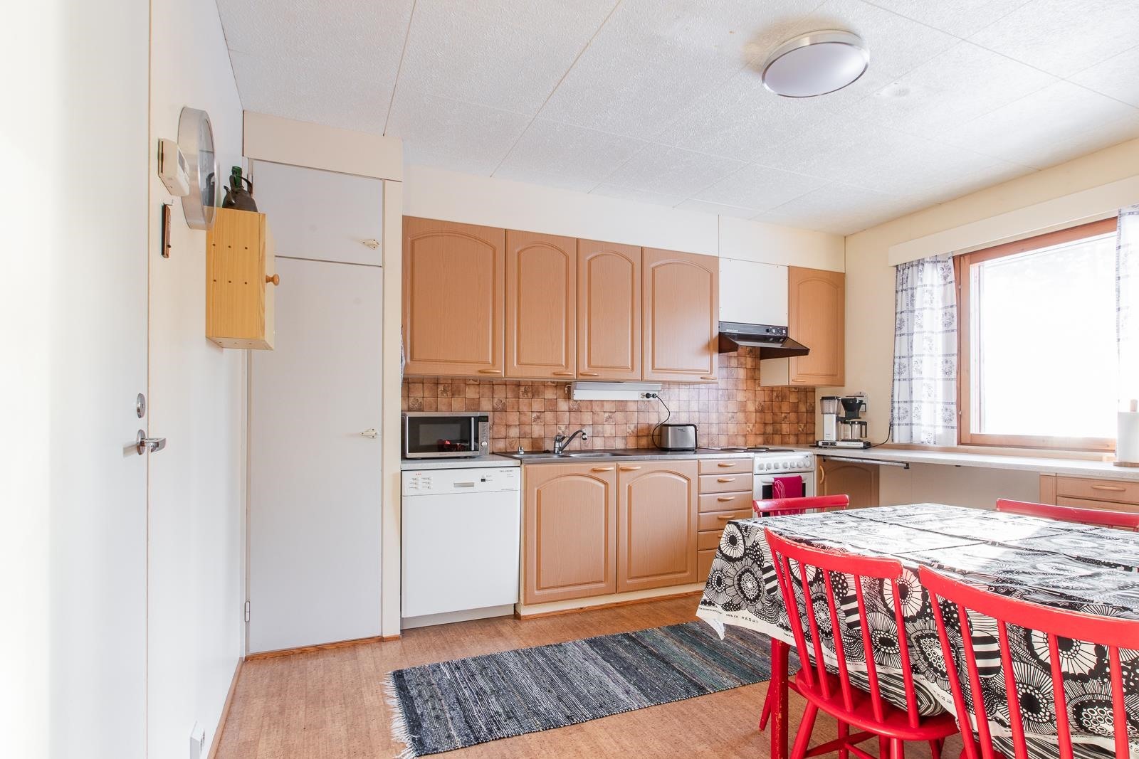 - Tilavassa keittiössä on jenkkikaappi, sähköliesi, liesituuletin, astianpesukone ja mukavasti kaapistoja ja työtasoa. Keittiöön mahtuu ruokapöytä.
