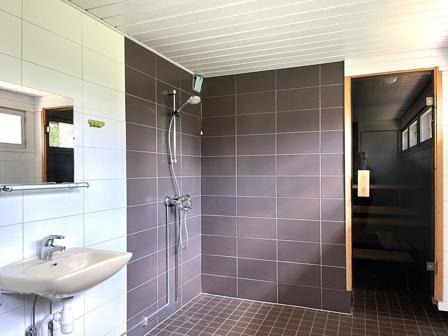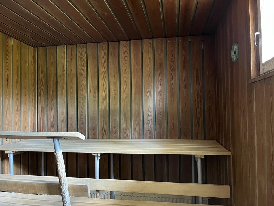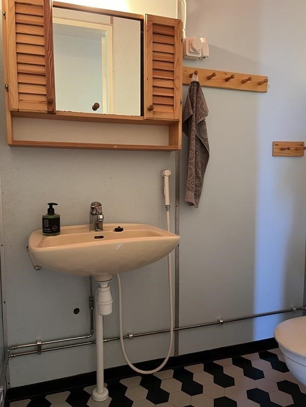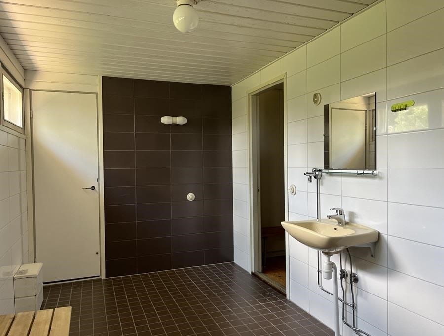 - Kylpyhuone on uusittu kokonaan 2013. Tilavassa kylpyhuoneessa on suihku, lavuaari ja paikka pyykinpesukoneelle. Kylpyhuoneessa on kaakelit sekä lattiassa että seinissä. Saunassa on lattiassa laatoitus ja seinissä paneeli. Saunassa on sähköllä lämpiävä kiuas ja mahdollisuus myös puilla lämpiävälle kiukaalle. Pukuhuoneen vieressä on pikkuwc ja toinen wc löytyy eteisaulasta. Kylpyhuoneessa ja saunassa on vesikiertoinen lattialämmitys. Pyykinpesukoneelle löytyy liitäntä myös alakerran teknisestä tilasta.