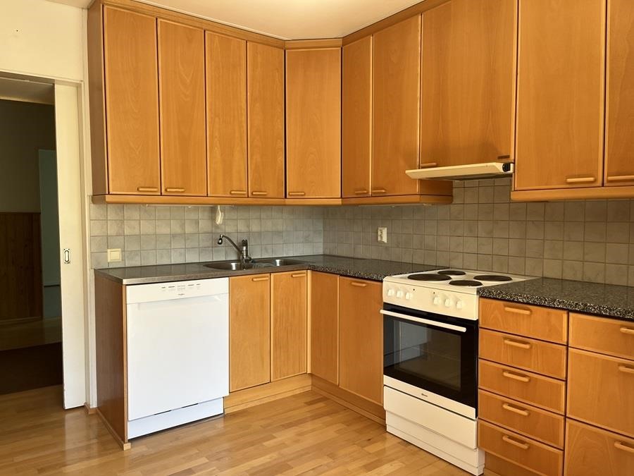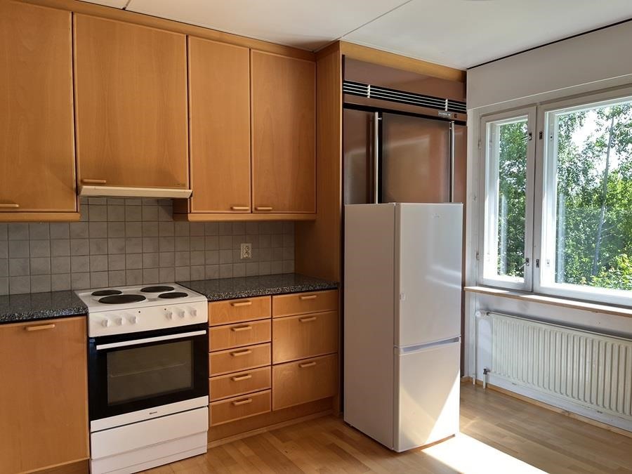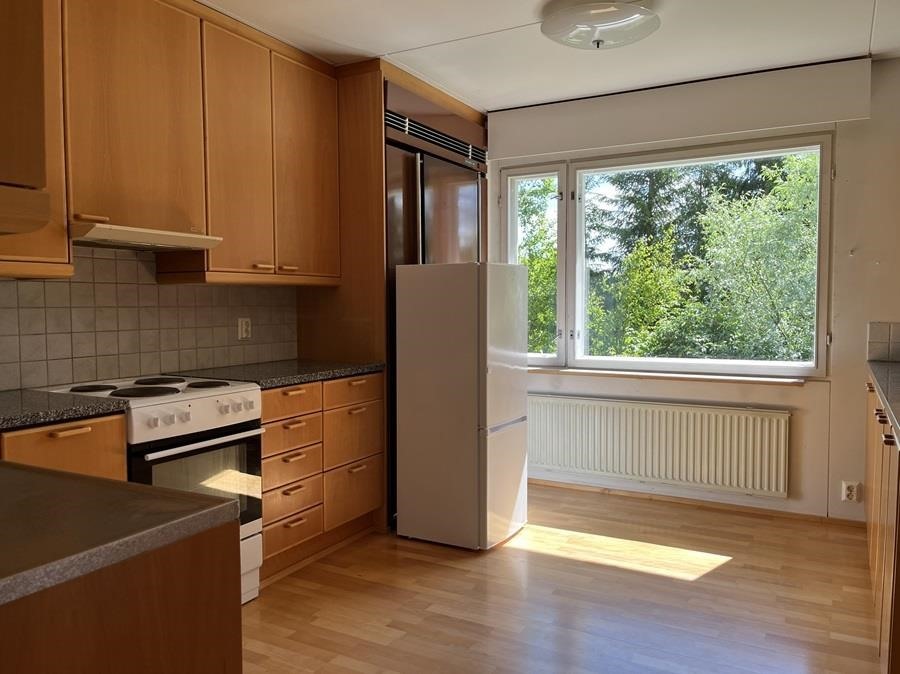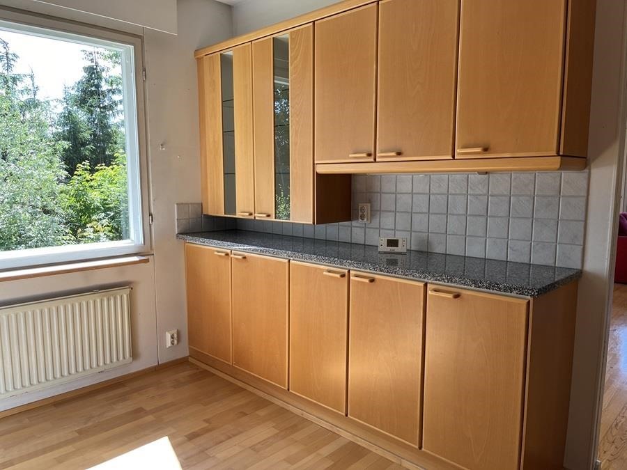 - Tilavassa keittiössä on jääkaappi-pakastin, sähköliesi, liesituuletin, astianpesukone, vuonna 1995 uusitut Marcellon kaapistot ja kivitasot. Keittiön vieressä vielä erillinen ruokailutila mutta keittiöönkin mahtuu ruokailupöytä. Keittiössä oleva kylmiö on rikki.