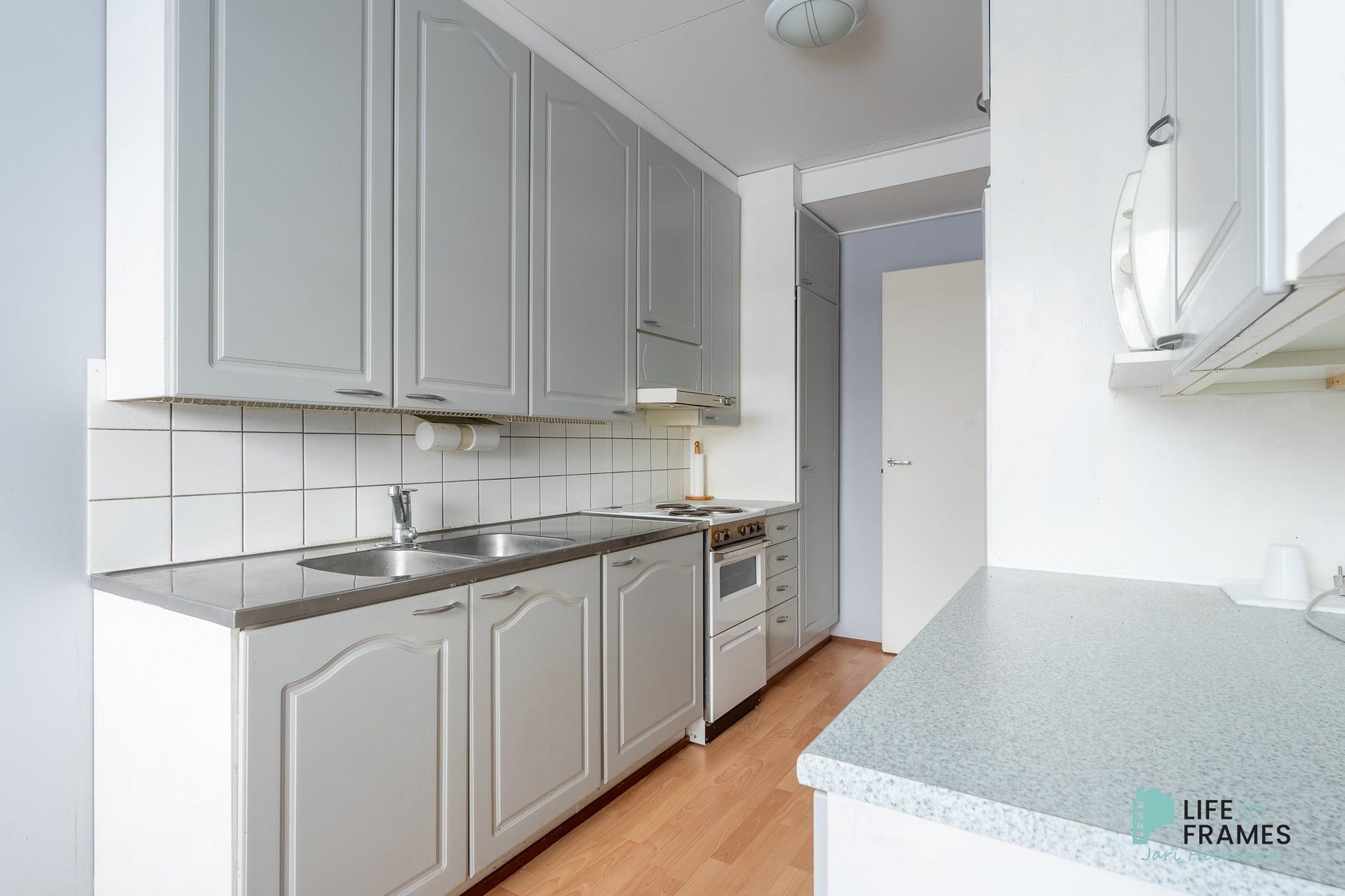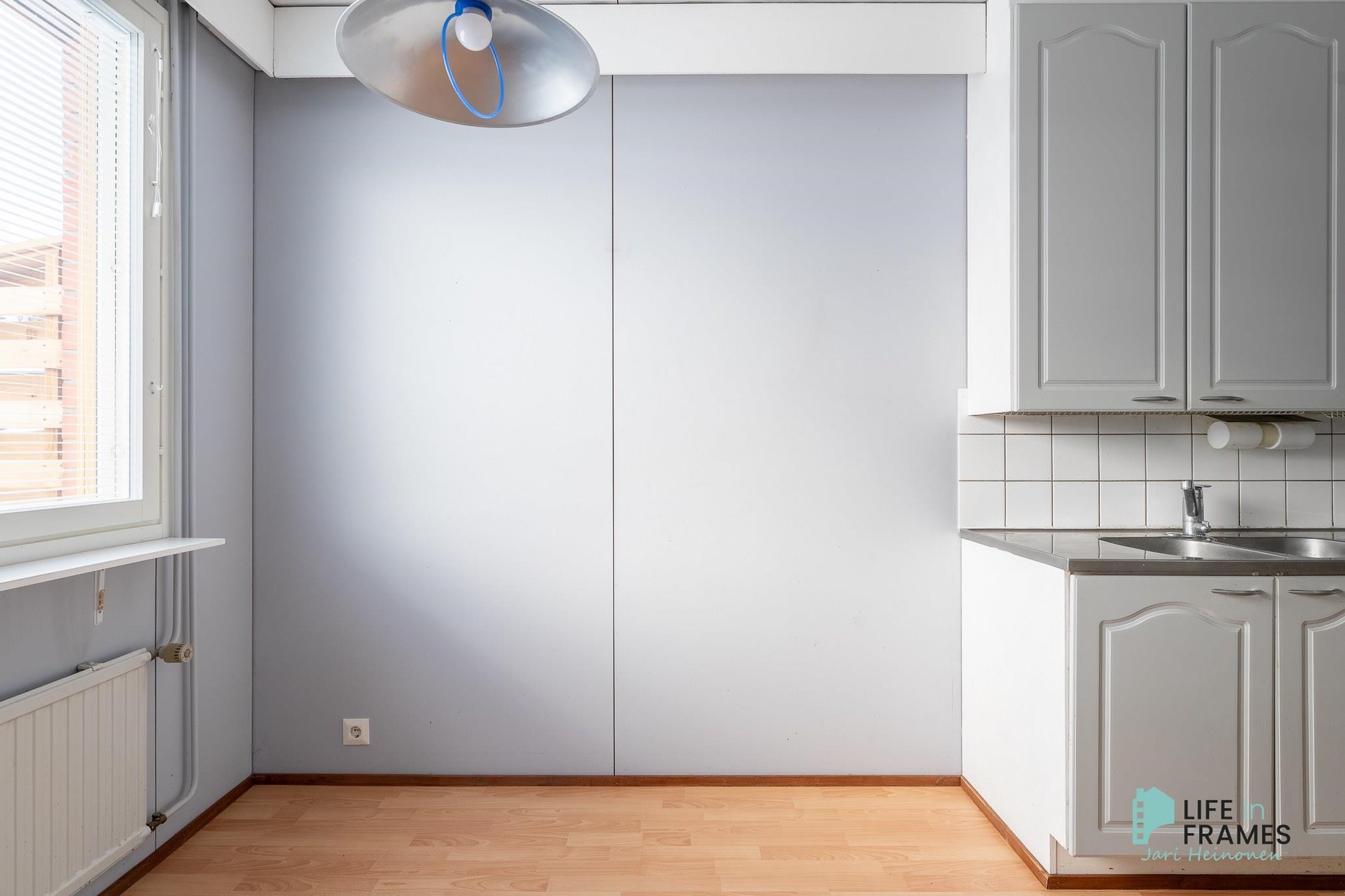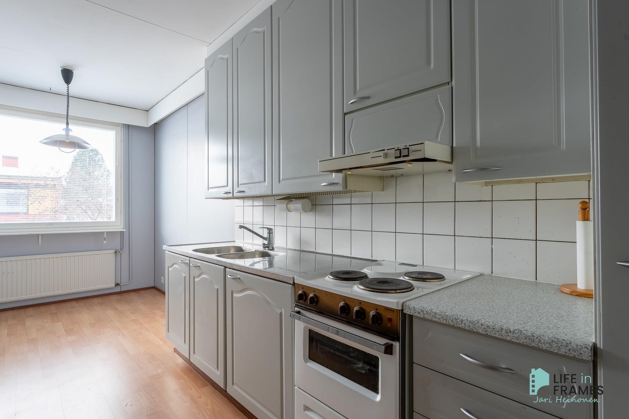 - Jääkaappi, sähköliesi (alkuperäinen), liesituuletin (alkuperäinen), kaapistot (ovet vaihdettu noin vuonna 2002), kiinteät valaisimet.