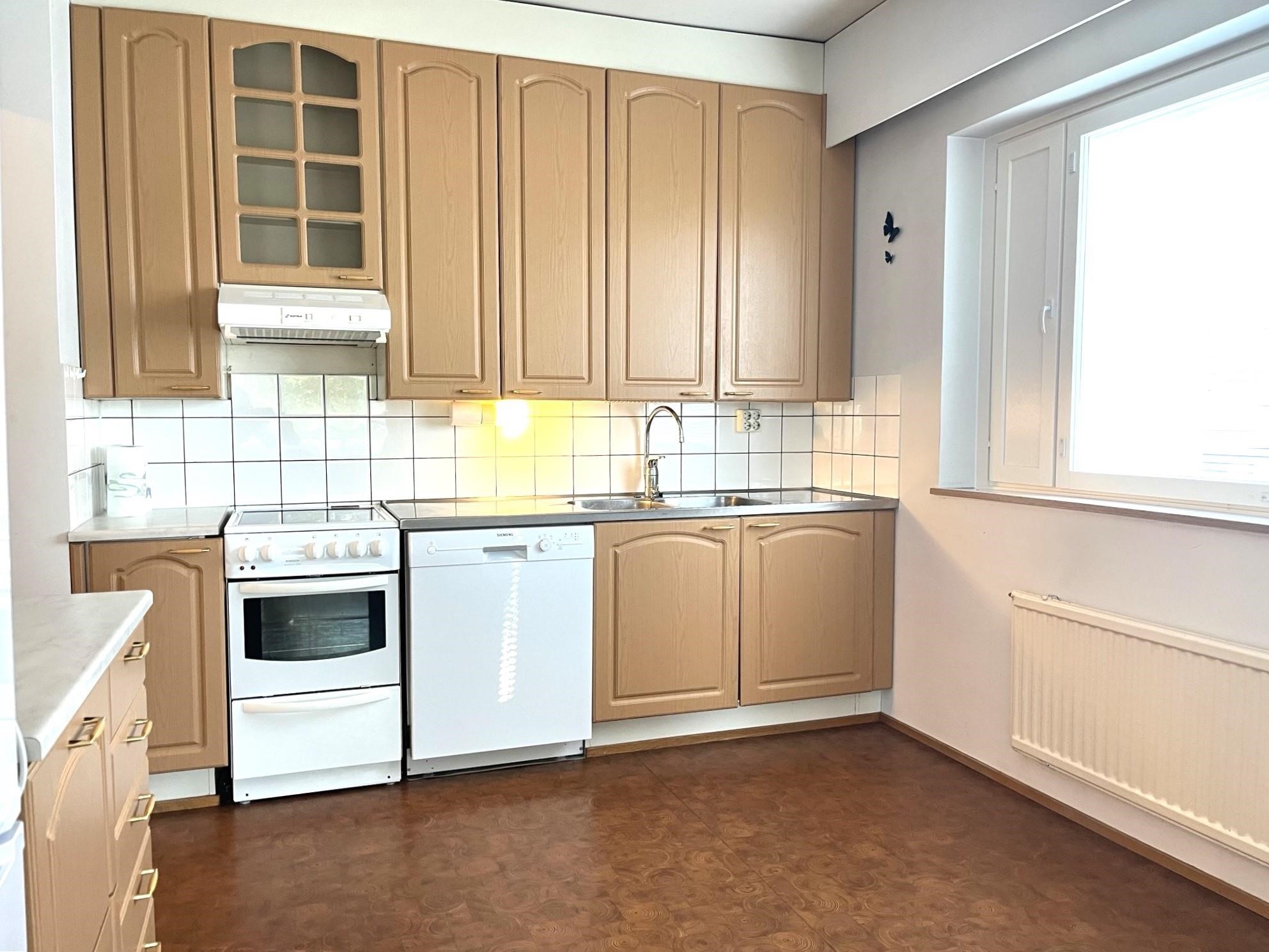- Jääkaappipakastin, keraaminen liesi, liesituuletin (suodatinmalli), astianpesukone, kaapistot, kiinteät valaisimet.