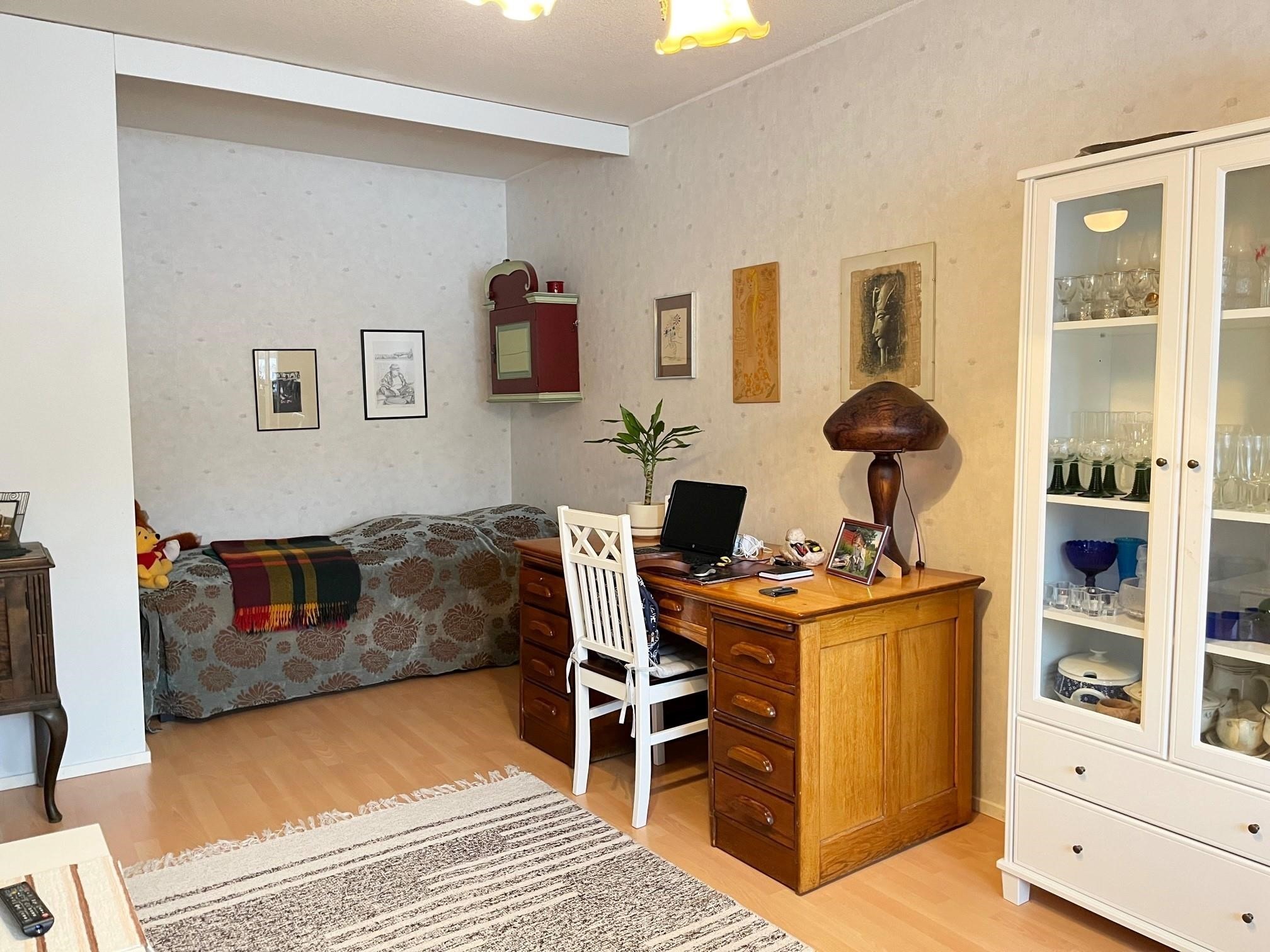 Keittiö: muovimatto, seinät maali. Olohuone: laminaattilattia, seinät tapetti / maali. Kylpyhuone: /wc: laattalattia, kaakeliseinät.