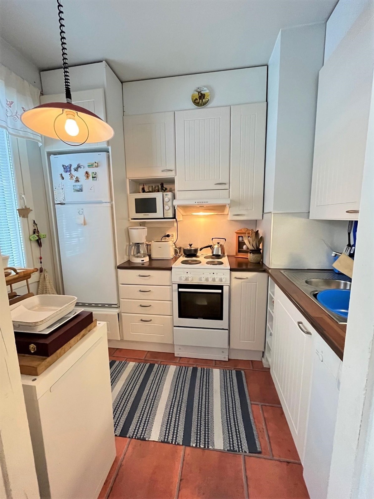 - Jenkkikaappi, sähköliesi, mikroaaltouuni, astianpesukone, kaapistot, kiinteät valaisimet.