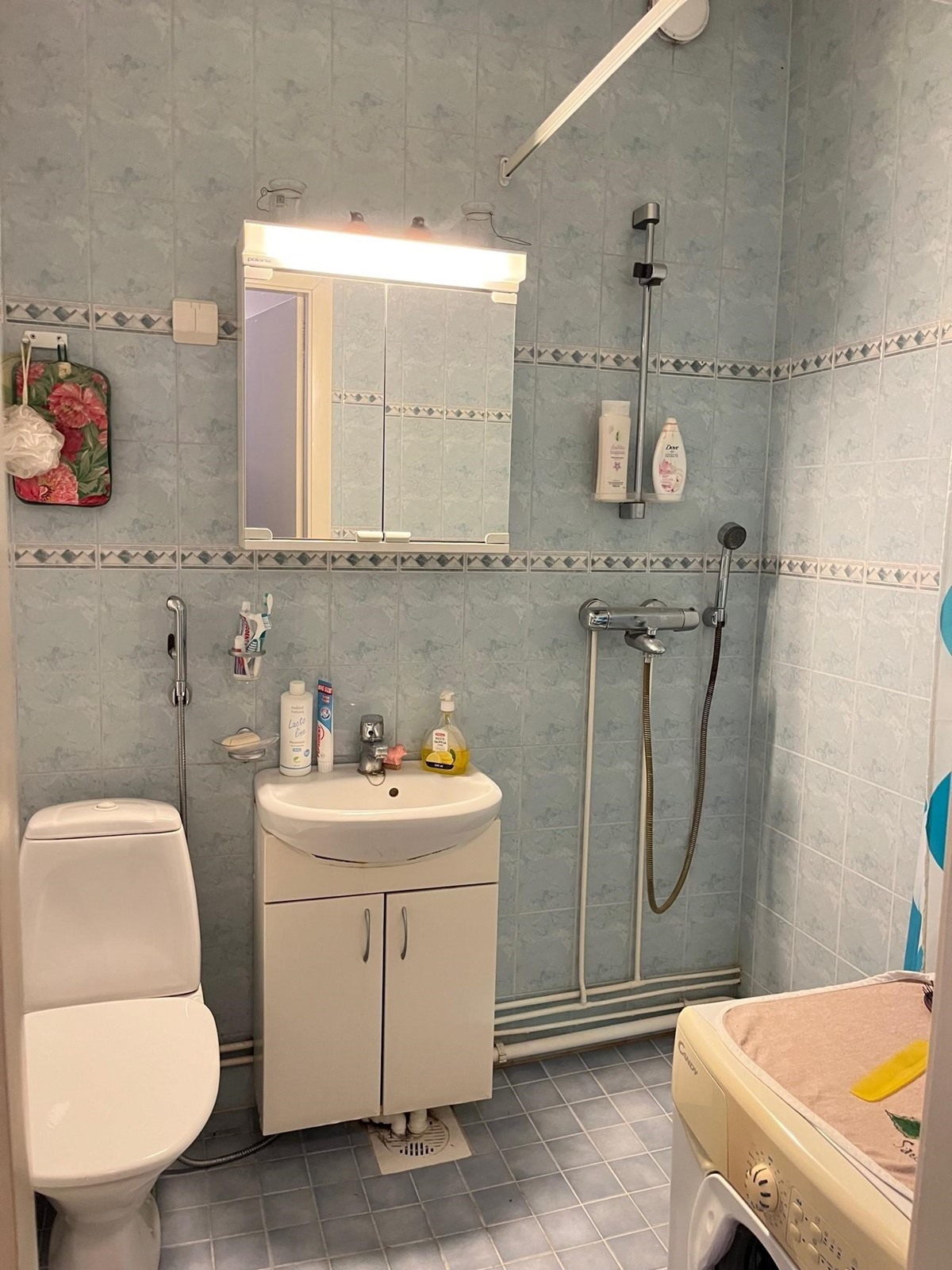 - Kylpyhuone, suihku, peilikaappi, allaskaappi, pesukoneliitäntä, kiinteät valaisimet.
