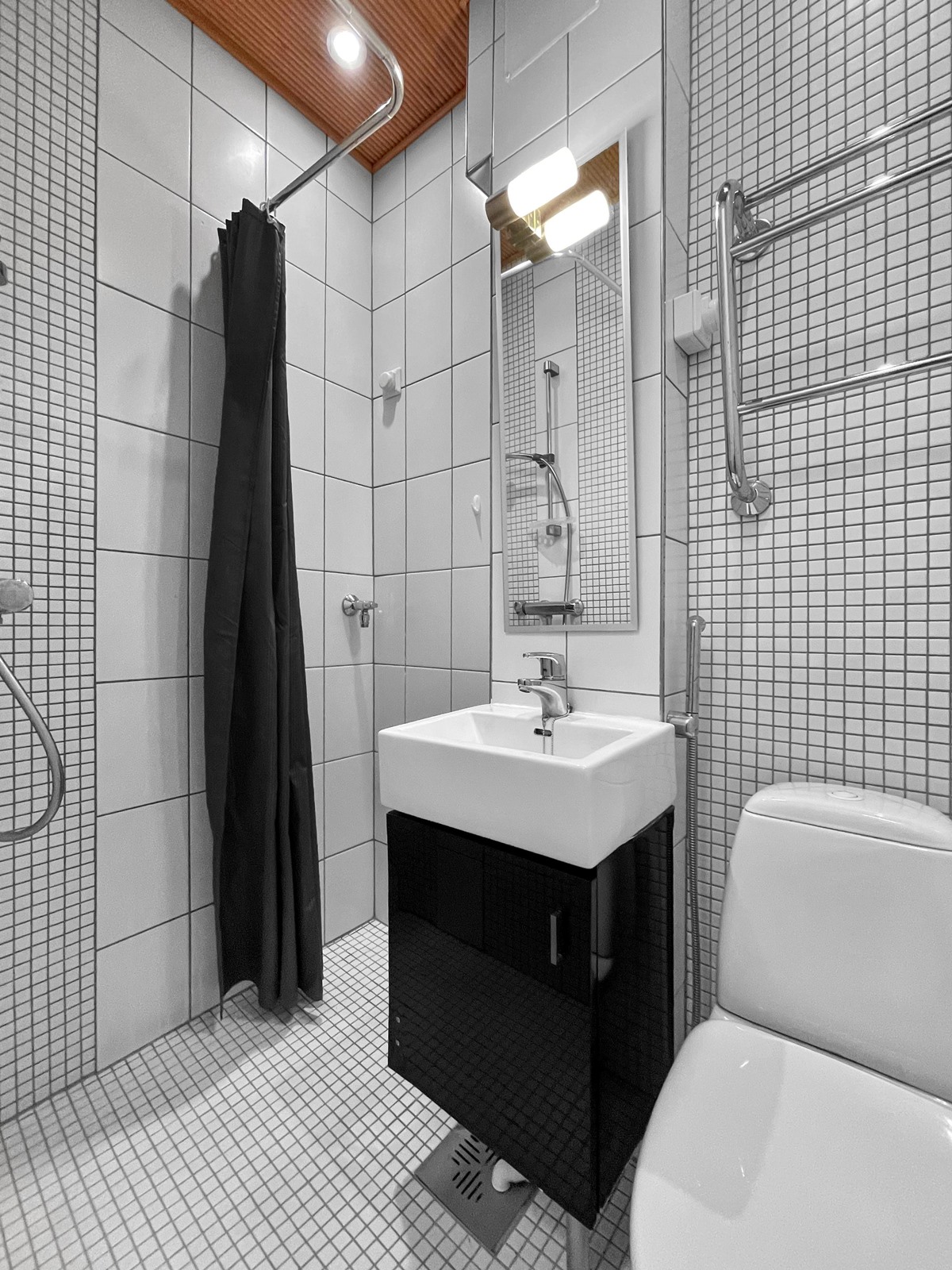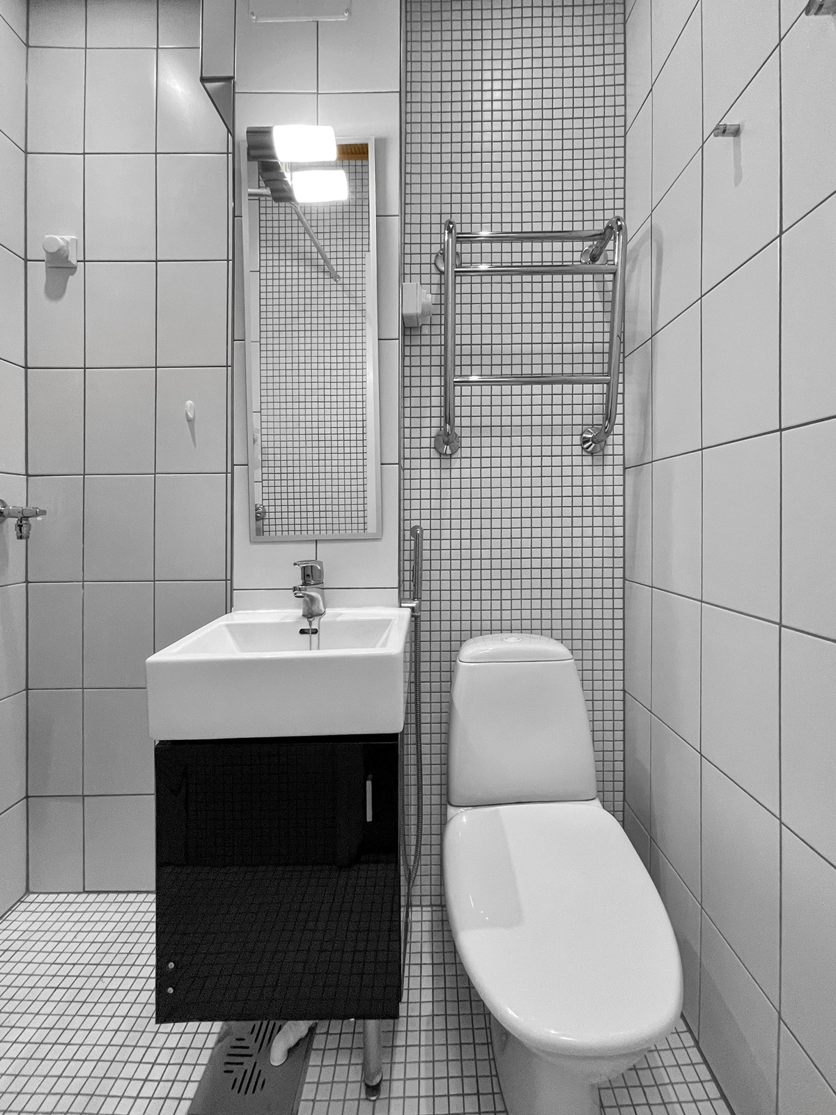 - Kylpyhuone, suihku, peilit, allaskaappi, pesukoneliitäntä, lattialämmitys, kiinteät valaisimet.