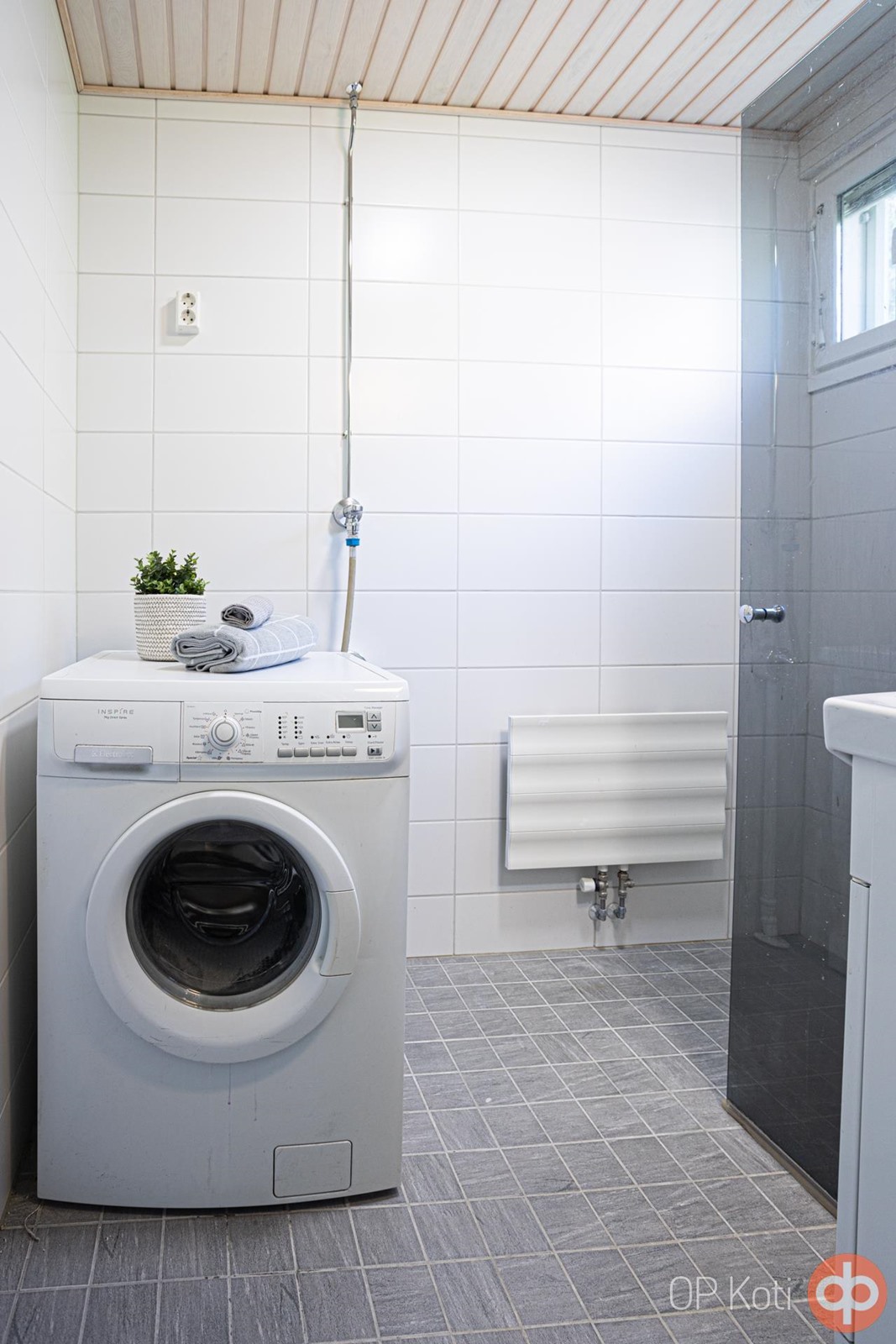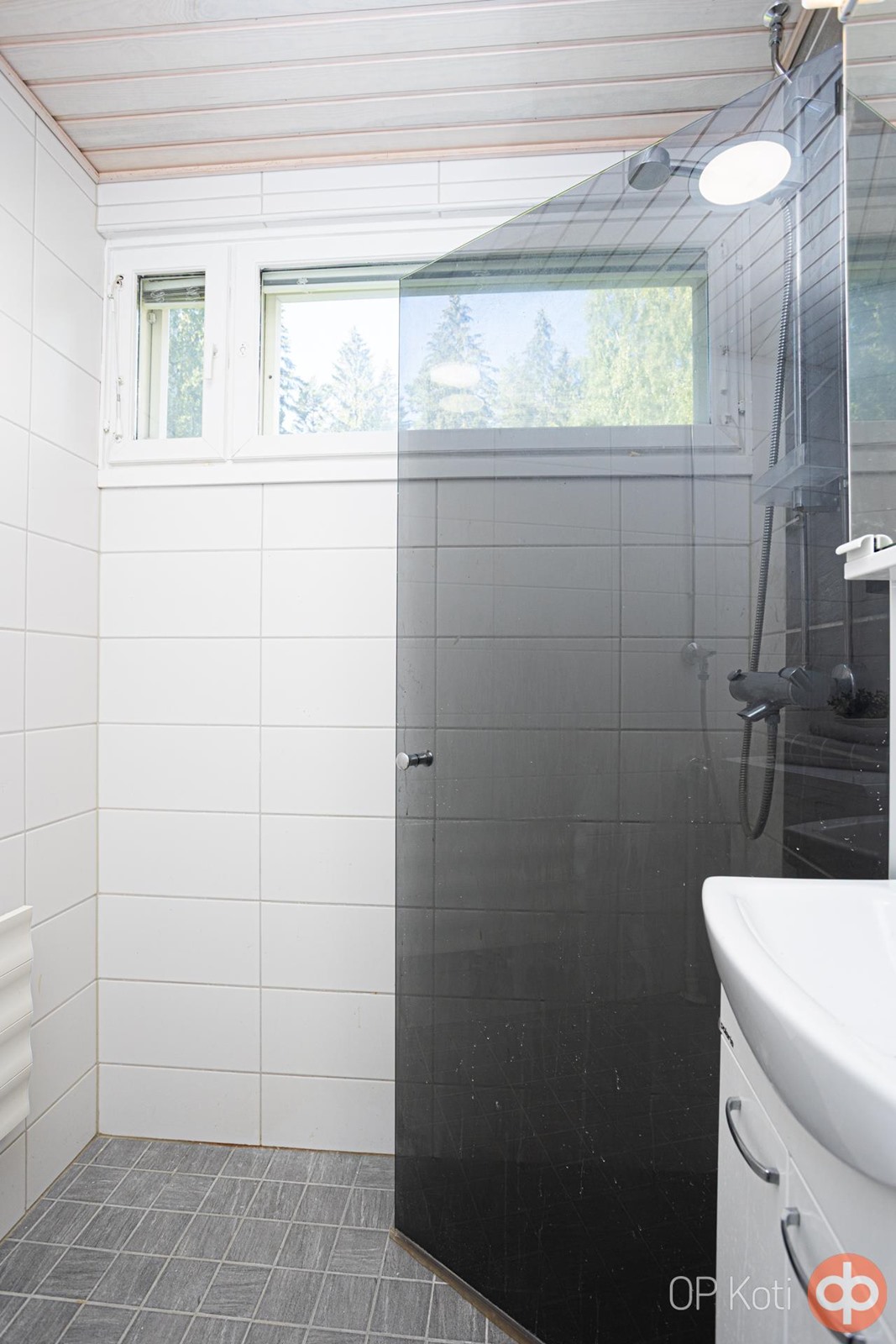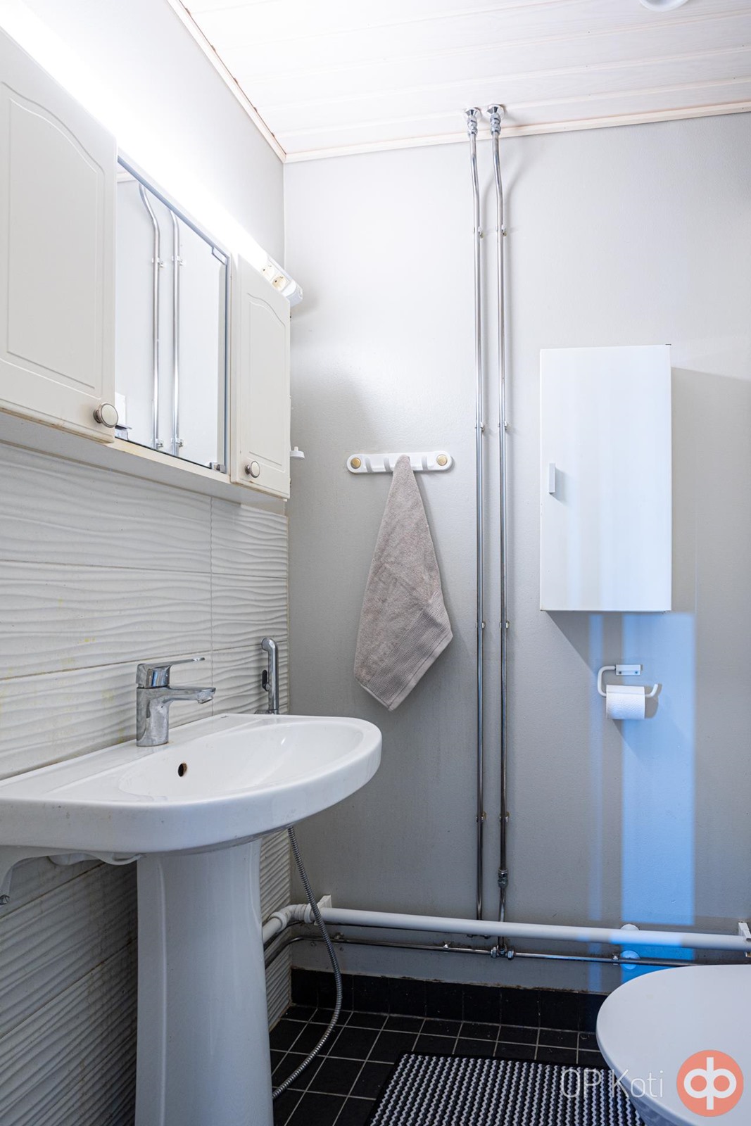 - Kylpyhuone, erillinen wc, suihku, suihkuseinä Kääntyvä, peilikaappi, allaskaappi, pesukoneliitäntä, lattialämmitys Kylpuhuone, kiinteät valaisimet.