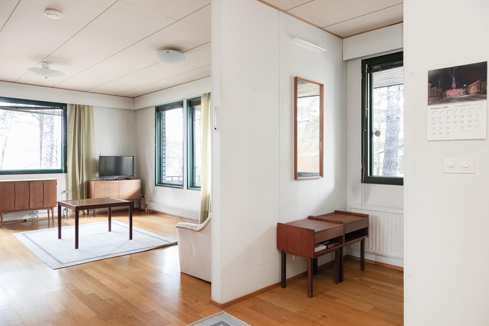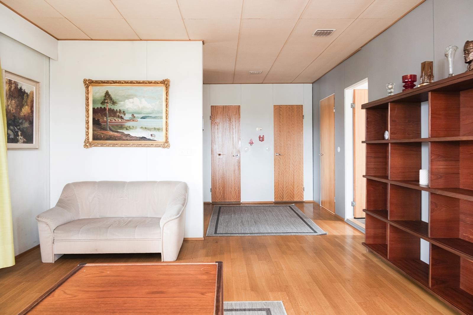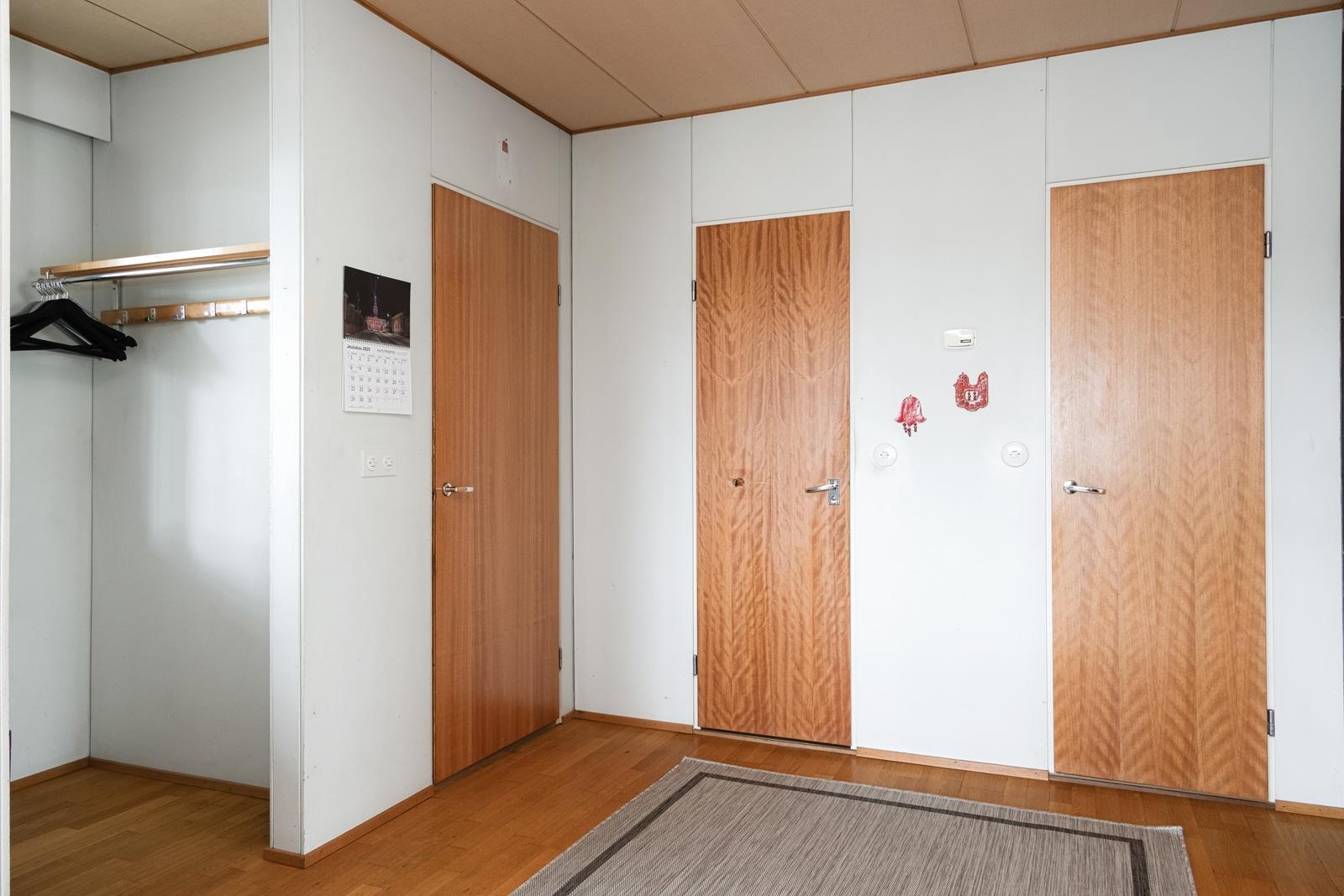 Keittiö: Laminaattilattia,seinät on maalattu,välitilassa laatta.. Olohuone: Parkettilattia,sienät on maalattu. Makuuhuone 1: Parkettilattia,seinät on maalattu.. Makuuhuone 2: Parkettilattia,seinät on maalattu.. Kodinhoitohuone: Lattiassa on muovimatto,seinät ovat tapettia.. Sauna: Sauna on paneloitu. Kylpyhuone: Lattiassa on muovimatto,seinät ovat tapettia.. Eteinen: Parkettilattia,seinät on maalattu.. Wc: Muovimatto lattiassa,senät ovat muovitapettia..