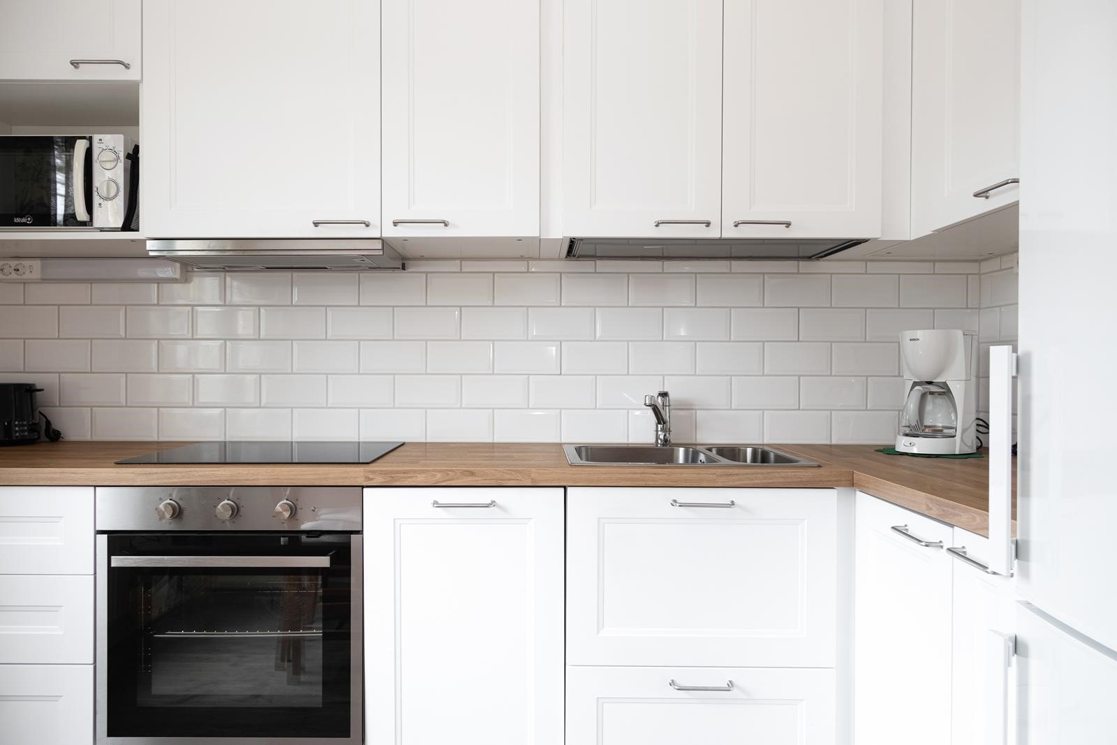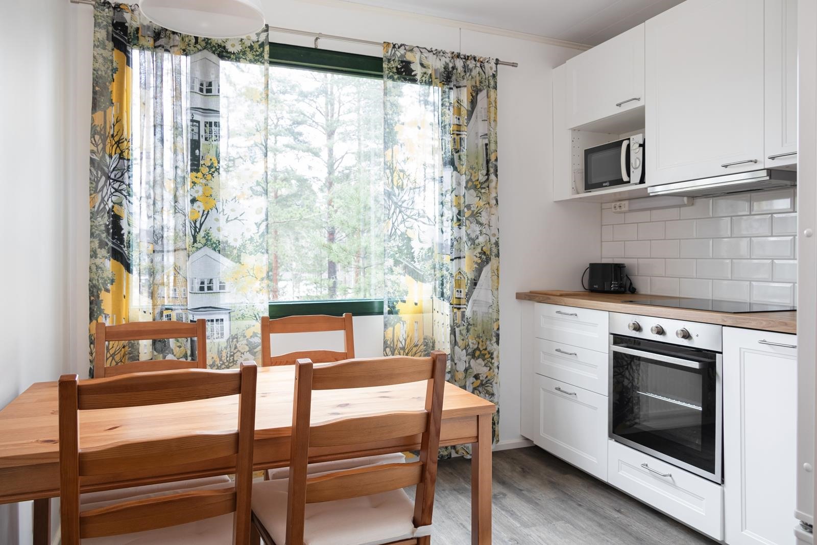 - Jääkaappi, jääkaappipakastin, erillisuuni, induktioliesi, liesituuletin, mikroaaltouuni, astianpesukone, kiinteät valaisimet.