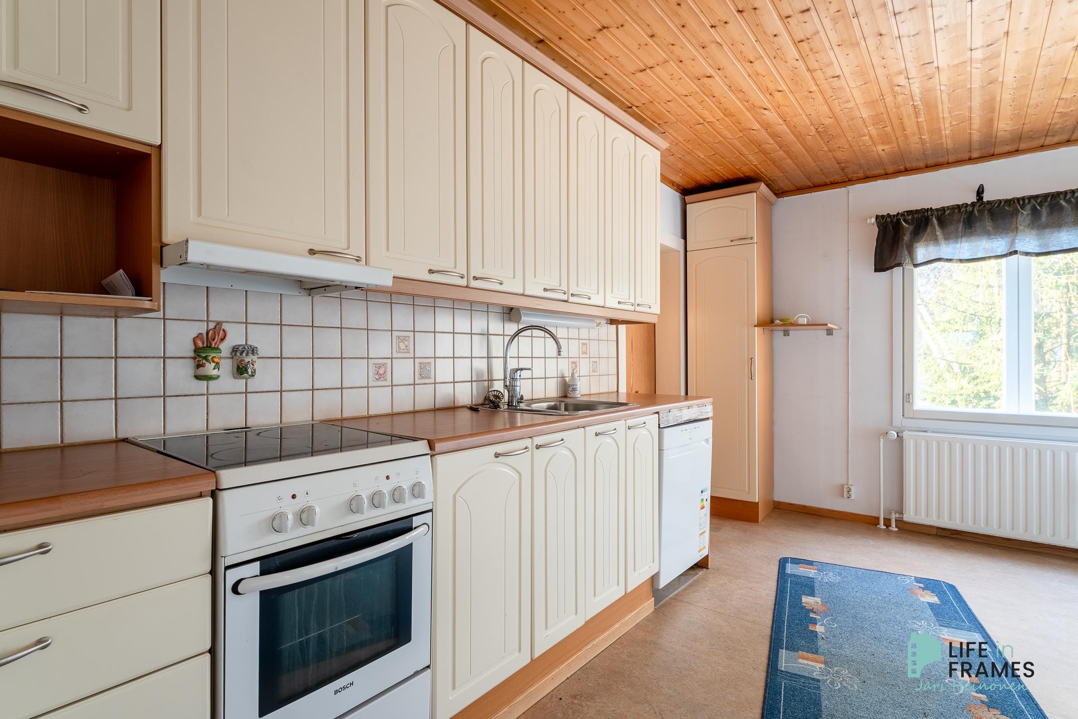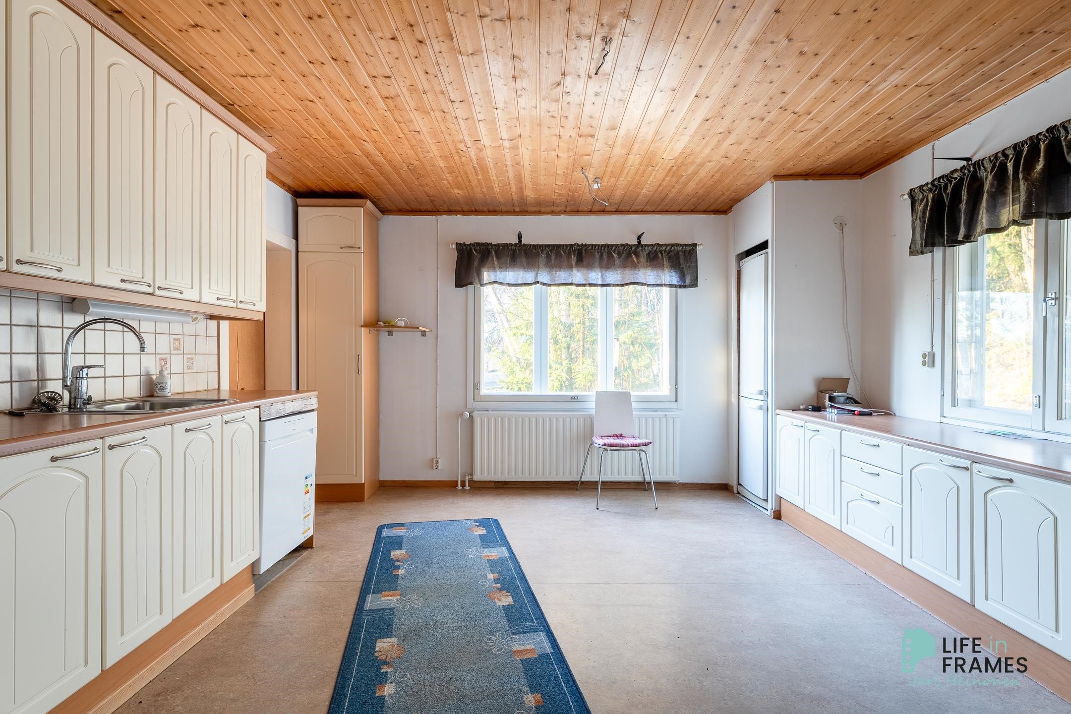 - Jääkaappipakastin, lattialiesi, sähköliesi, liesikupu, astianpesukone, kaapistot, kiinteät valaisimet.
