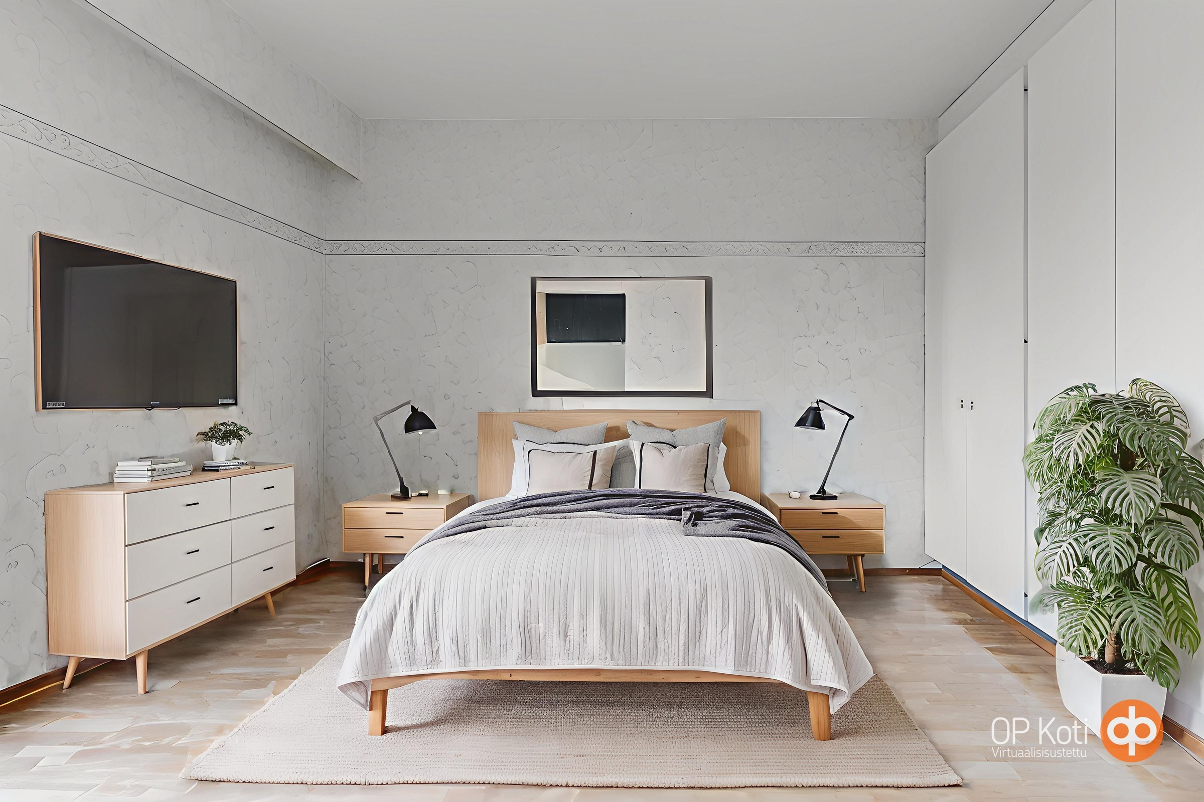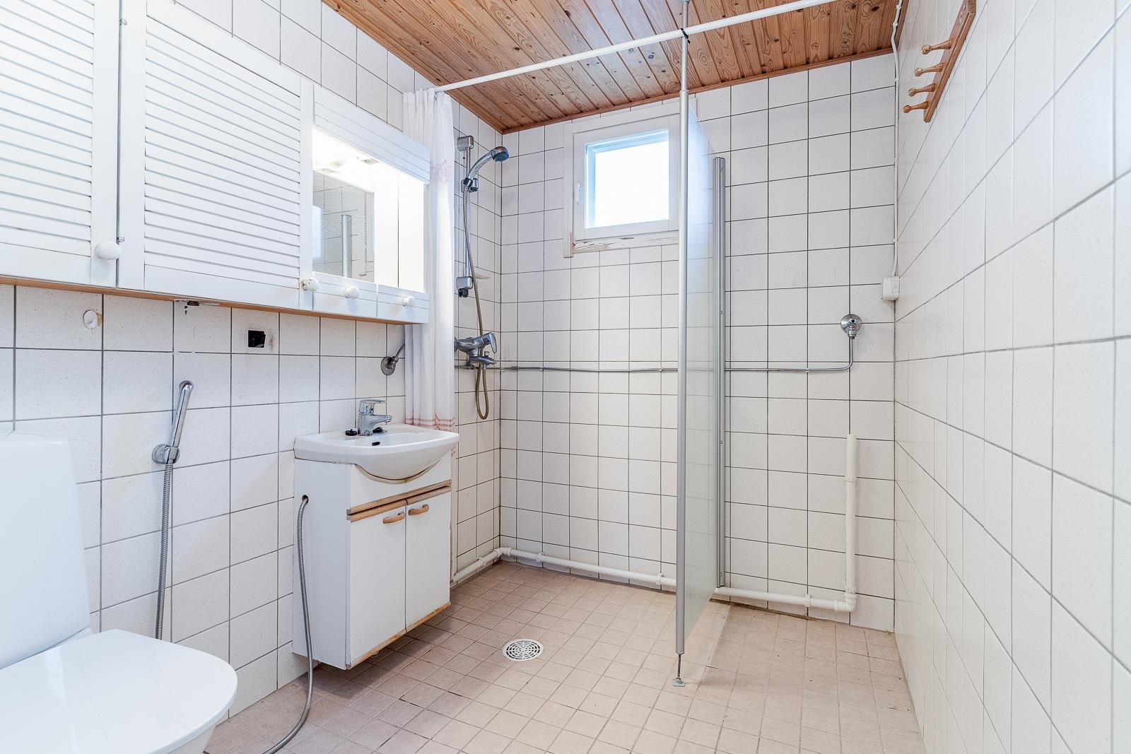 - Kylpyhuone: suihku, suihkuseinä, peilit, allaskaappi, pesukoneliitäntä, wc-istuin, kiinteät valaisimet.