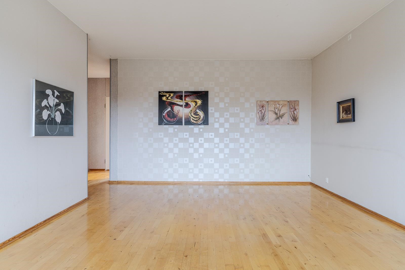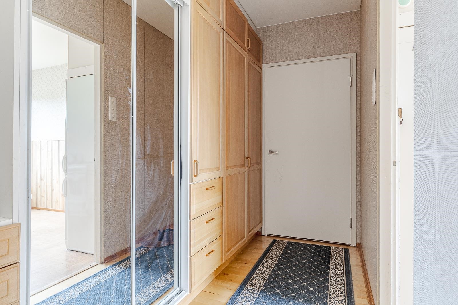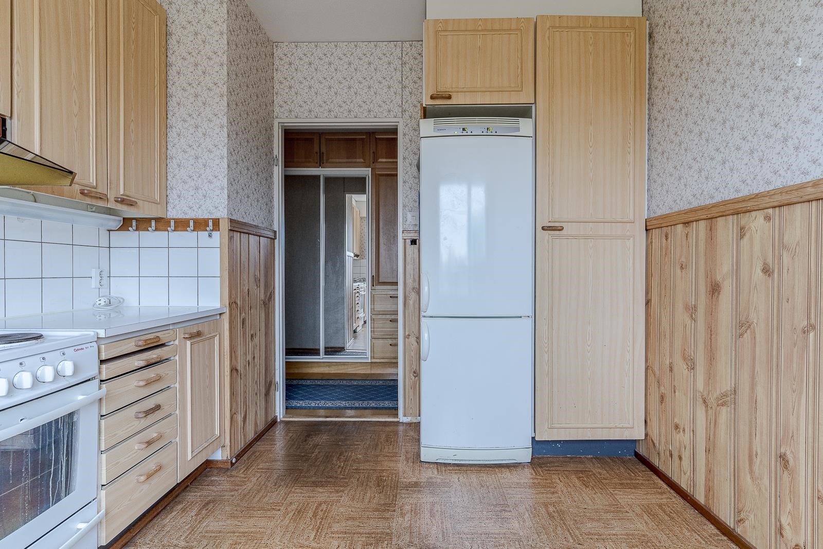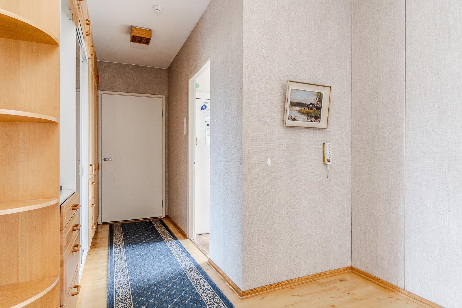 Keittiö: muovimatto/puolipaneeli ja tapetti. Olohuone: parketti/tapetti. Makuuhuone 1: muovimatto/tapetti. Kylpyhuone: laatta/laatta. Eteinen: parketti/kangastapetti.