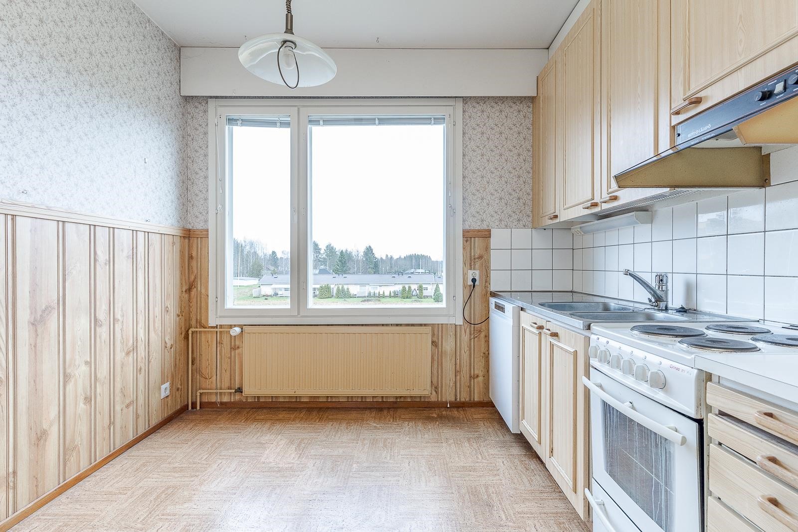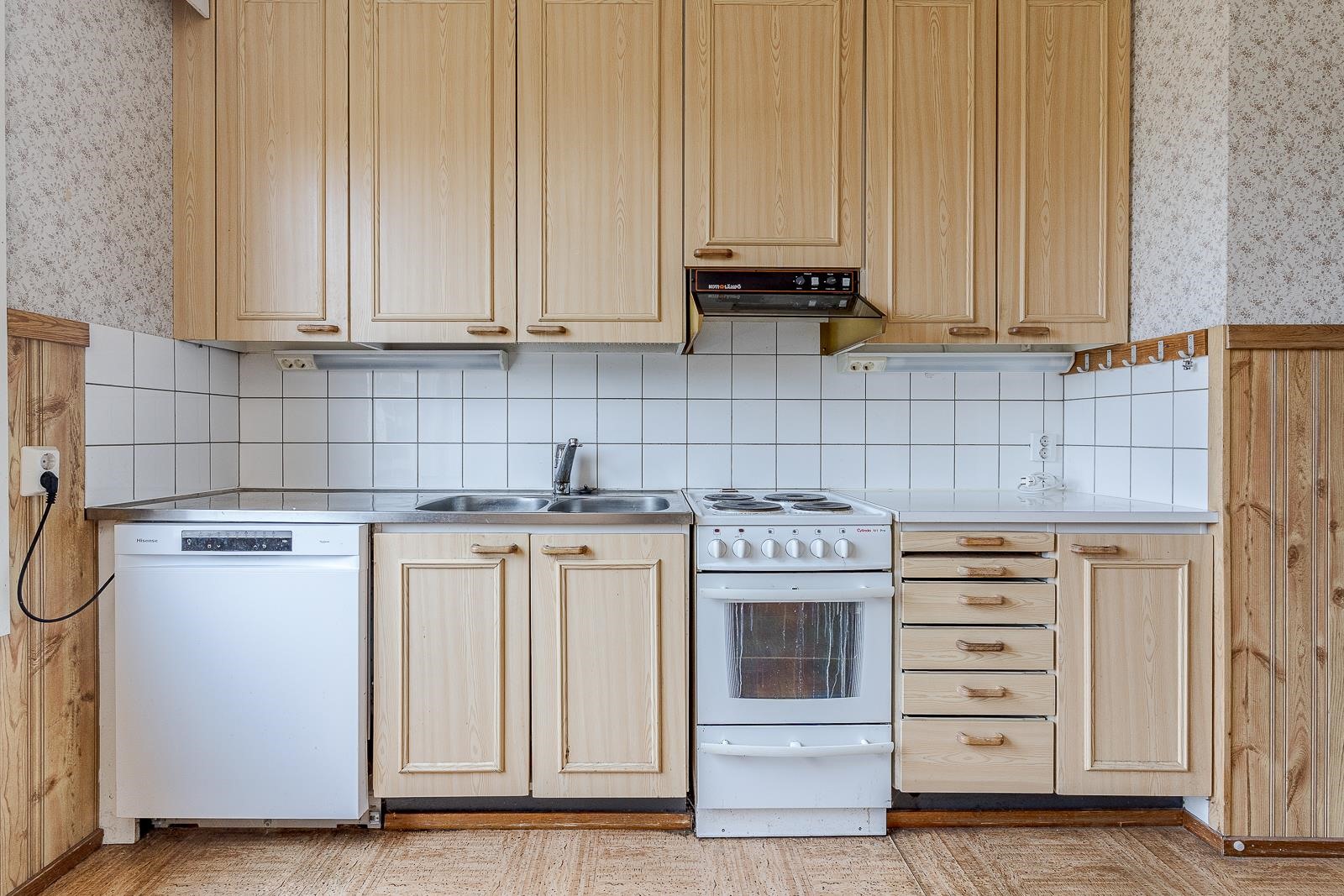 - Jääkaappipakastin, sähköliesi, liesituuletin aktiivihiili, astianpesukone, kaapistot, kiinteät valaisimet.