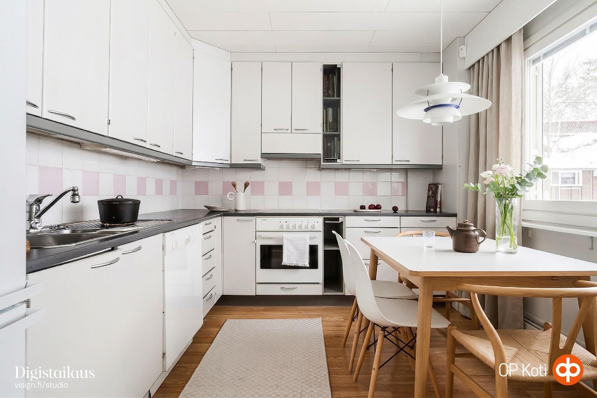 - Jääkaappipakastin, erillisuuni, keraaminen liesi, liesikupu, astianpesukone, irralliset kaapistot, kiinteät valaisimet.