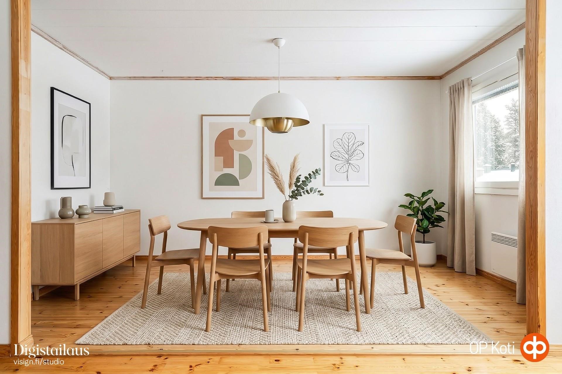 Asunnon pohjaratkaisu on avara ja kodikas. Olohuoneen ja ruokailutilan yhdistelmä luo kauniin ja yhtenäisen tilan, jossa on helppo viihtyä niin arjessa kuin juhlassakin. Suuret ikkunat tuovat sisään runsaasti luonnonvaloa ja avaavat näkymät rauhalliselle pihalle.