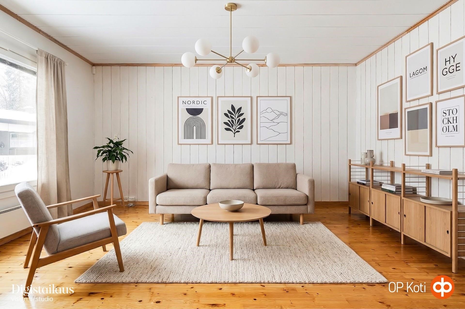Kodin yleisilme on lämmin ja kutsuva, ja tilat tarjoavat erinomaiset puitteet monenlaisiin elämäntilanteisiin. Olohuoneen ja ruokailutilan välinen seinä on purettu tilan avartamiseksi, mutta tarpeen vaatiessa ruokailutilasta saa yhden makuuhuoneen lisää.