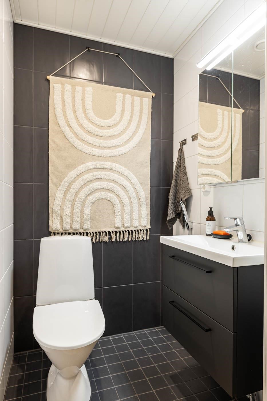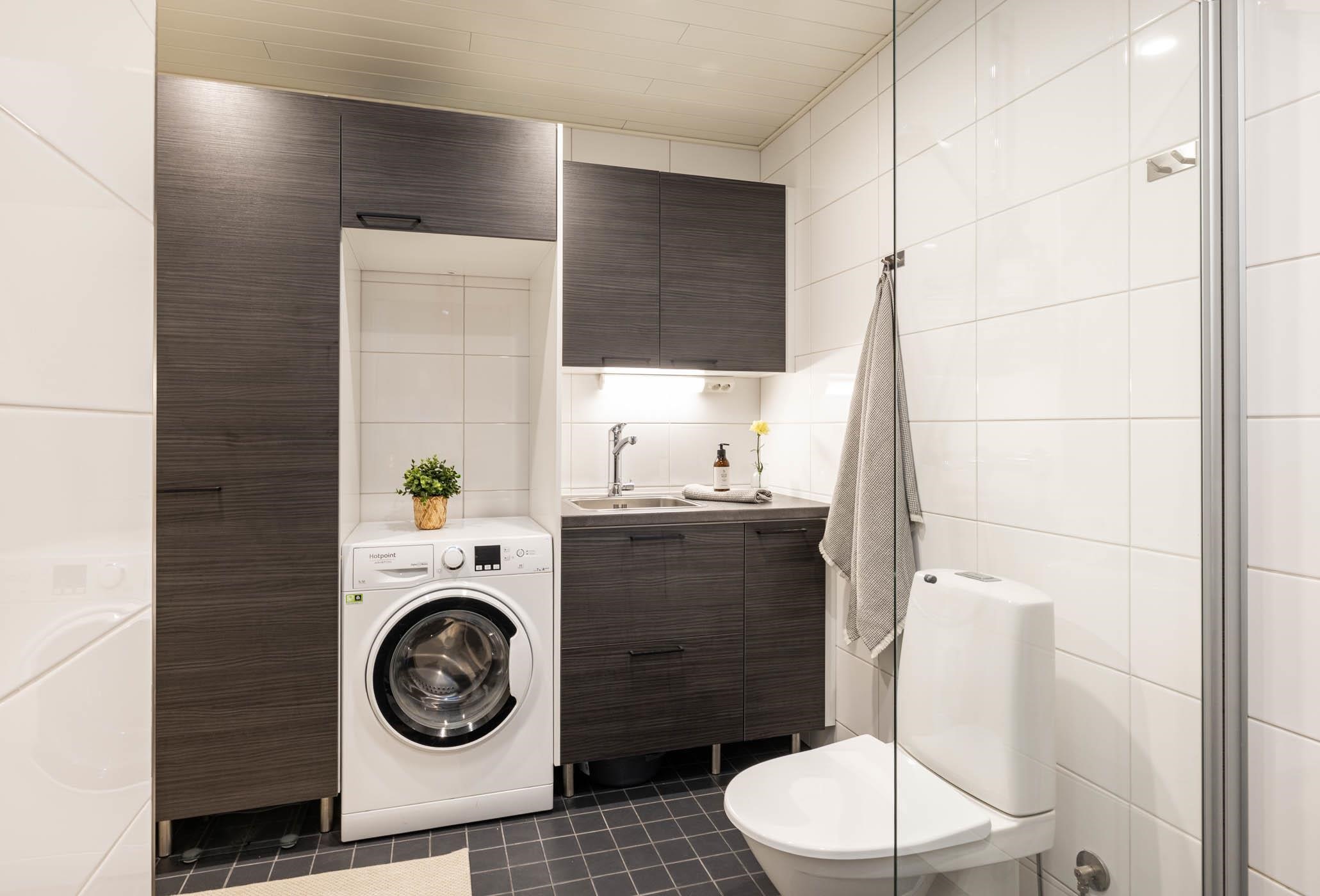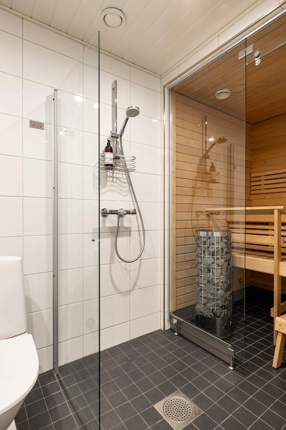 - Erillisessä wc:ssä on peilikaappi ja allaskaappi. Kylpyhuoneessa on reilusti säilytystilaa, allas, pesukoneliitännät, toinen wc, suihku suihkuseinällä sekä lasiseinäinen sauna, jossa on pylväskiuas.