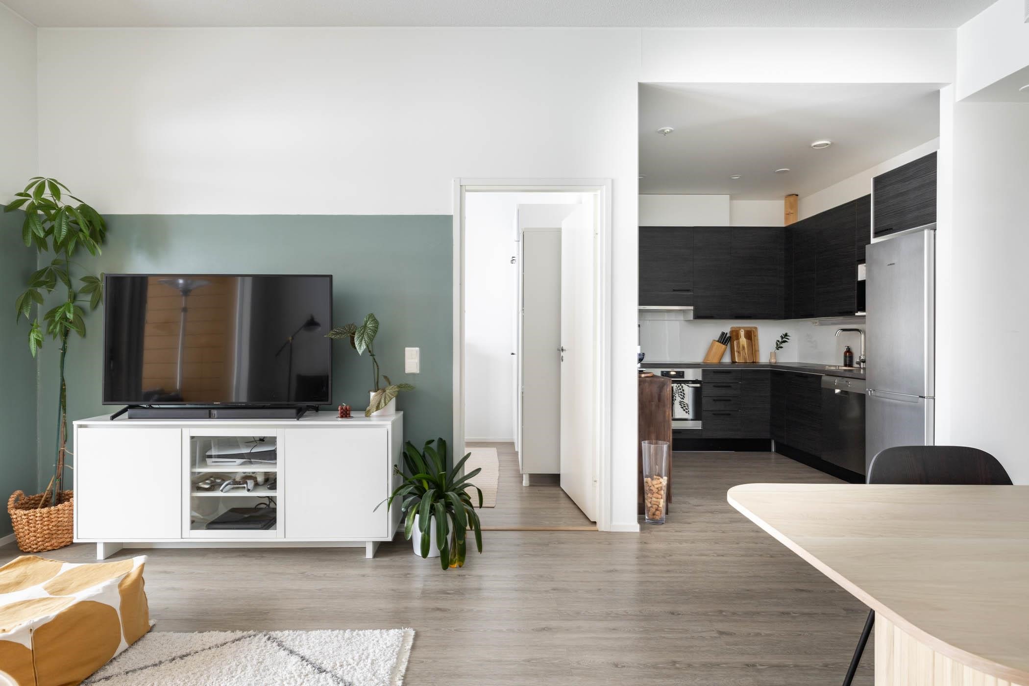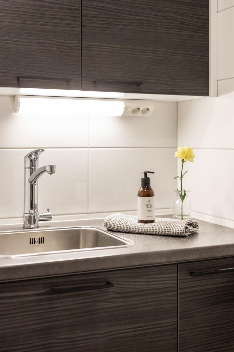 - Keittiössä on varusteina jääkaappipakastin, erillisuuni (kiertoilmauuni) AEG, induktioliesi AEG, liesituuletin aktiivihiilisuodattimella, astianpesukone, kaapistot ja, kiinteät valaisimet. Keittiön välitila- ja taso laminaattia.